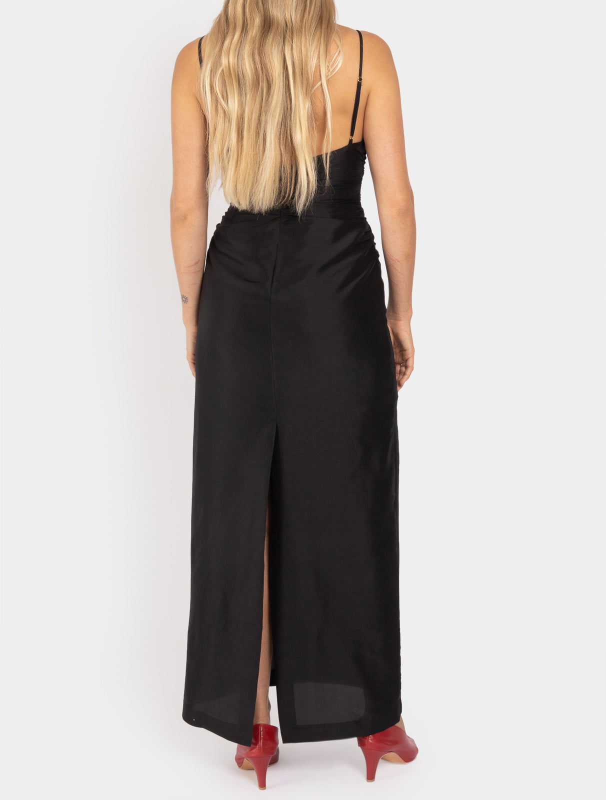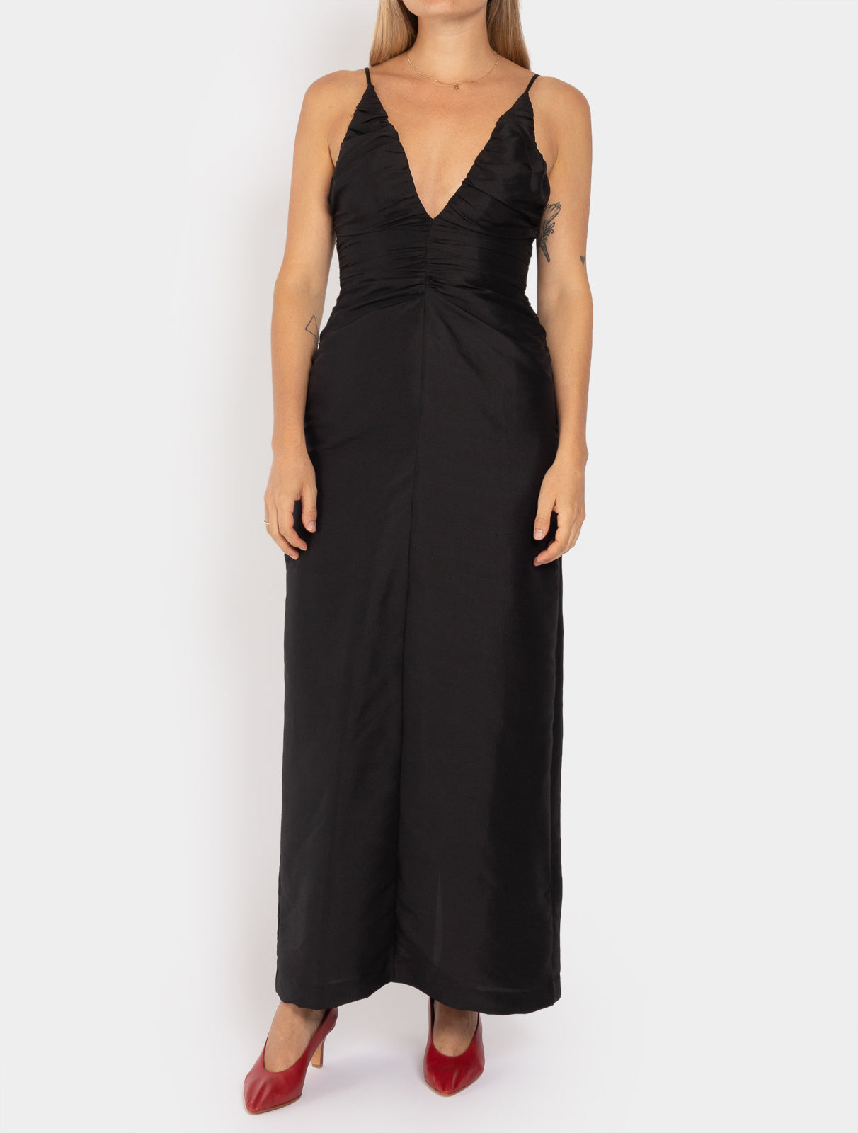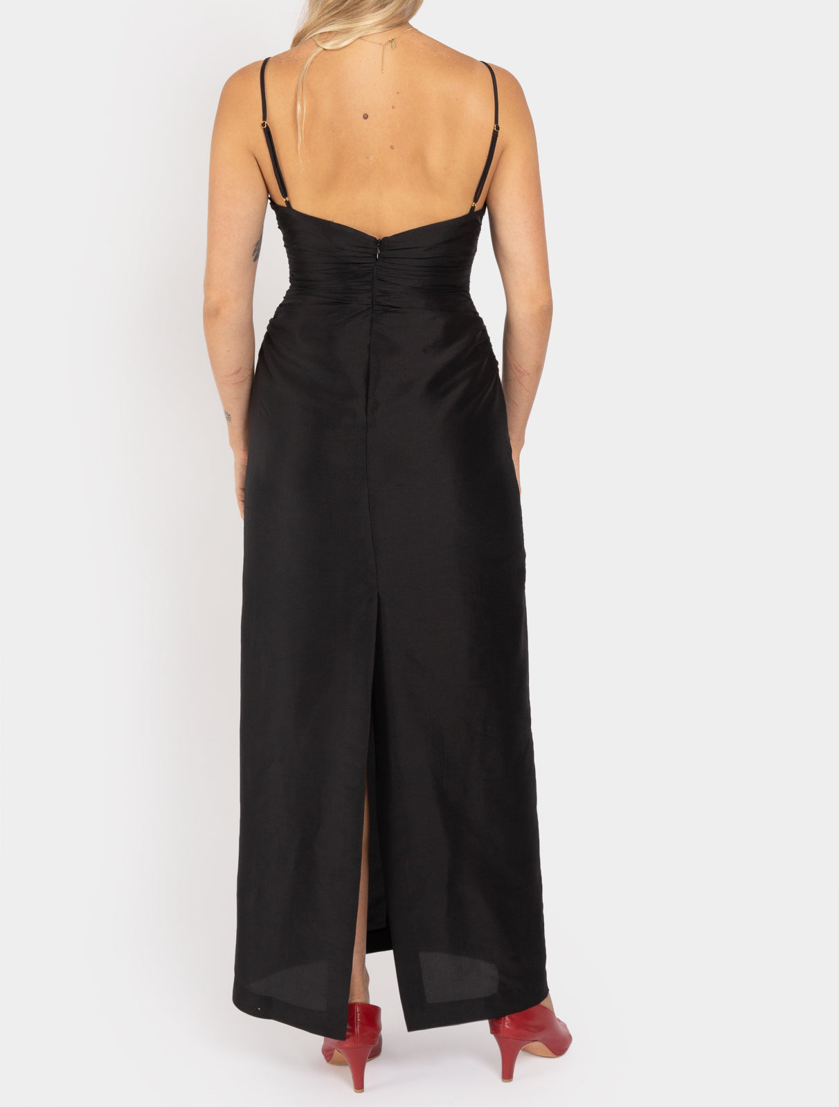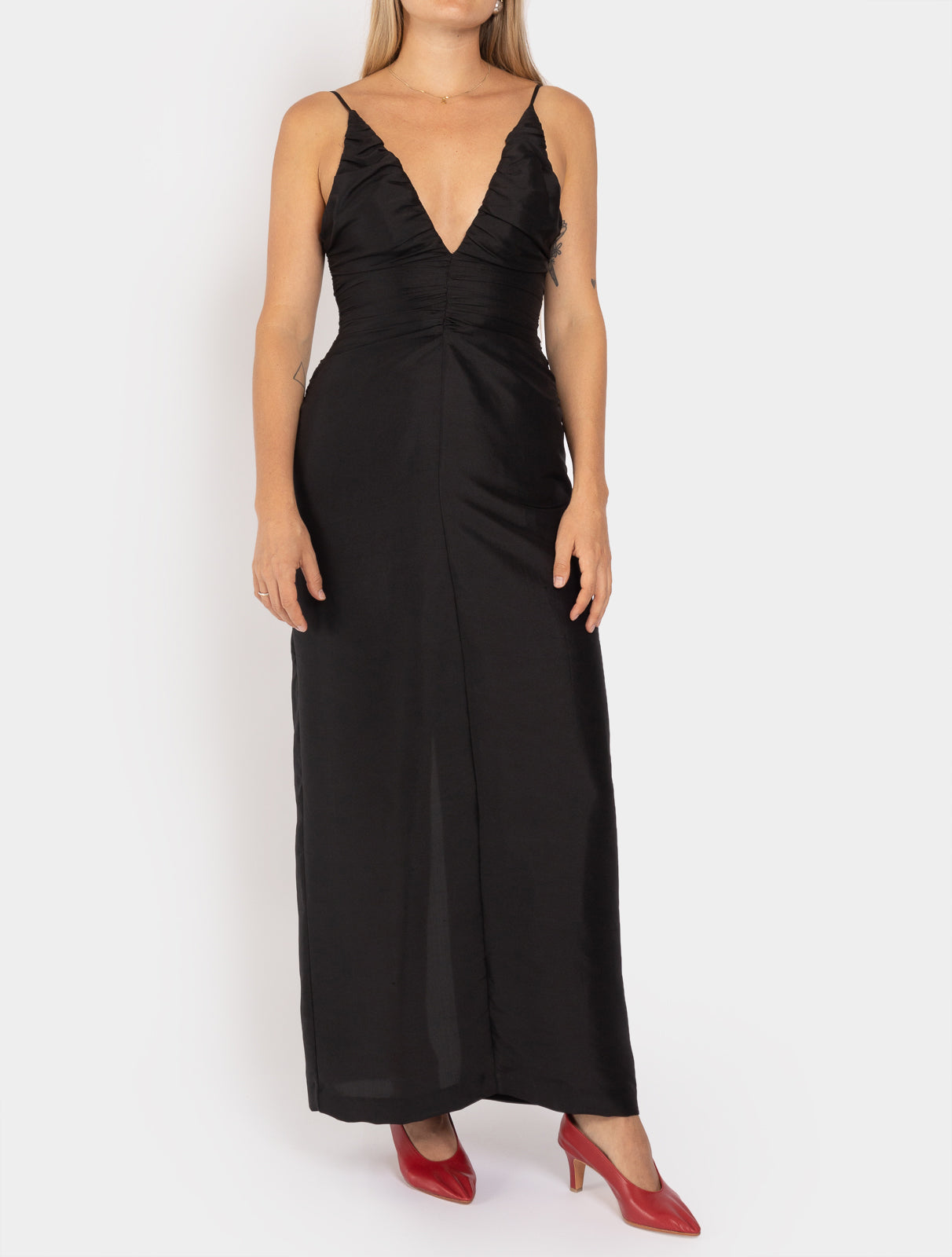 Wynn Hamlyn maxi dress in dupion silk fabric, featuring a close-fit design, deep v-neck and back, gathered long neckline, front seam and side seams for ruched effect, adjustable shoestring straps, dress secured with invisible zip back.