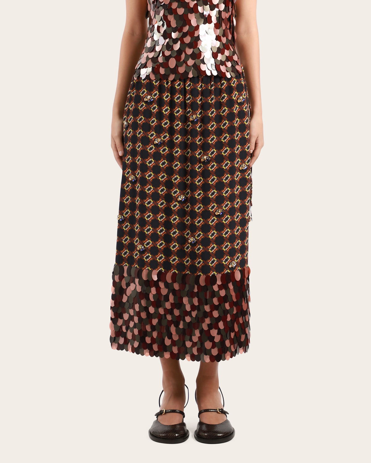 A blend of utility and elegance, this fluid long skirt features intricate embellishments and light catching plastic discs at the hem. The drawstring waist and clean silhouette balance the ornate details, making it easy to style, from minimal blouses to sharp tailoring.