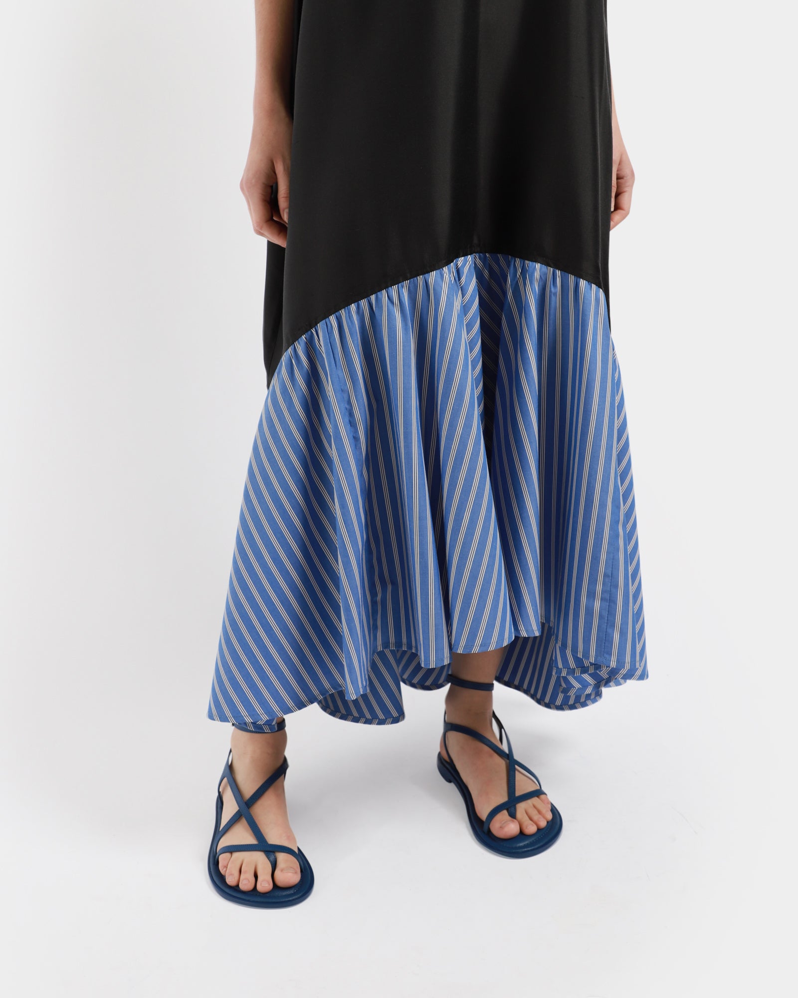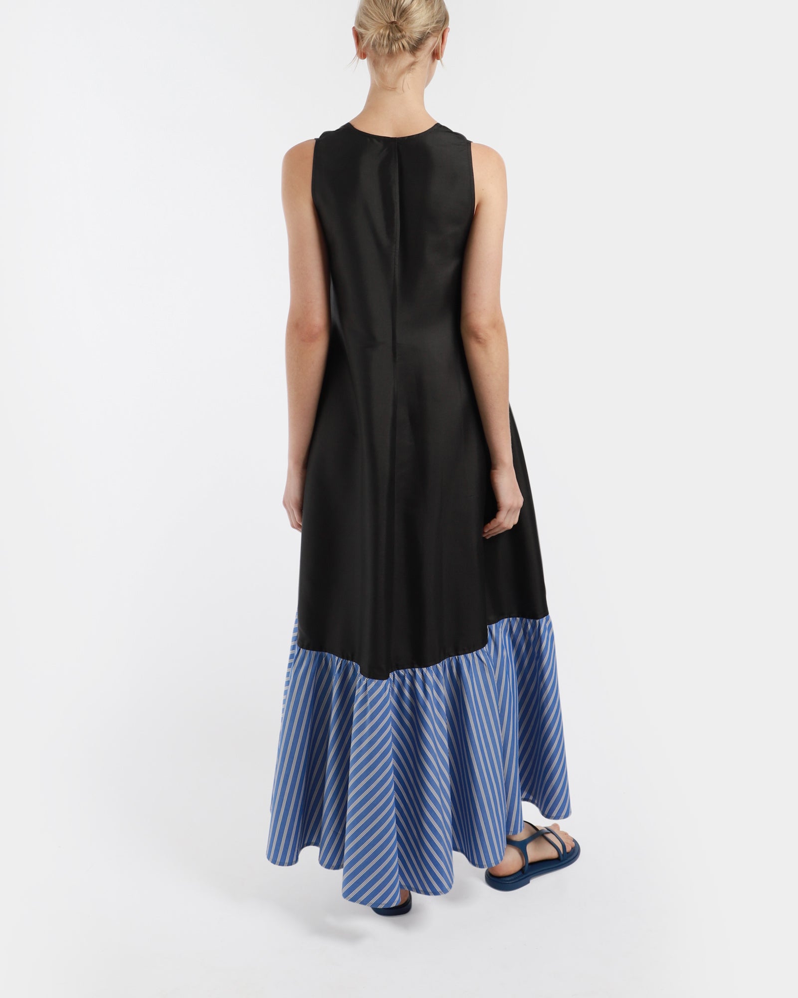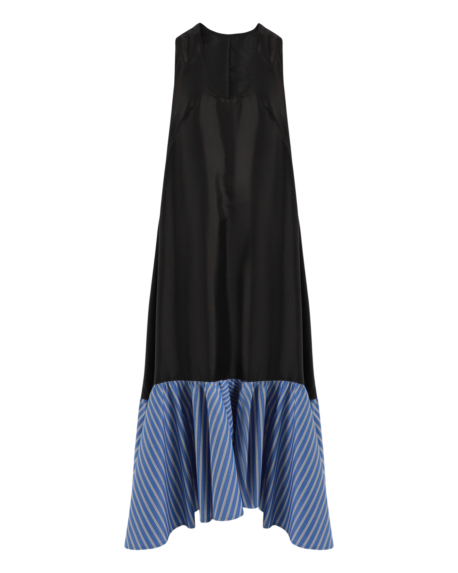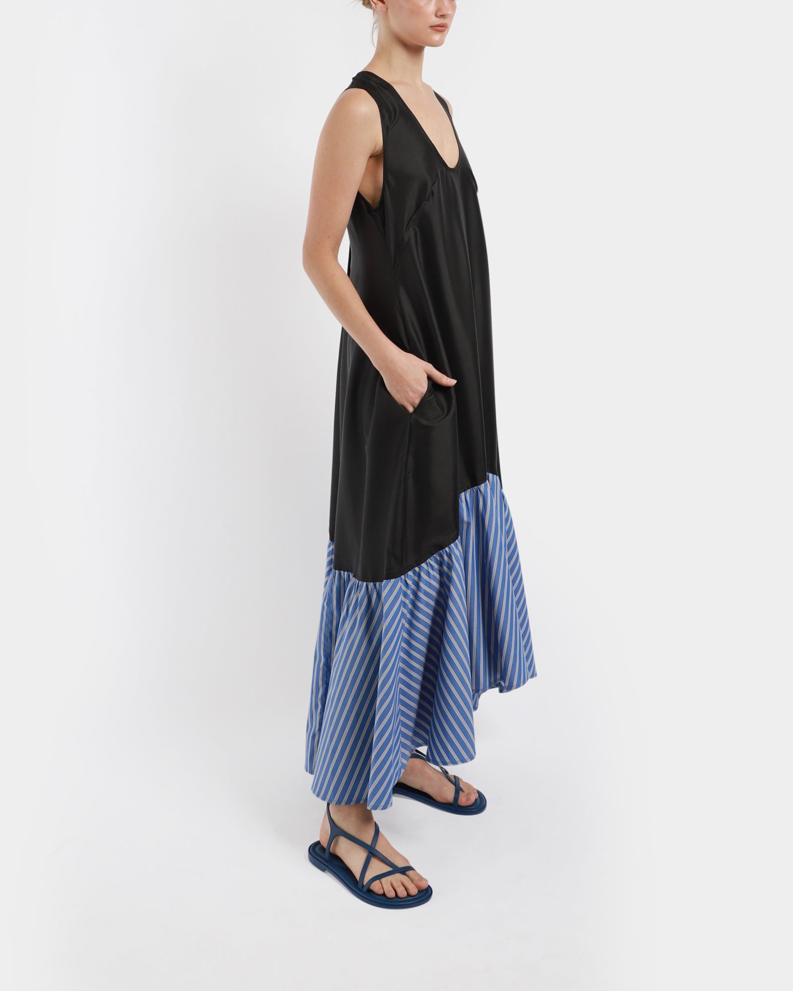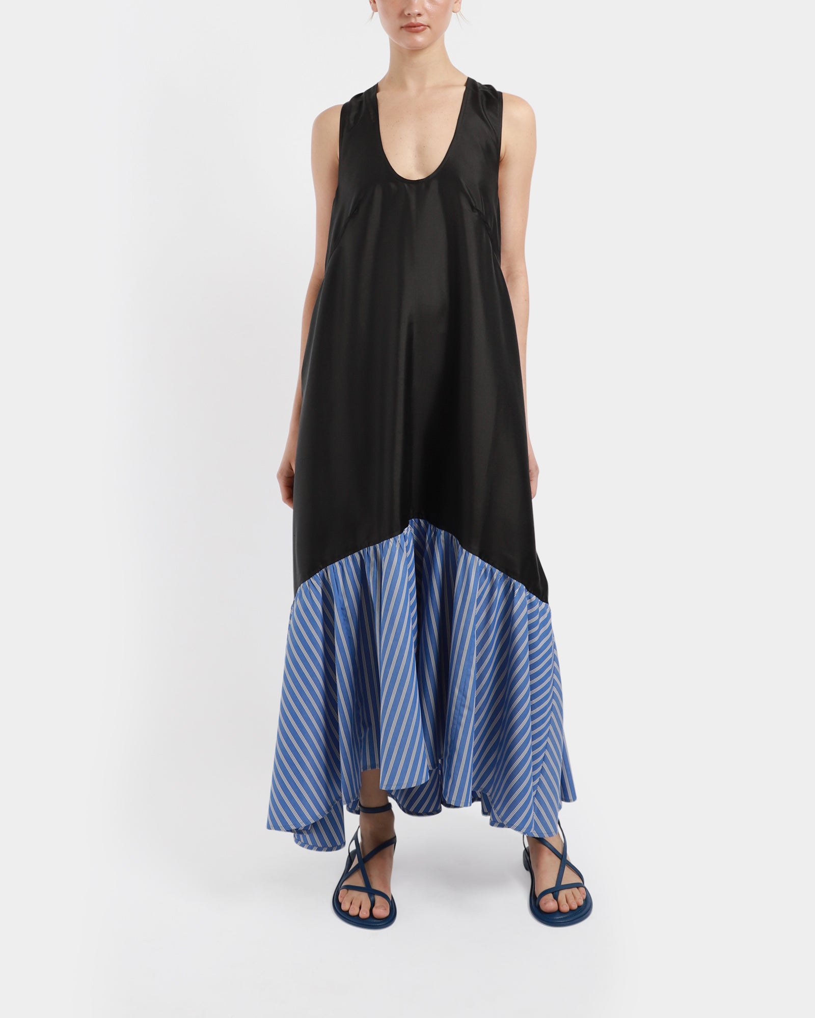 The Lyon Dress is crafted from a silk-cotton blend and features a sleeveless design with a deep U-neckline. It has a single ruffle at the high/low hem, and dart detailing at the outer bust.