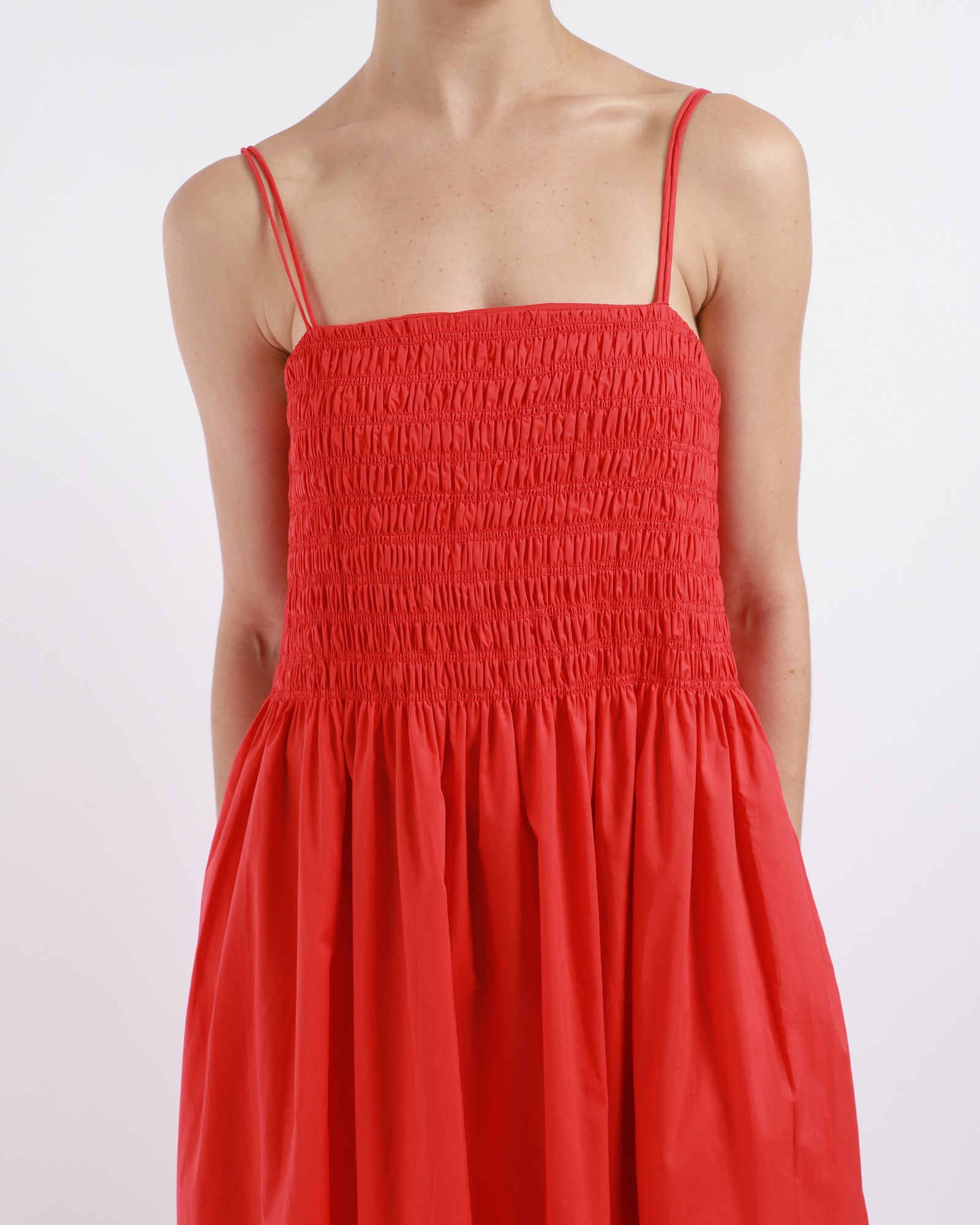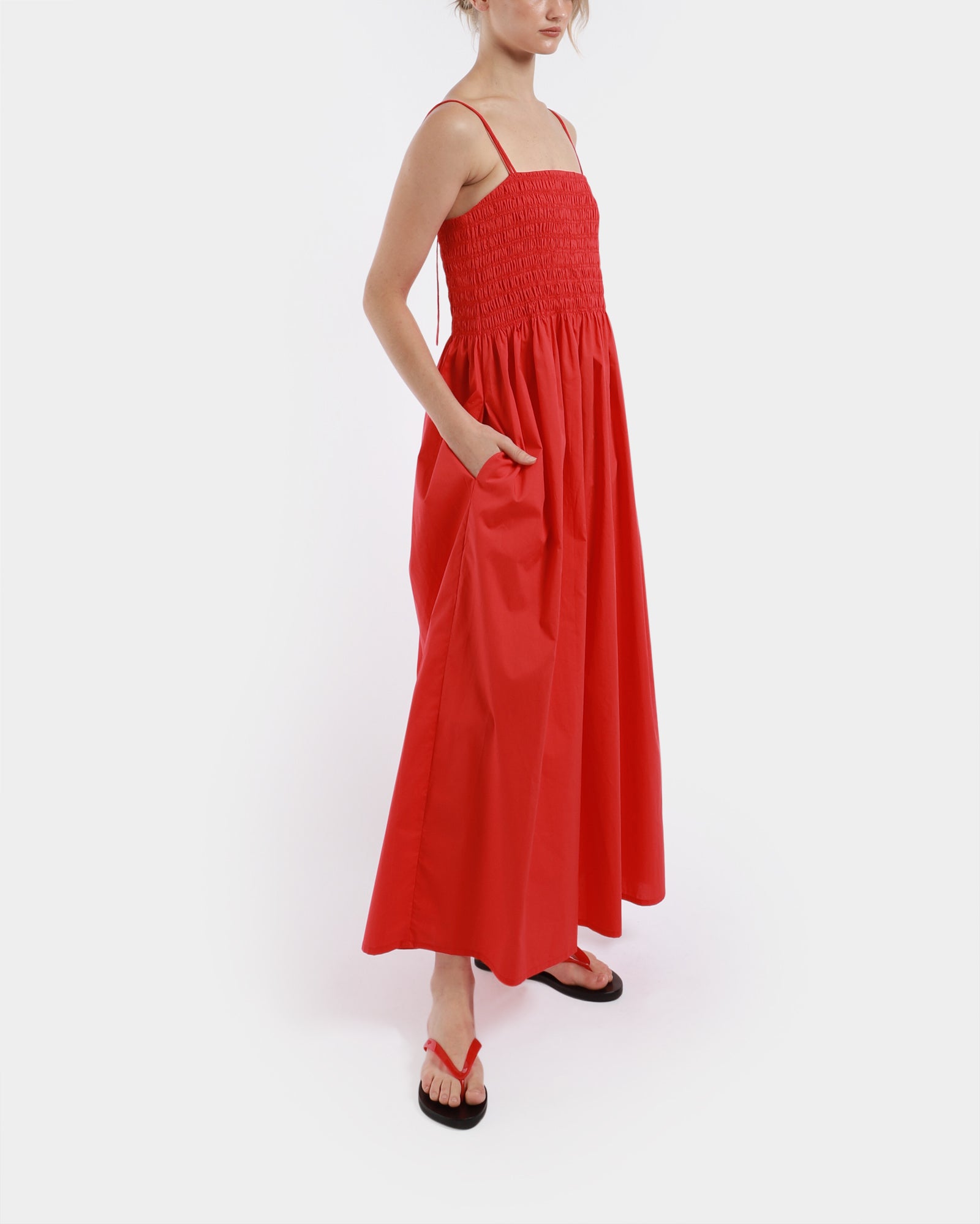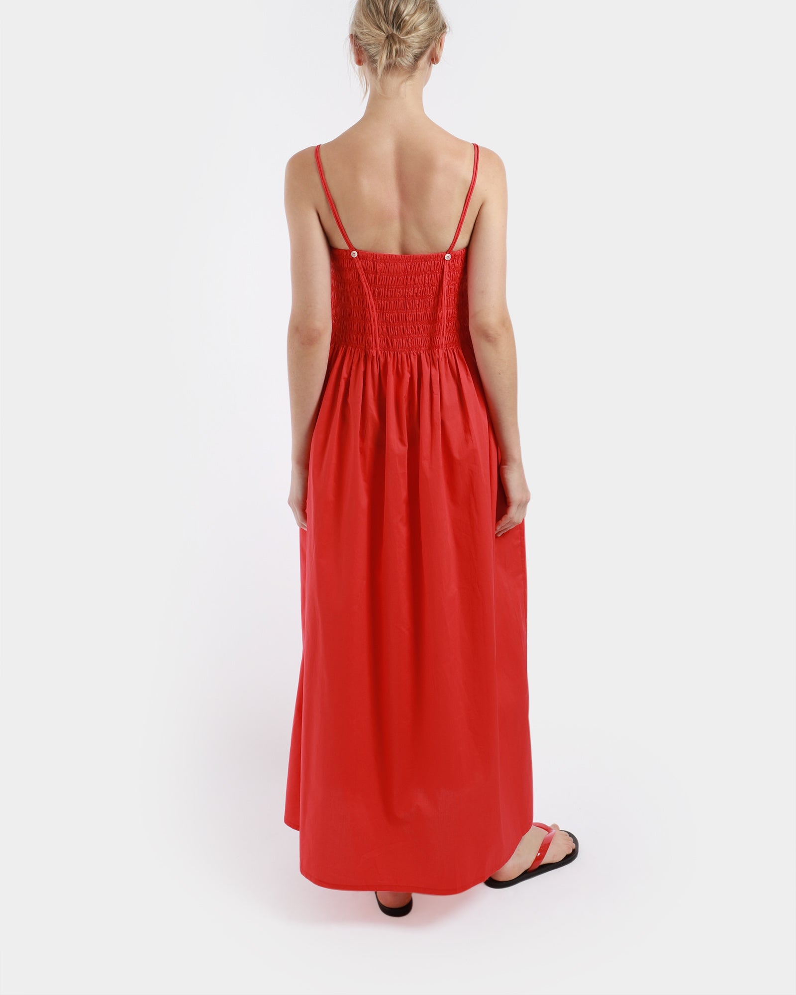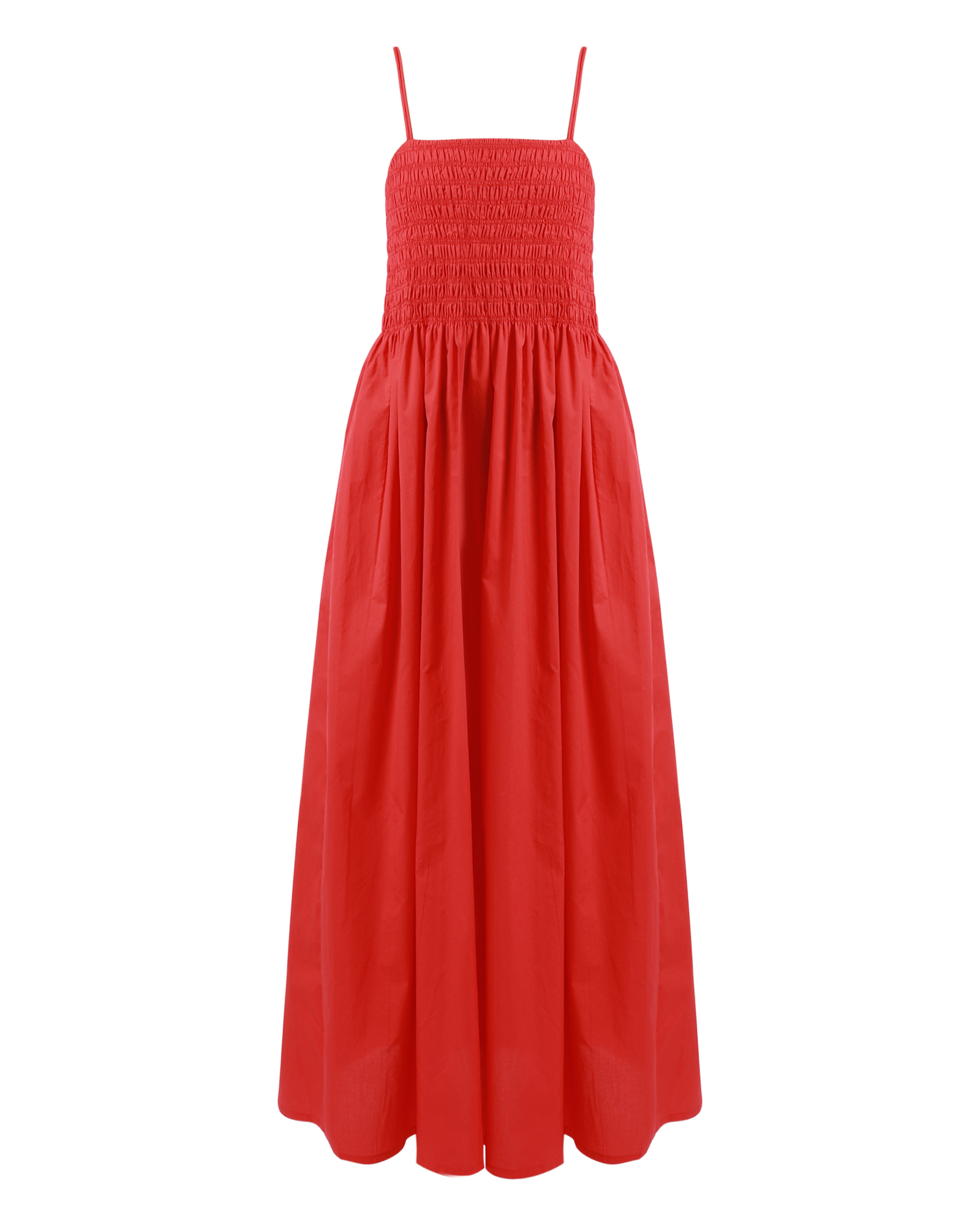 The Liv Dress is made from crisp cotton poplin, featuring a minimalist silhouette with a ruched bodice and adjustable straps. Thoughtfully designed, it includes side-seam pockets and a concealed side zip for a seamless finish.