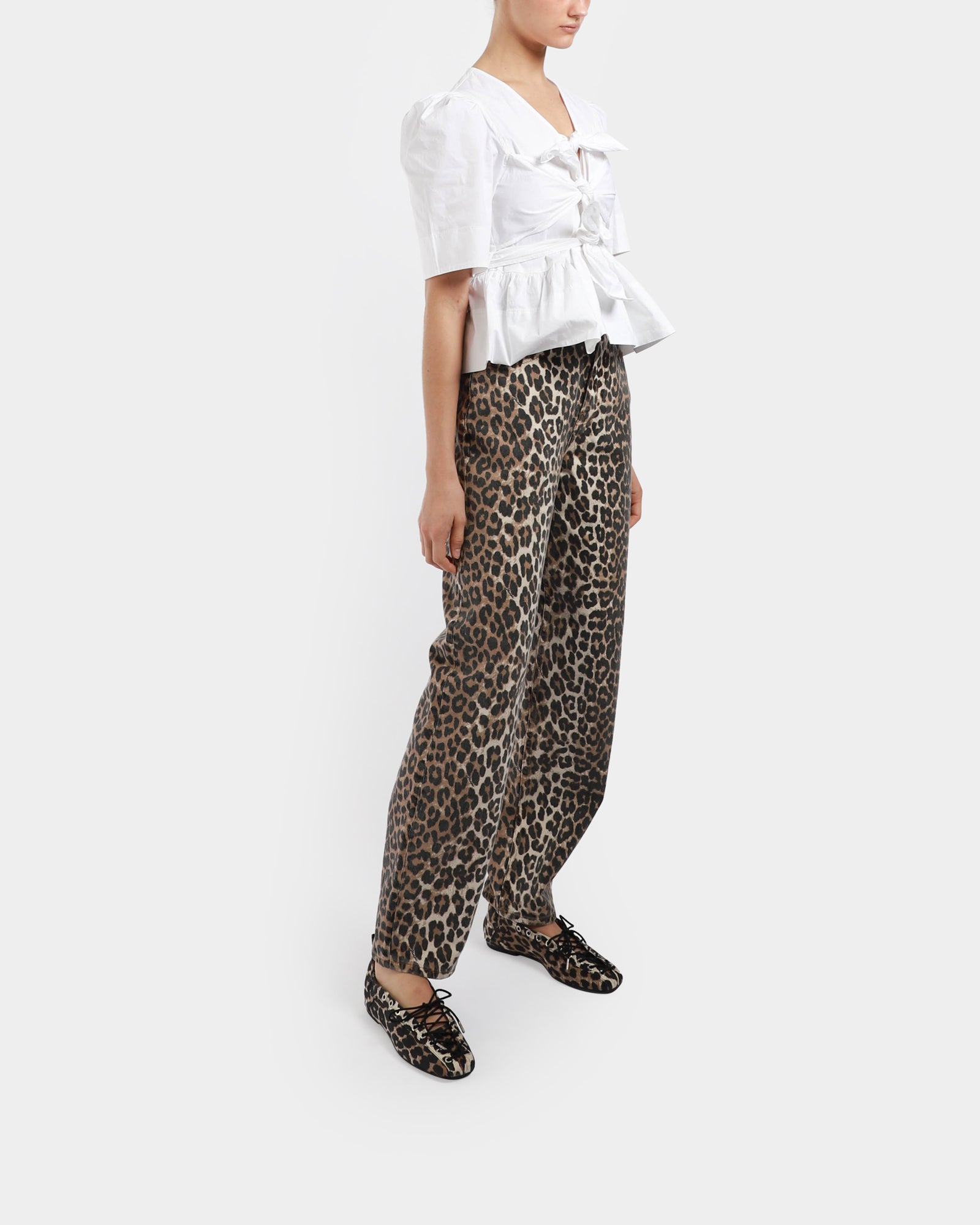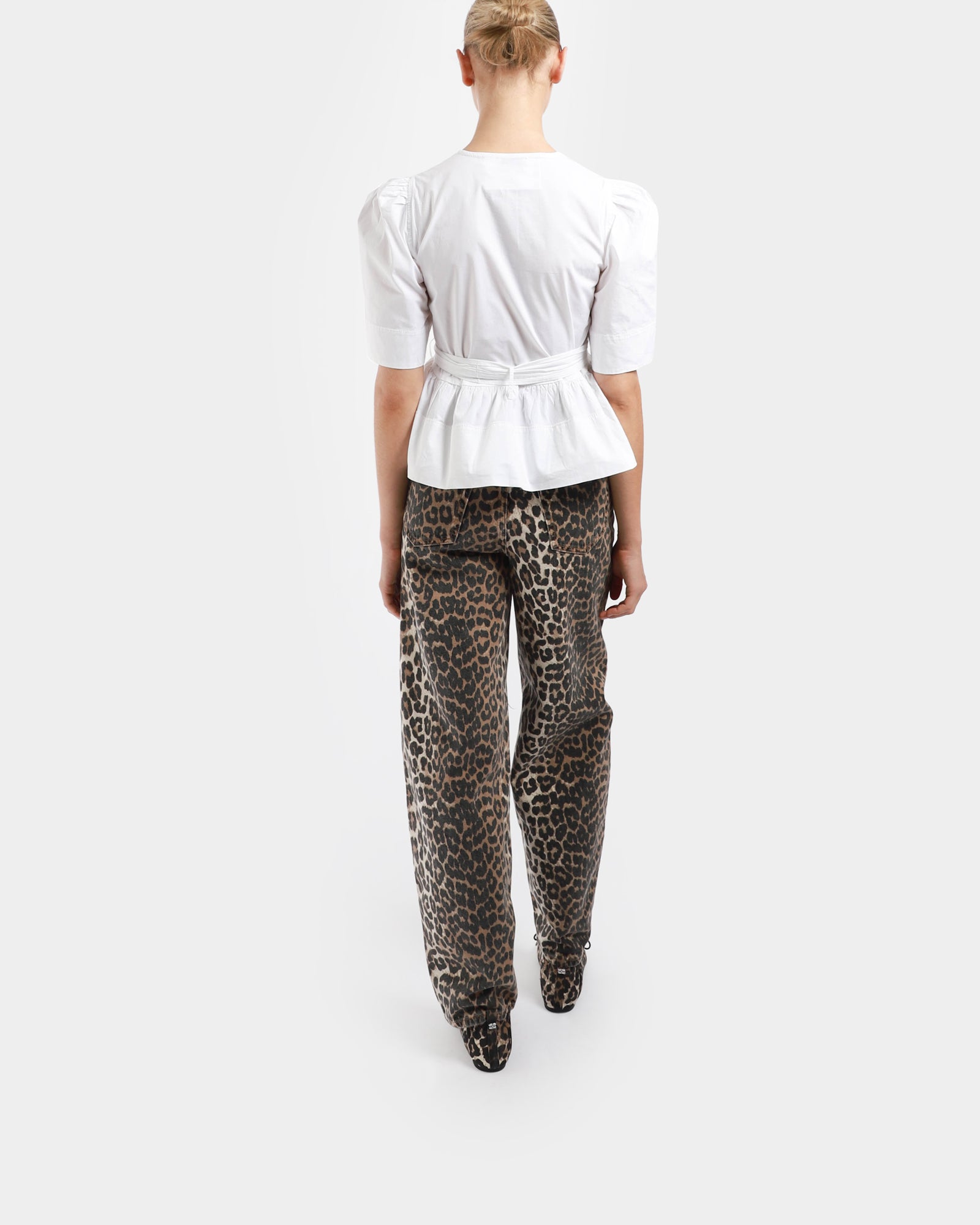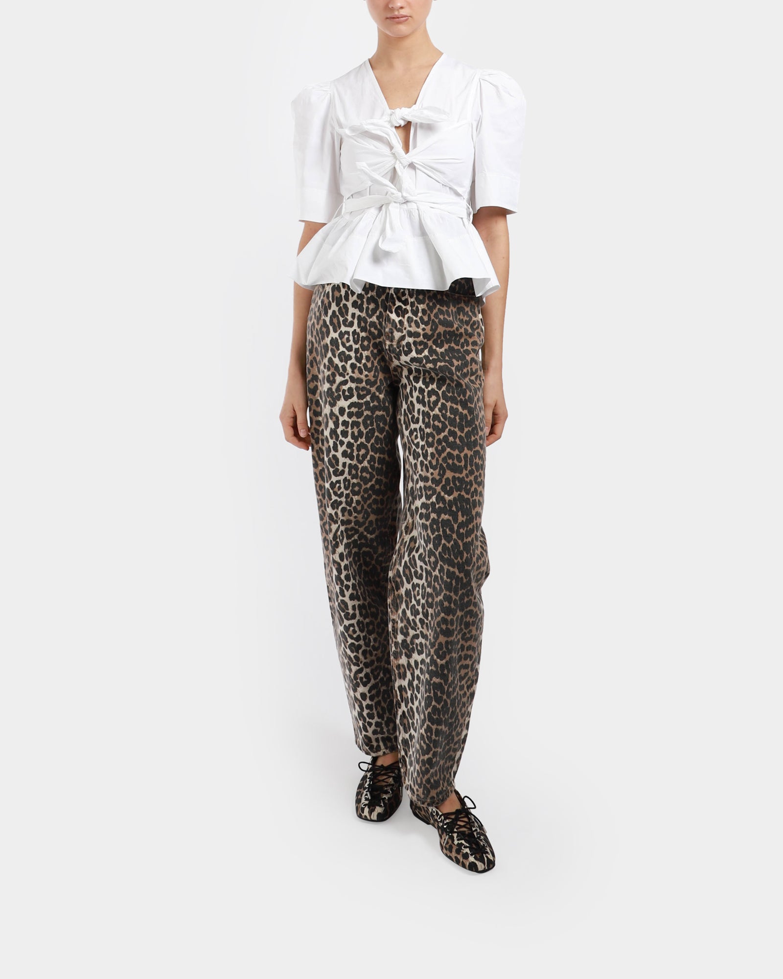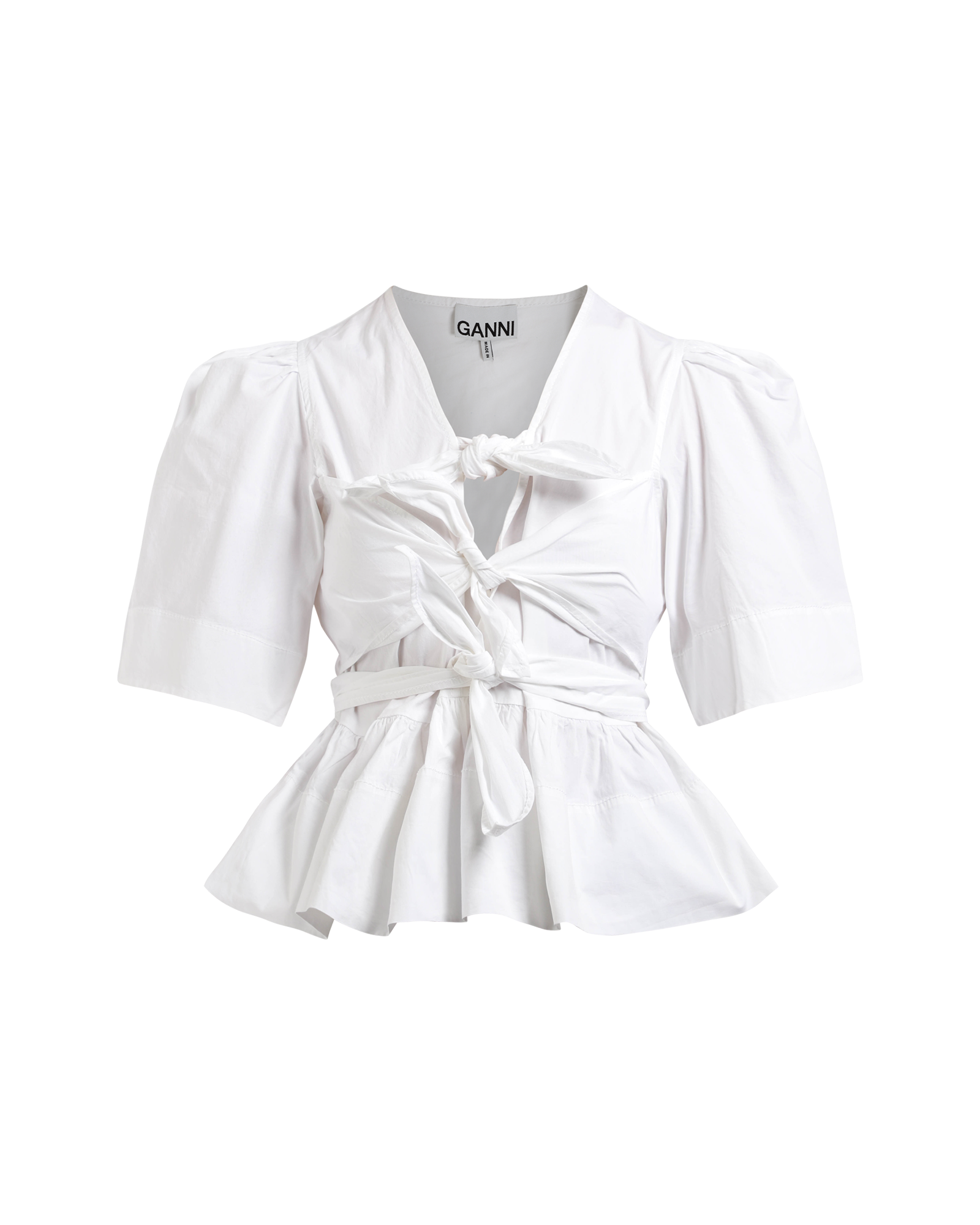 This white washed stretch cotton blouse features a deep v-neck, three front tie bands, and short puffed sleeves. It offers volume from waistline.