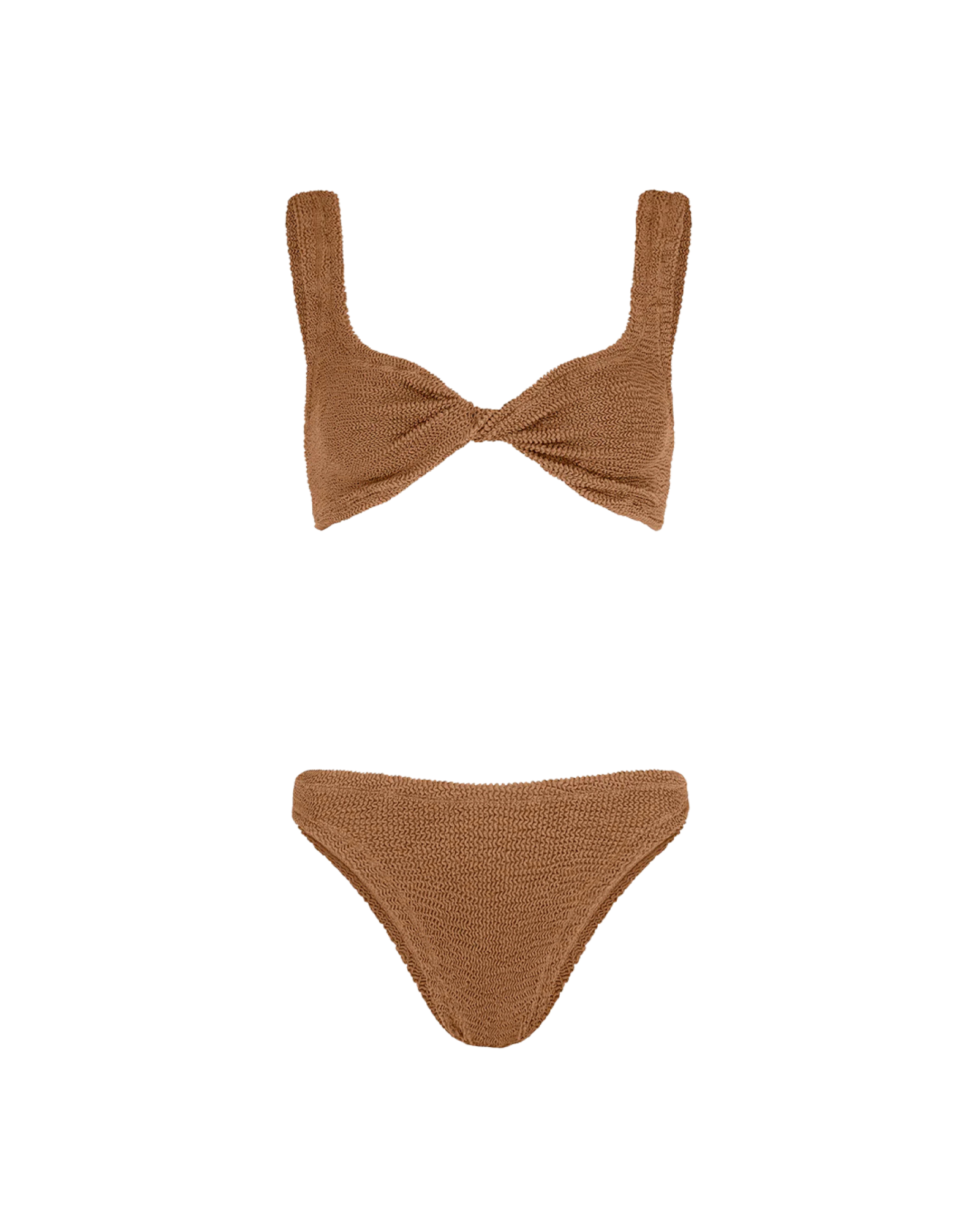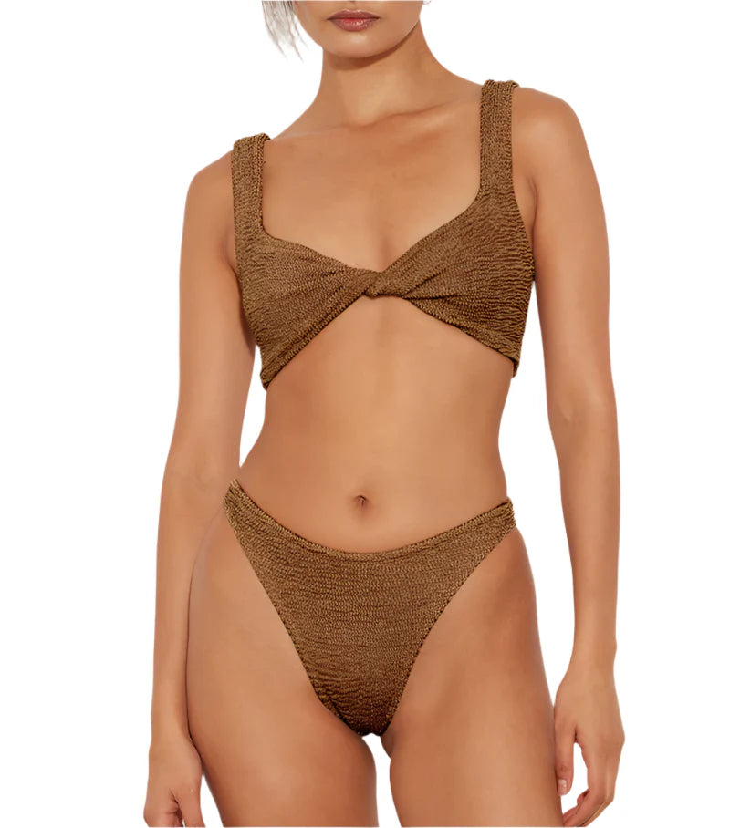 The Juno Bikini Metallic Crinkle is crafted from Crinkle™fabrication that stretches to flex, sculpt and support every curve, adapting to all body types in a unique one-size-fit. Featuring a classic coverage bikini bottom that can be worn high or low on the hip, and a twist top.