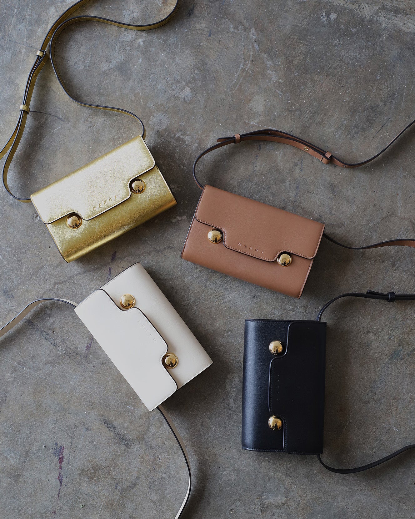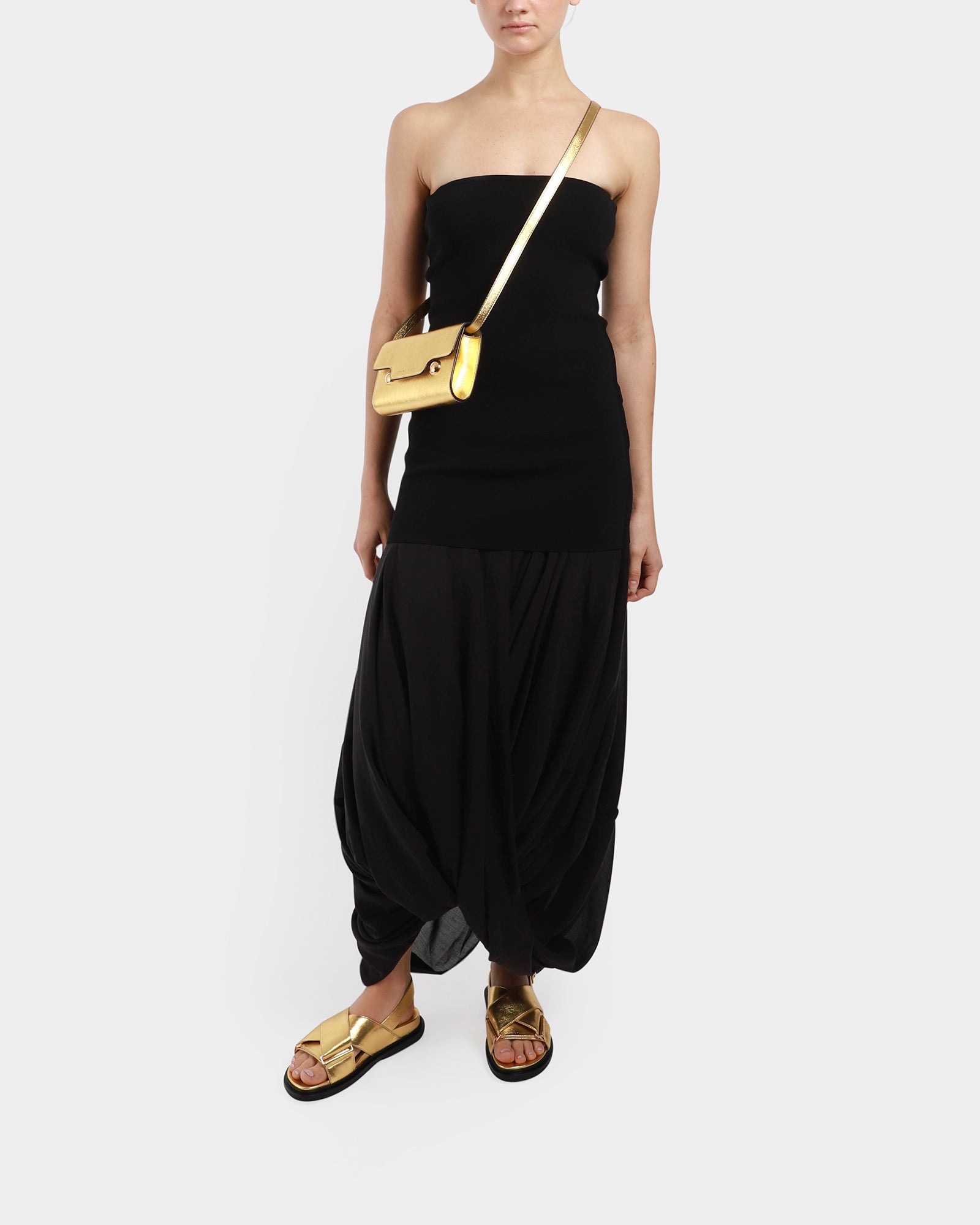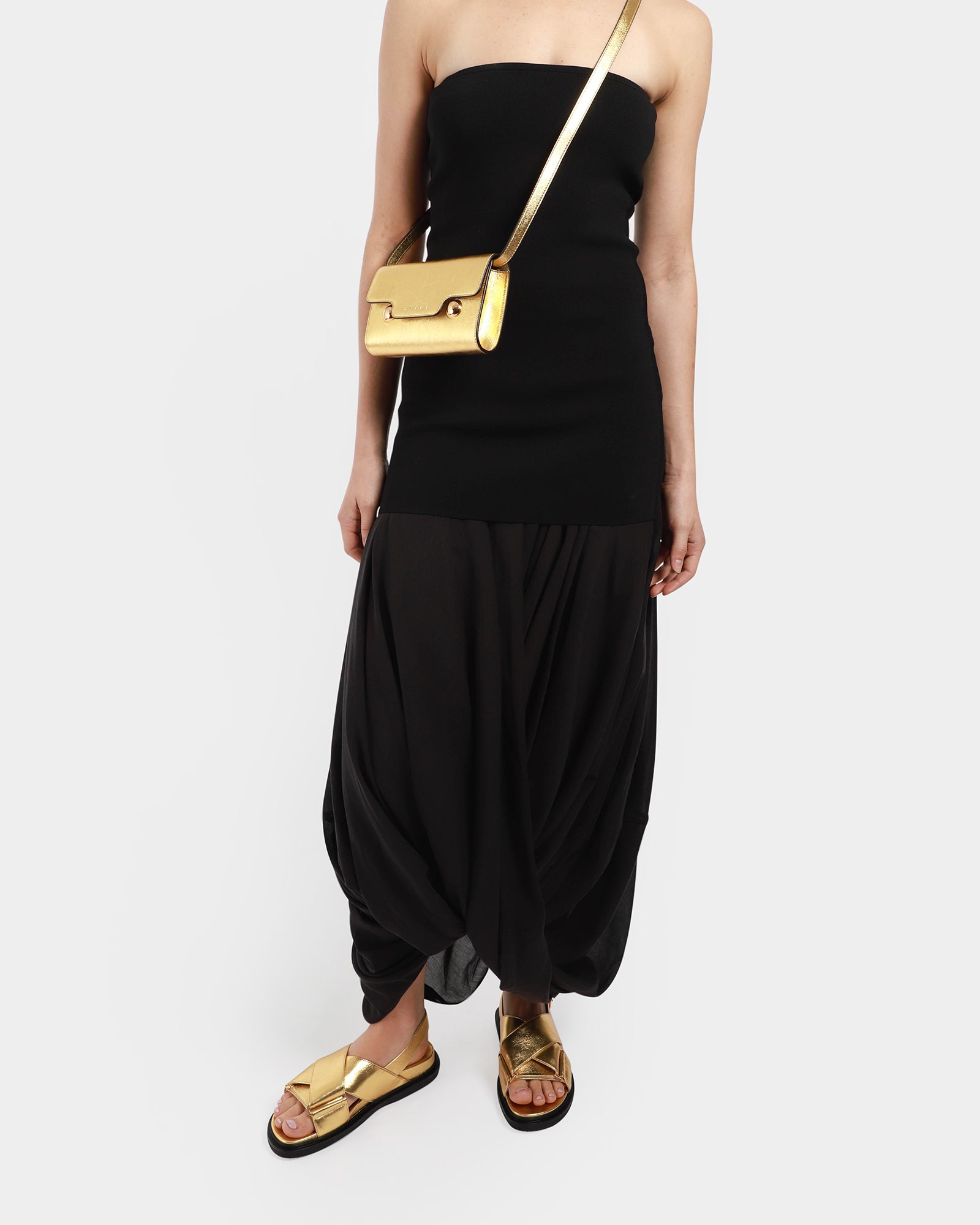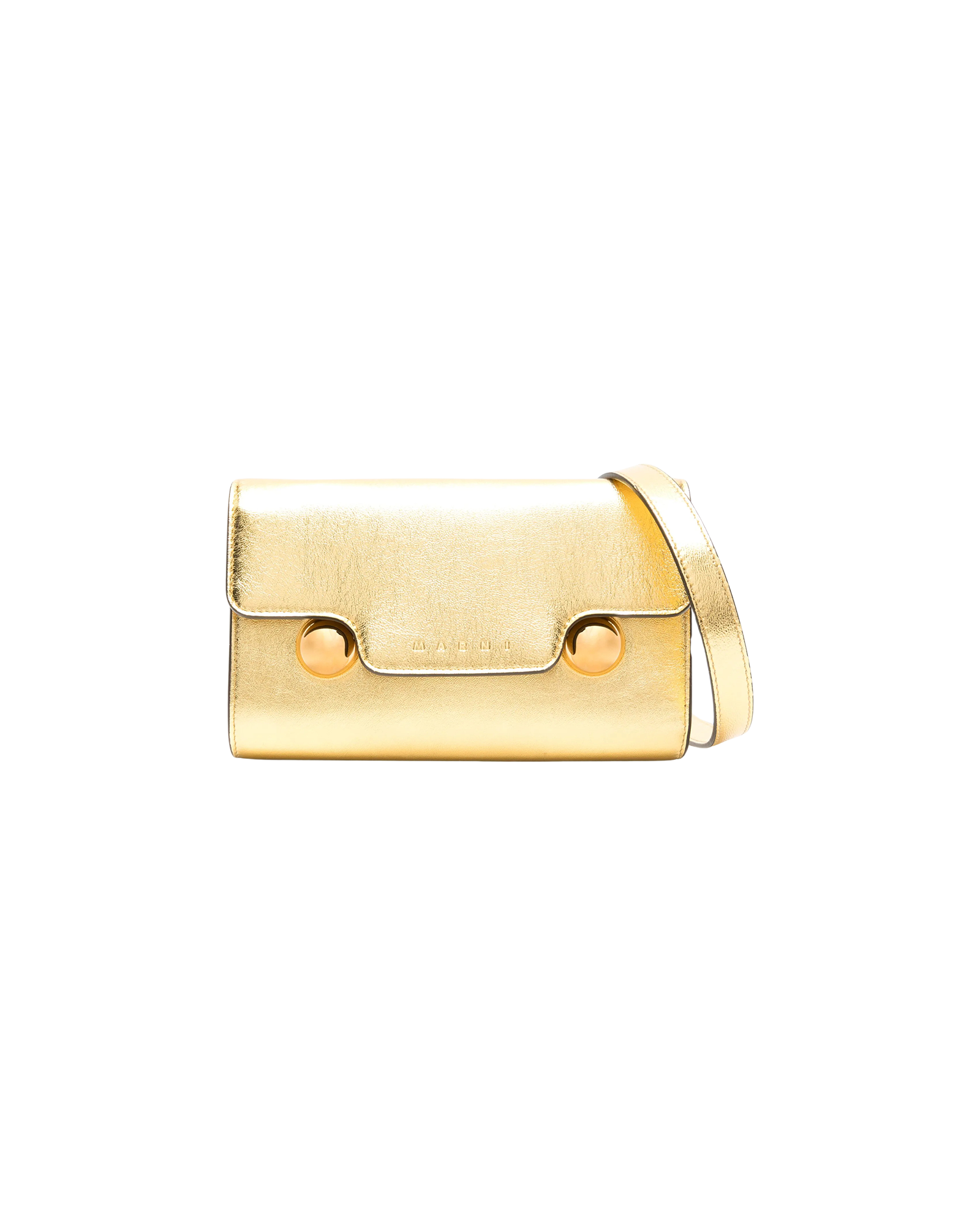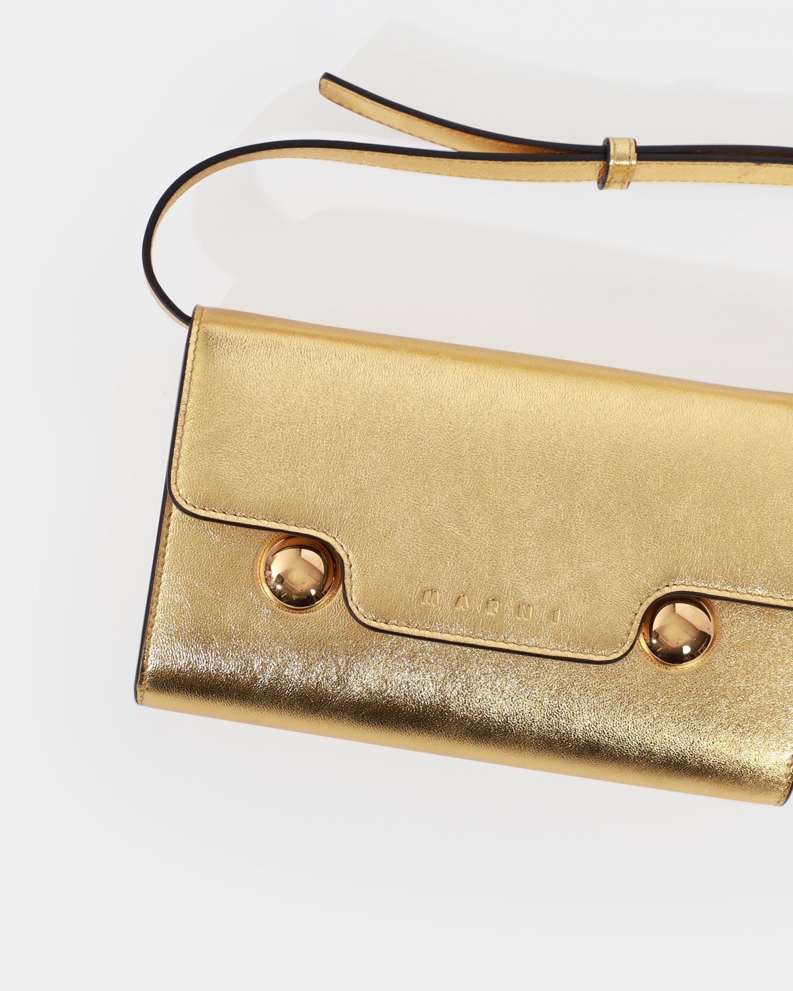 • This pochette is crafted in metallic leather with a sculpted flap, gold hardware, and metal stud details. It features a sliding, adjustable strap, viscose lining, and three card slots. Made in Italy.