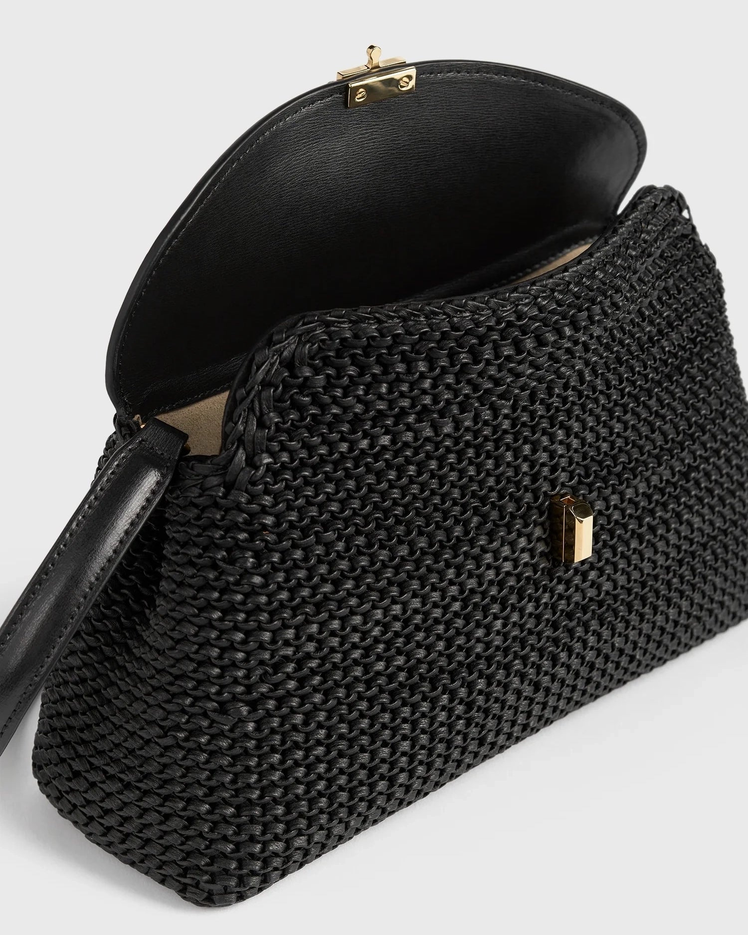 A structured clutch featuring a gold-tone metal twist lock securing the curved top flap. Handcrafted in Italy, it has a contrast topstitching and gold tone protective feet. The interior has a microsuede interior with leather card slot. It has a detachable and adjustable strap that must be attached with the clasp opening facing inwards.