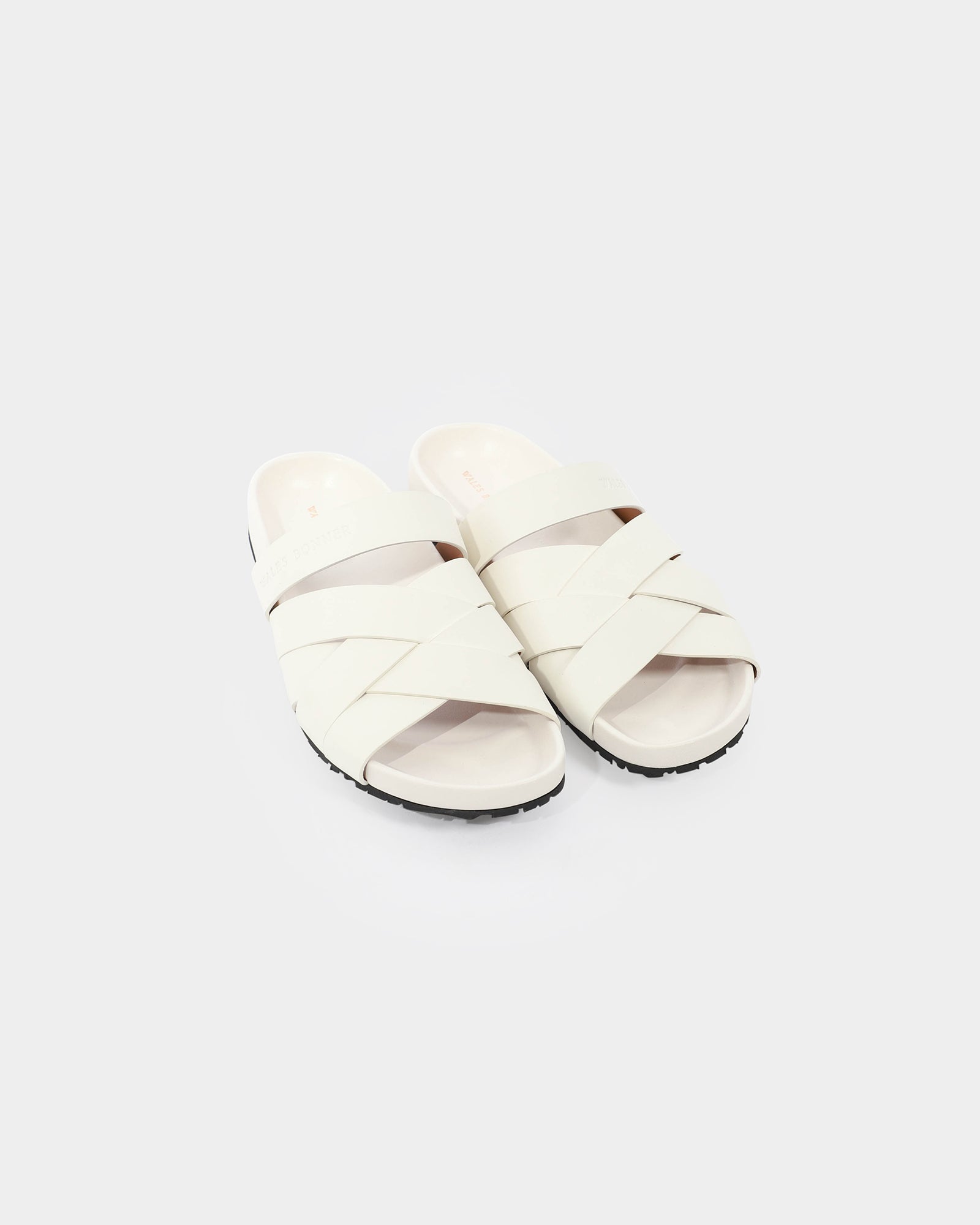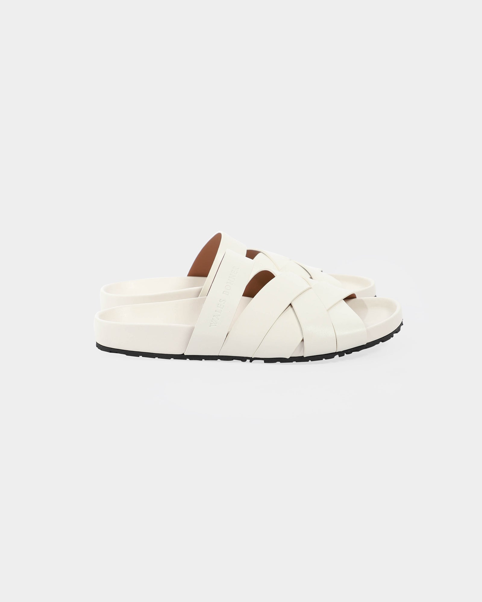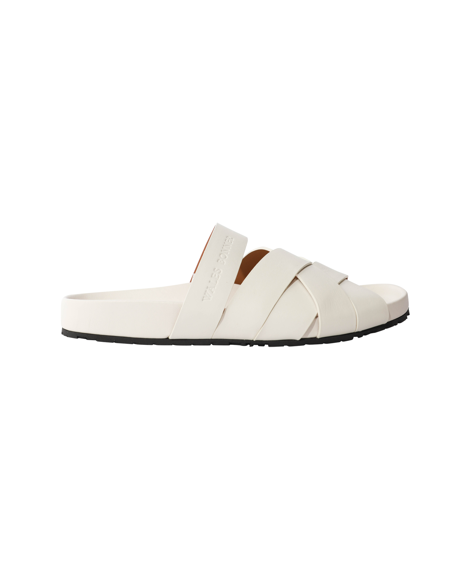 A leather slide, bringing comfort and style. Featuring woven like leather straps and one single leather strap at top of the foot with brand name embossed. Made in Italy.