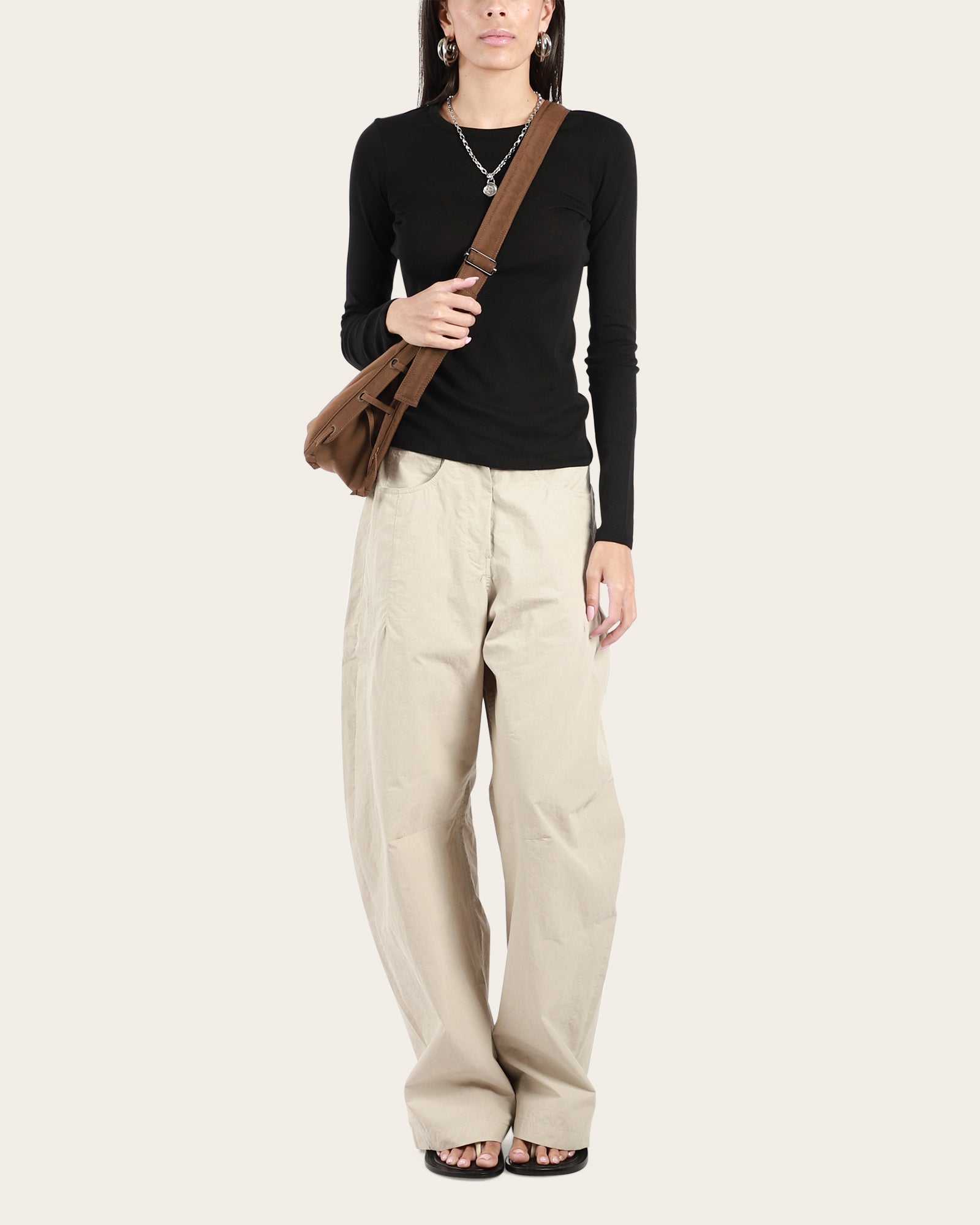 Lengthened crewneck tee with long sleeves, crafted from lightweight, semi-sheer 1×1 rib organic cotton. Designed to be layered or worn on its own as a light, breathable piece.