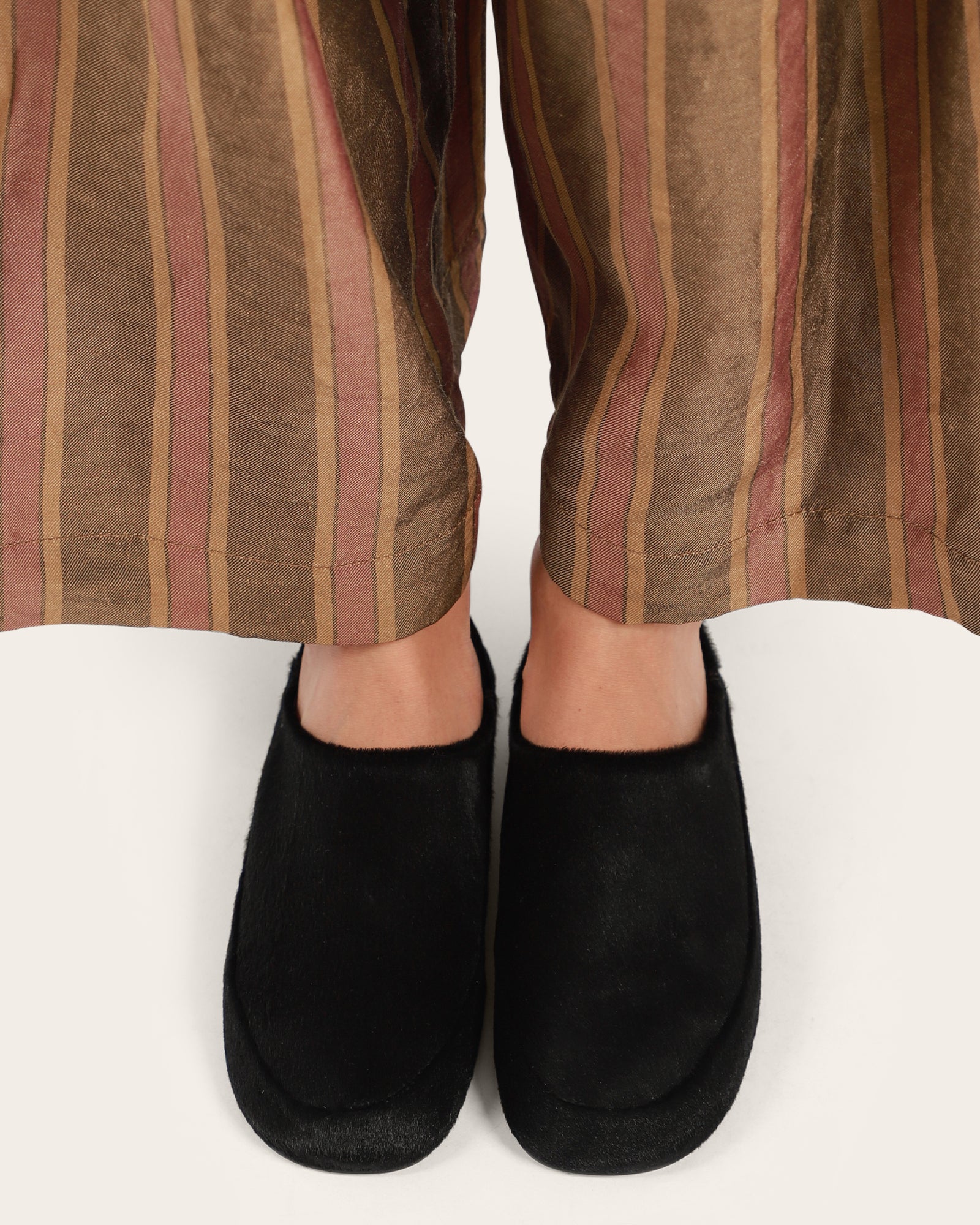 Soft slipper crafted in luxurious pony leather, featuring a classic round toe and refined stitching along the vamp. The collapsible heel lets you wear it as a slipper or an easy slide, offering effortless versatility and everyday comfort.
