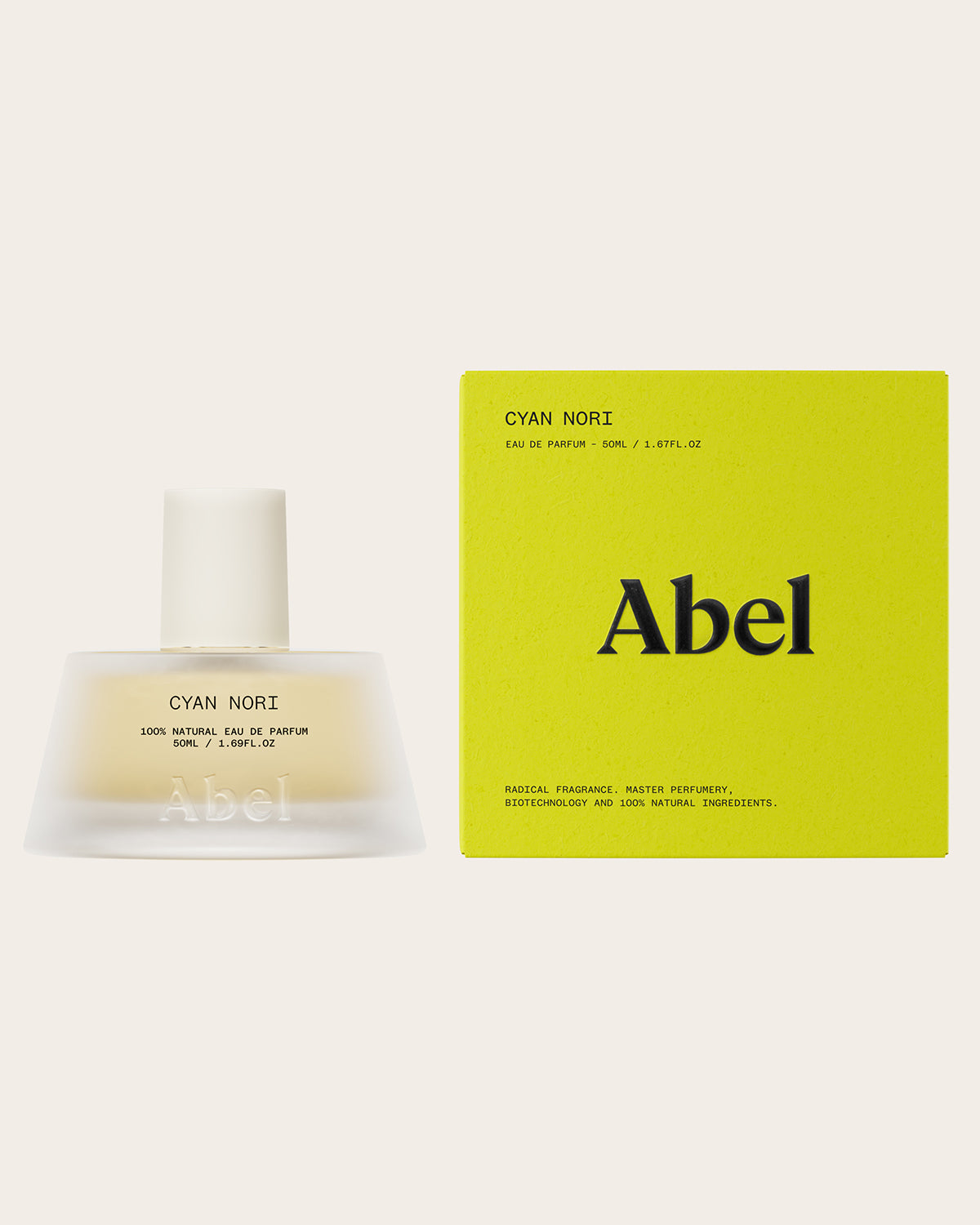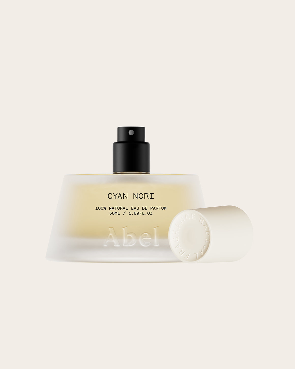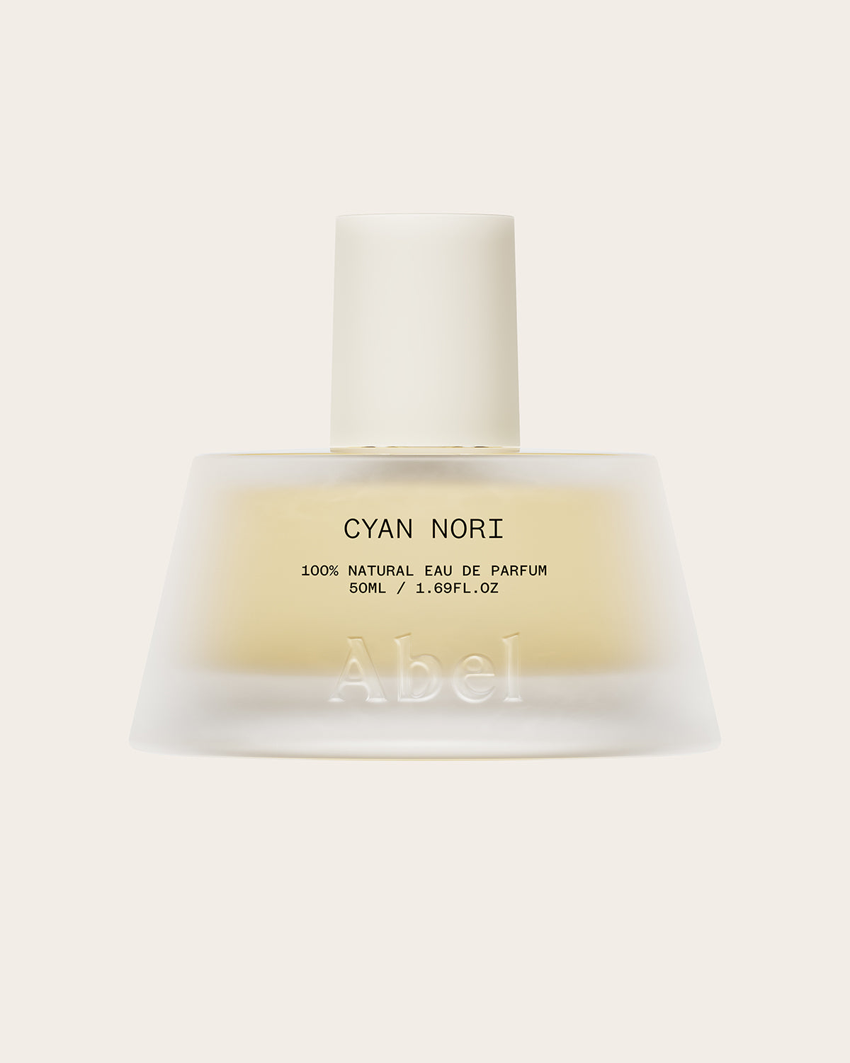 Cyan Nori Eau de Parfum by Abel is a salty-sweet aquatic fragrance. A burst of briny nori opens this outspoken directional scent, as effervescent white peach and tangerine float the transition to a vibrant skin musk dry-down.