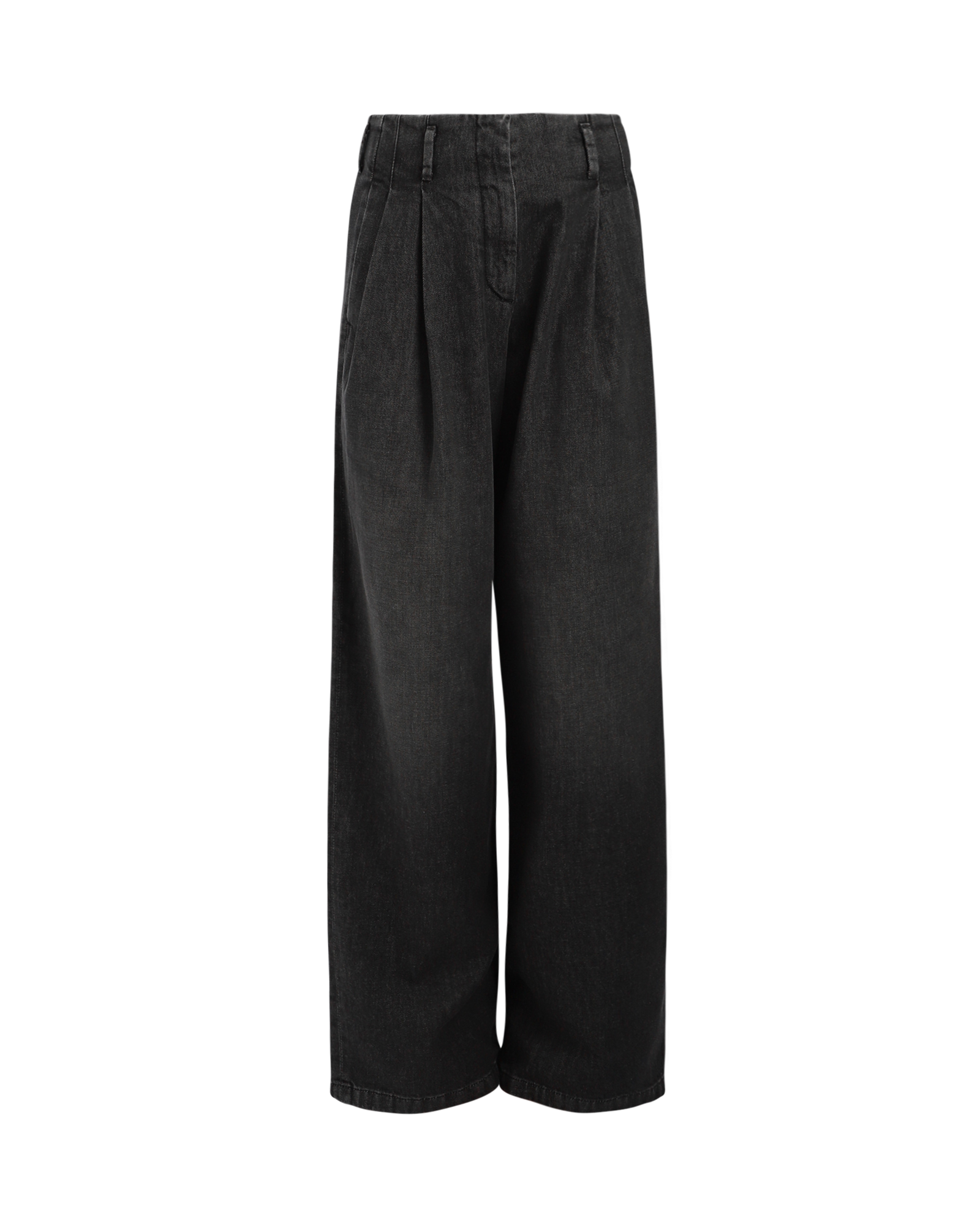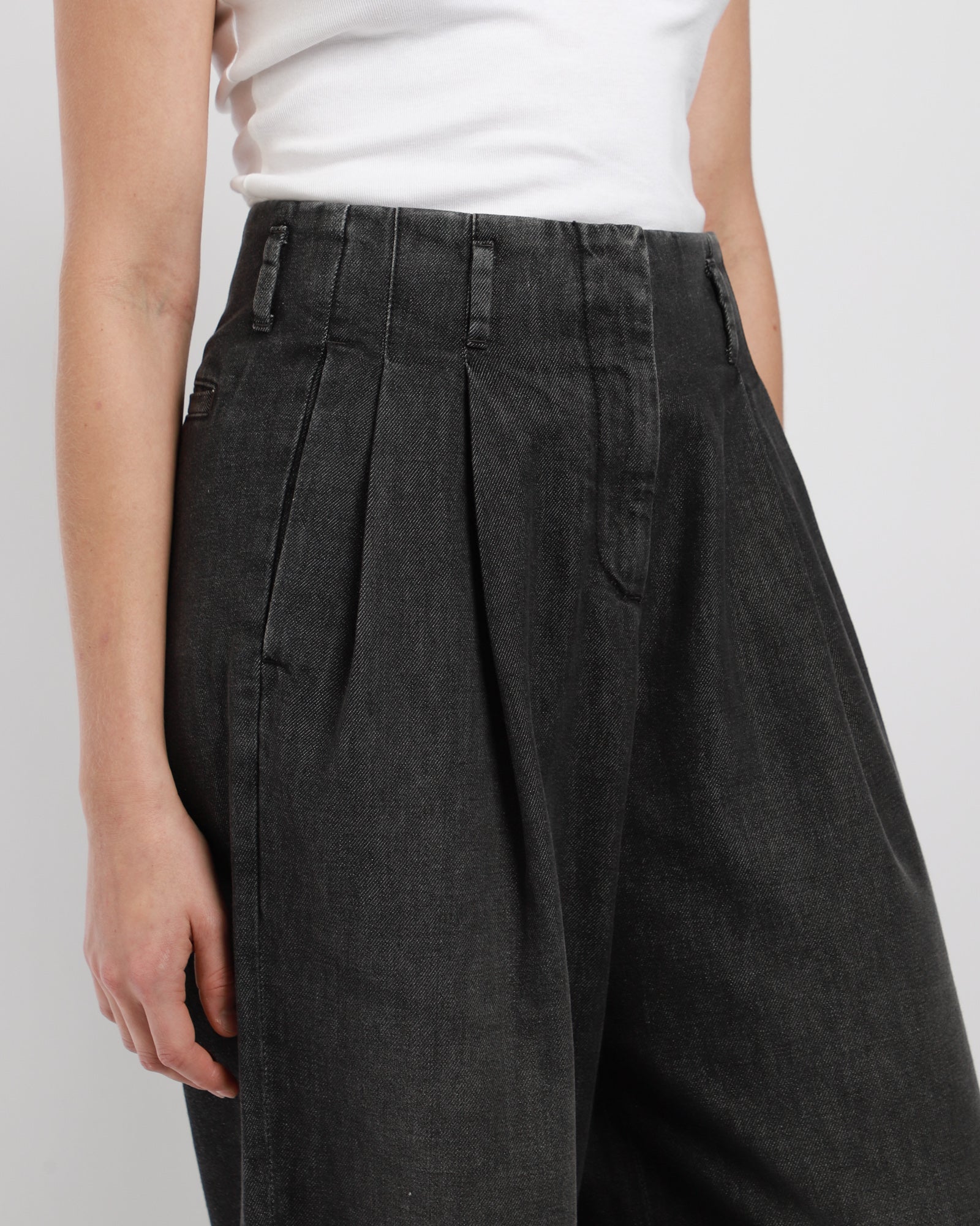 A wide-leg pant with pleat detailing on the front and a hook-and-zip closure. It is made from a vintage-faded cotton-poly blend and features side and back pockets with double star detailing at the back.
