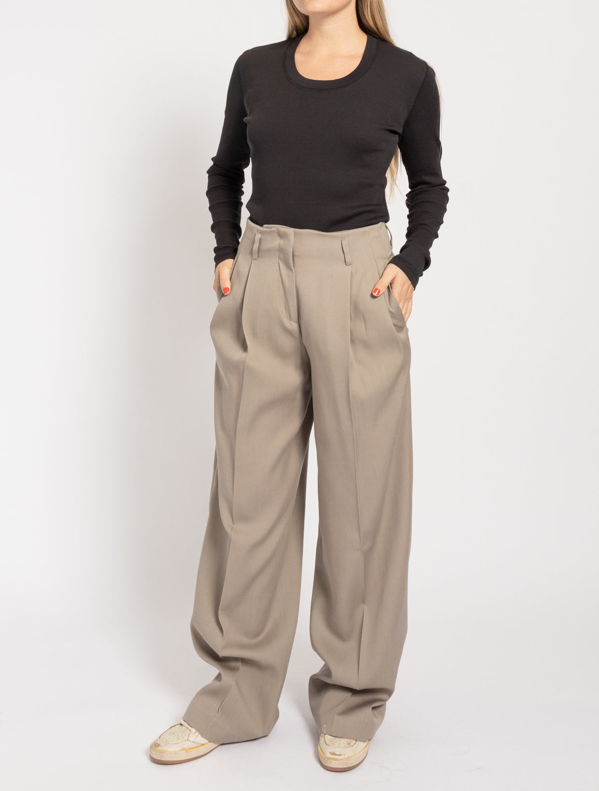 Wide leg tailored pants from Golden Goose, featuring light dry wool garbardine fabric, pleated front detail, high and seamless belt-looped waist, side pockets, back signature star detailing, concealed zip and flat hook fastening to close.