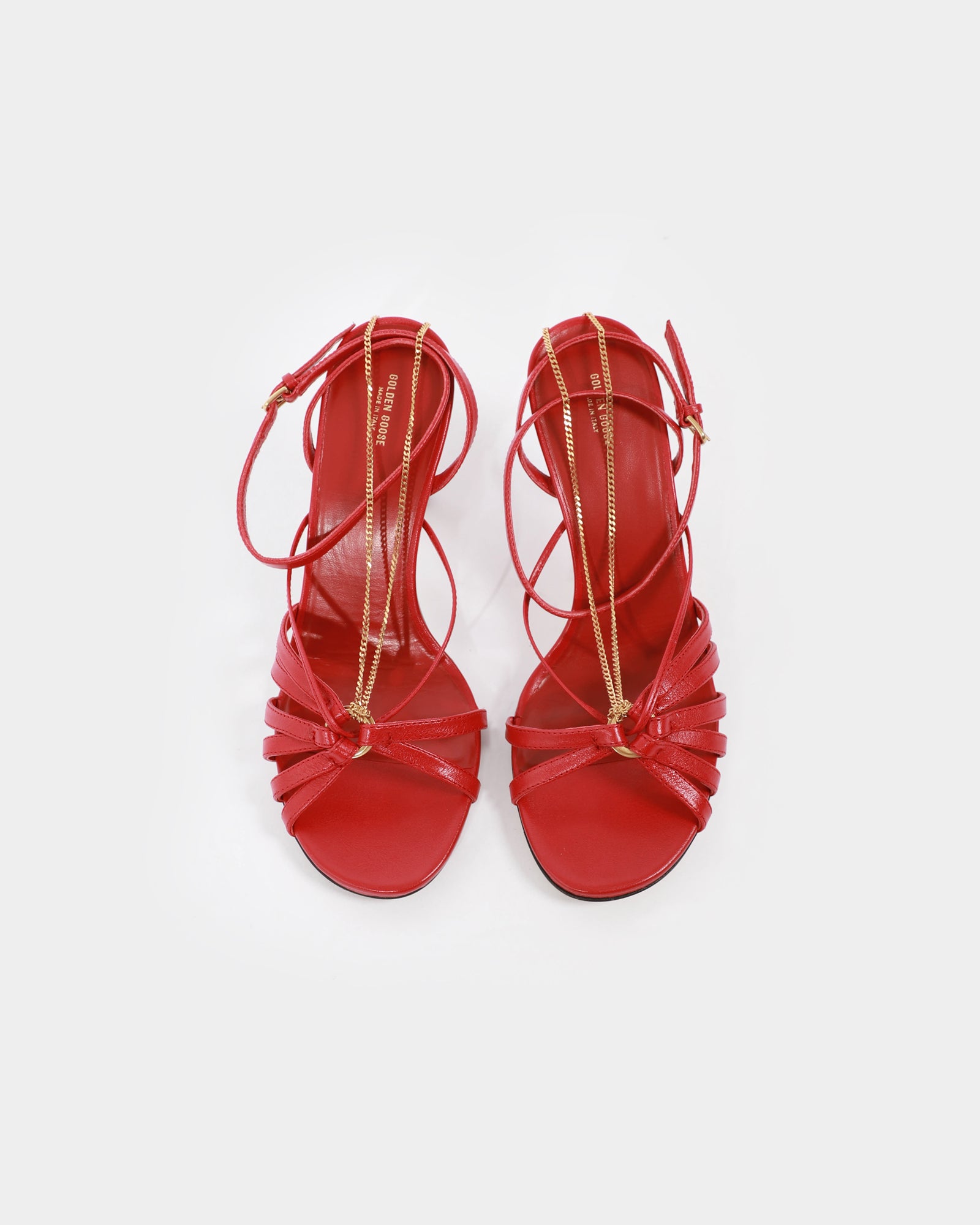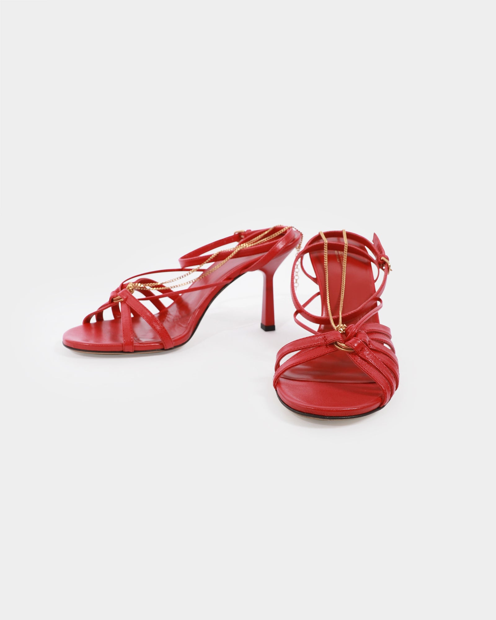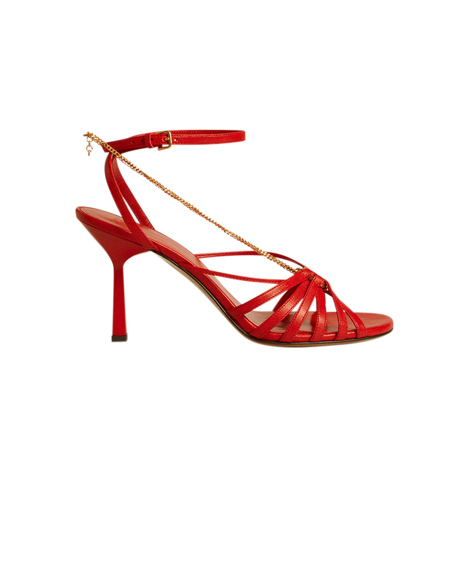 These heeled sandals blend boldness and femininity, adding casual elegance to any look. Featuring red nappa leather straps, a stiletto heel, gold galvanic ring and chain details, and an adjustable ankle strap with a gold buckle. Handmade in Italy.