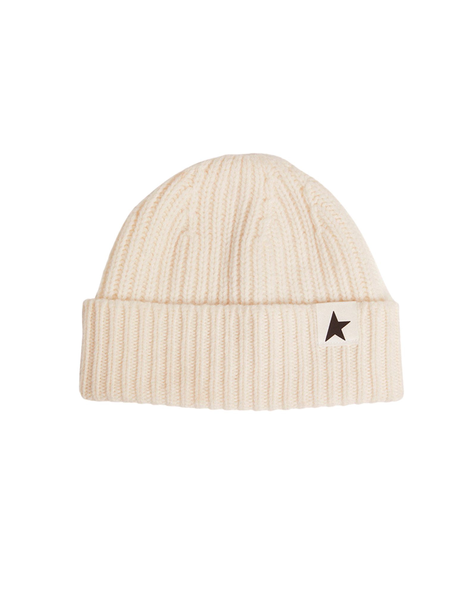 Ribbed knit beanie from Golden Goose, featuring a small contrasting star-embroidered patch on the turn-up.