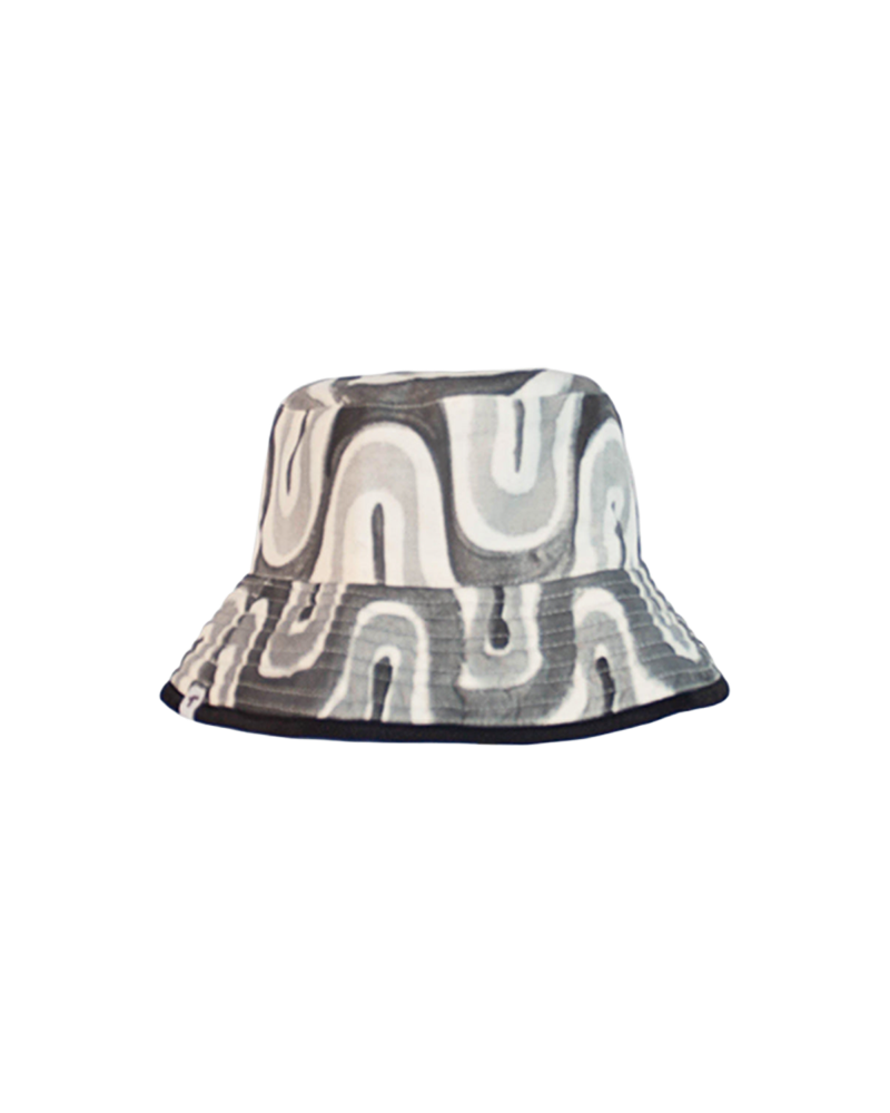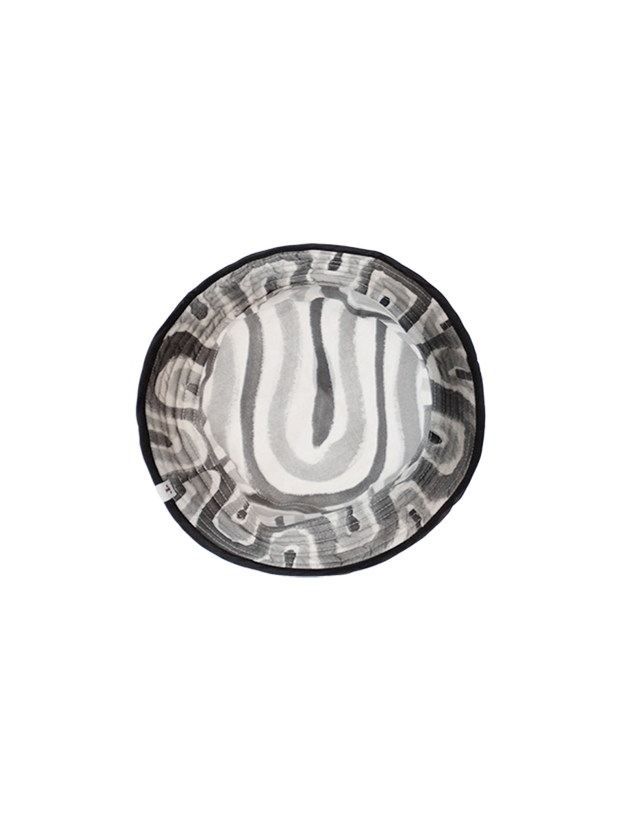 This bucket hat with a 21 cm brim from Romualda is hand made and painted in Spain. The hat is reversible with a black and white swirl pattern and black wild silk lining.