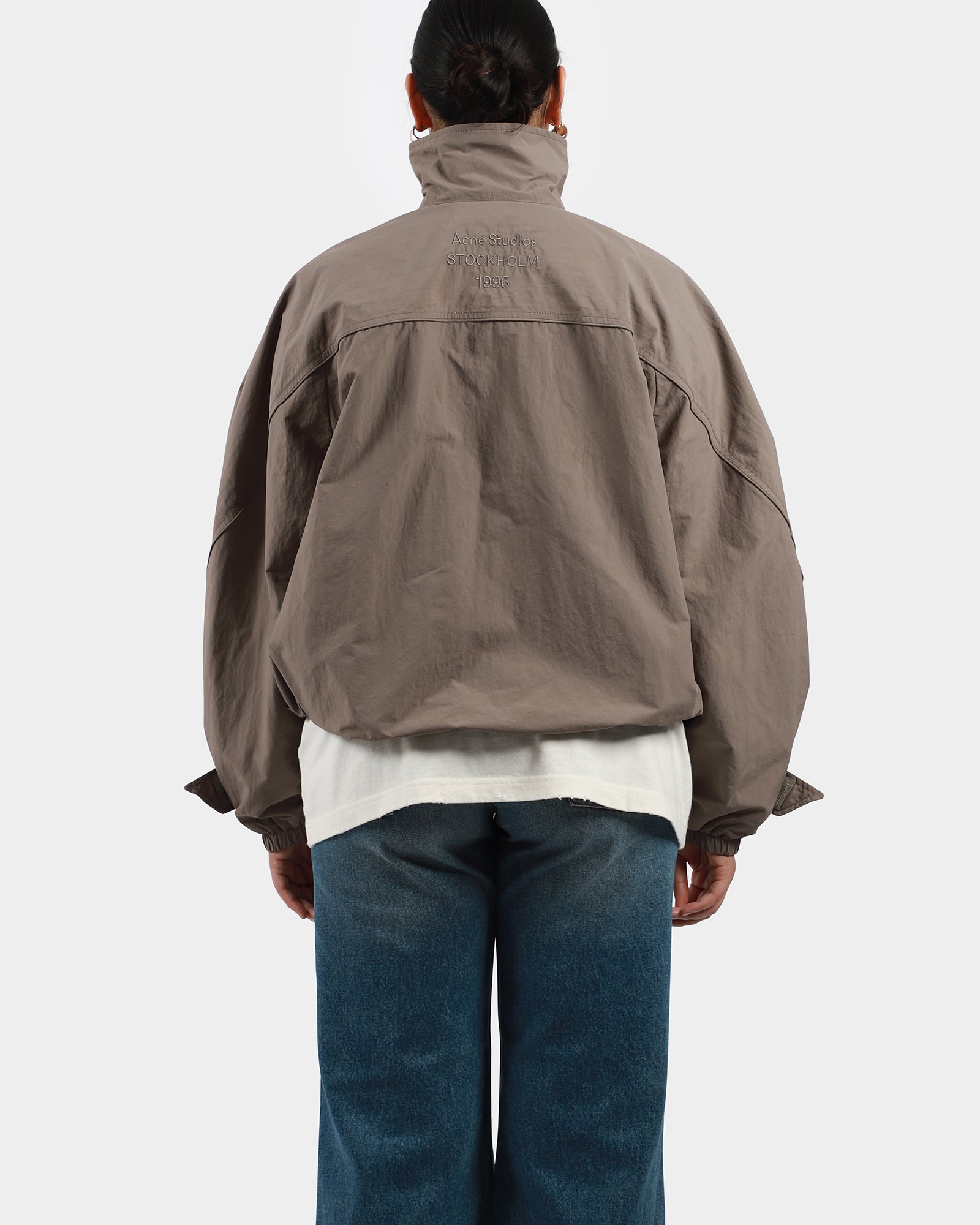 Technical nylon jacket, high neckline, front zipper pockets, and centre zipper. Features 1996 Acne Studios logo embroidery, relaxed fit, and below-waist length.