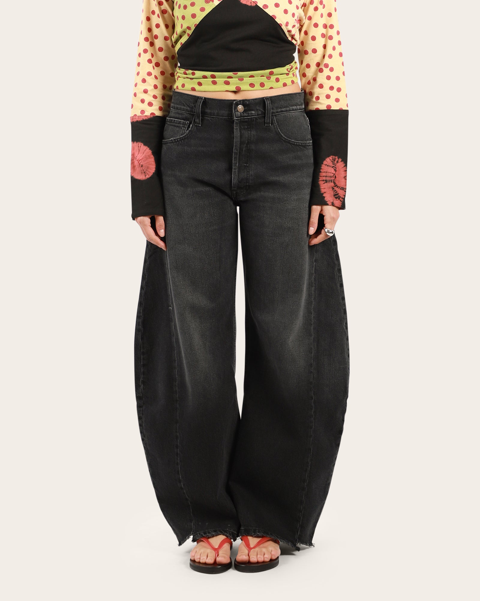 Cut in a curved barrel silhouette, these high-waisted jeans sit neatly at the waist with an easy, relaxed fit. The sculpted leg adds considered volume without feeling bulky, creating a clean, architectural line that feels modern and intentional.
