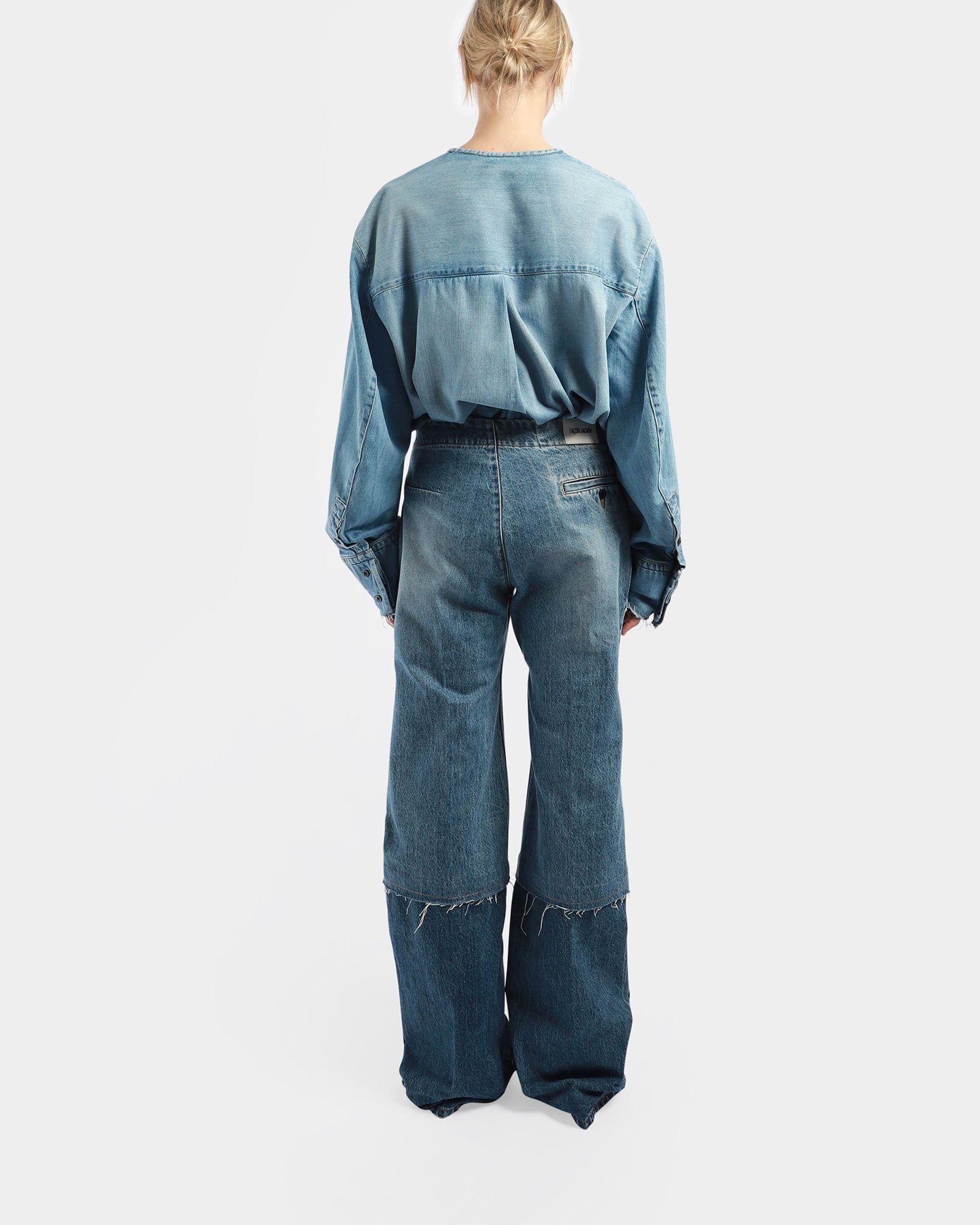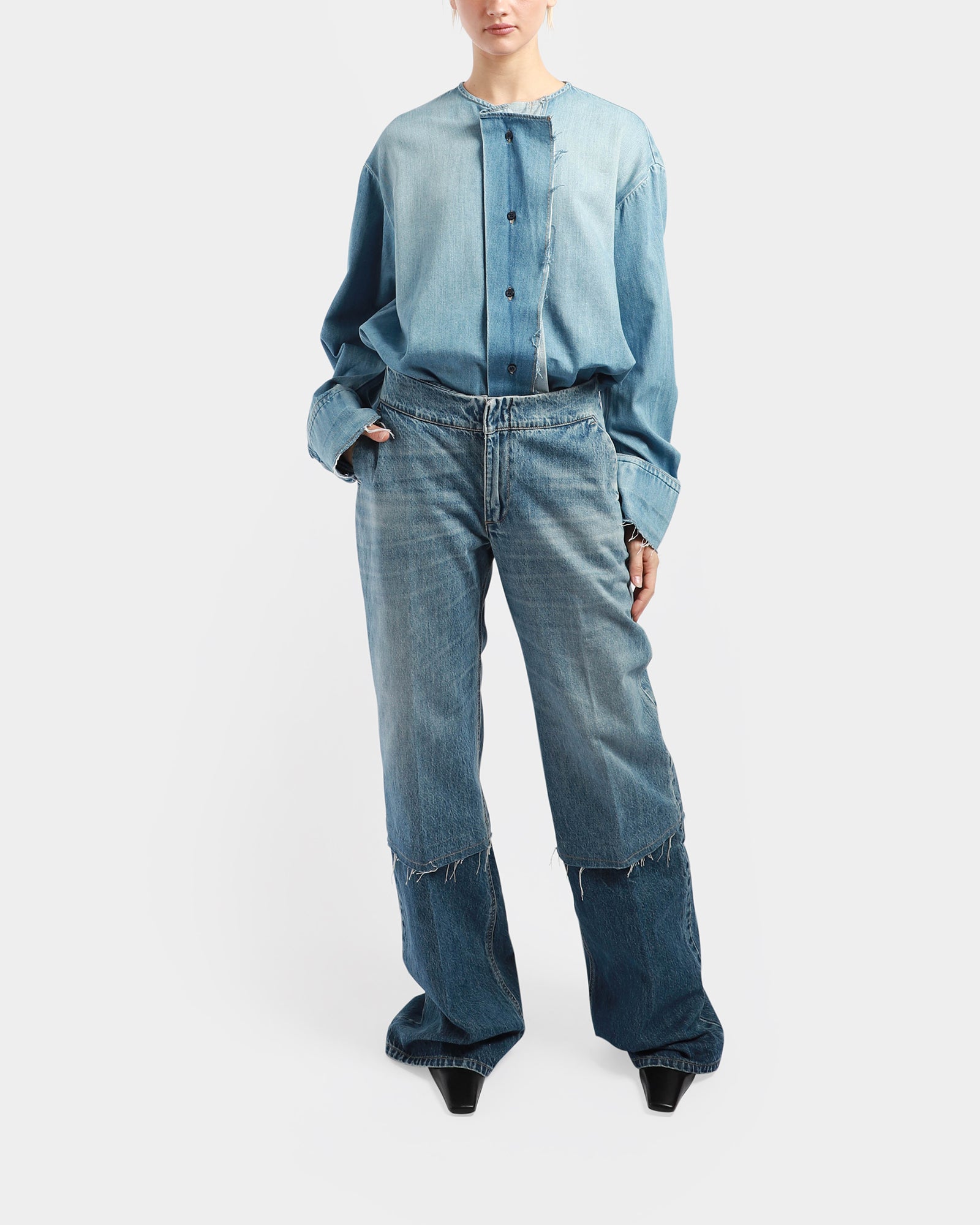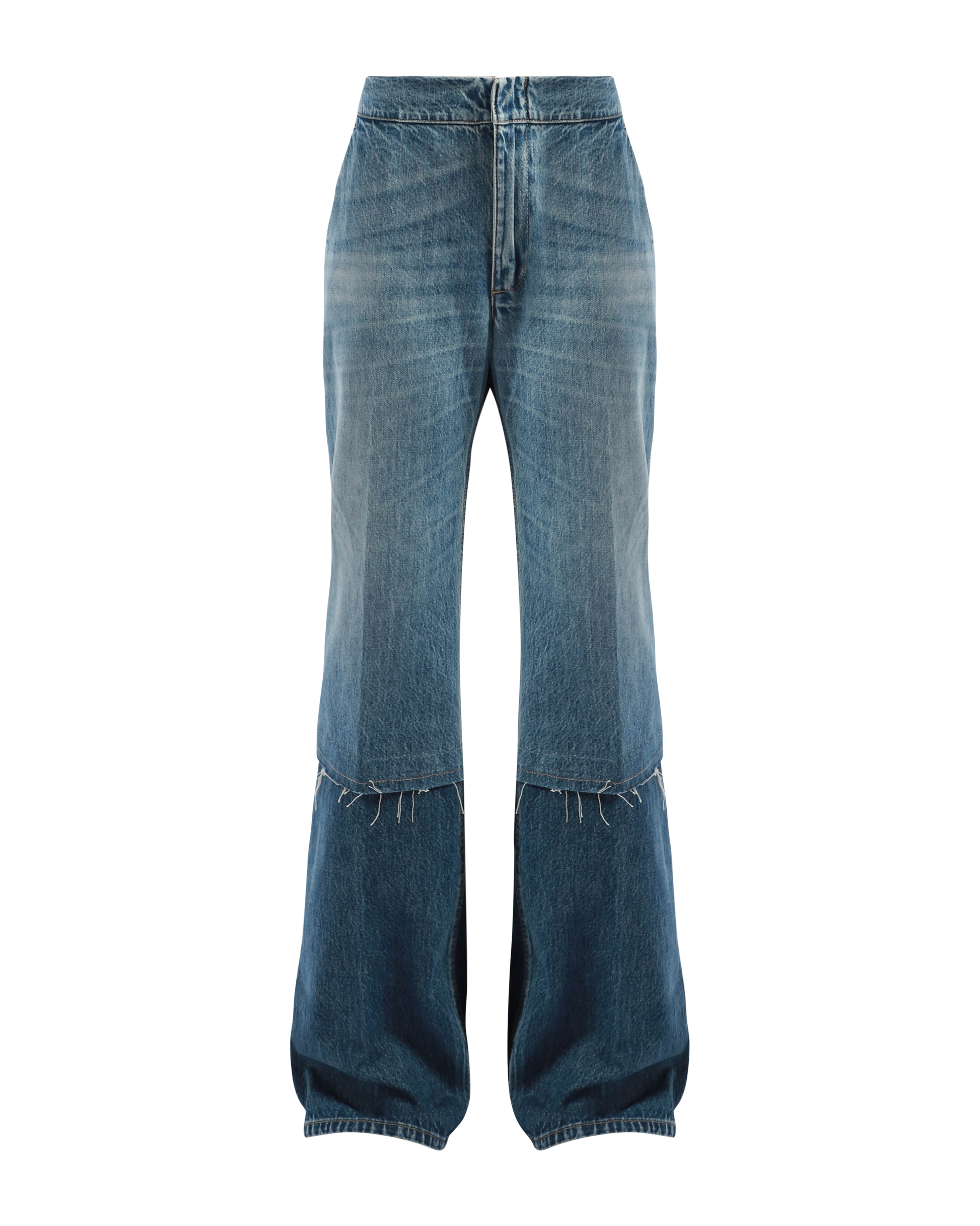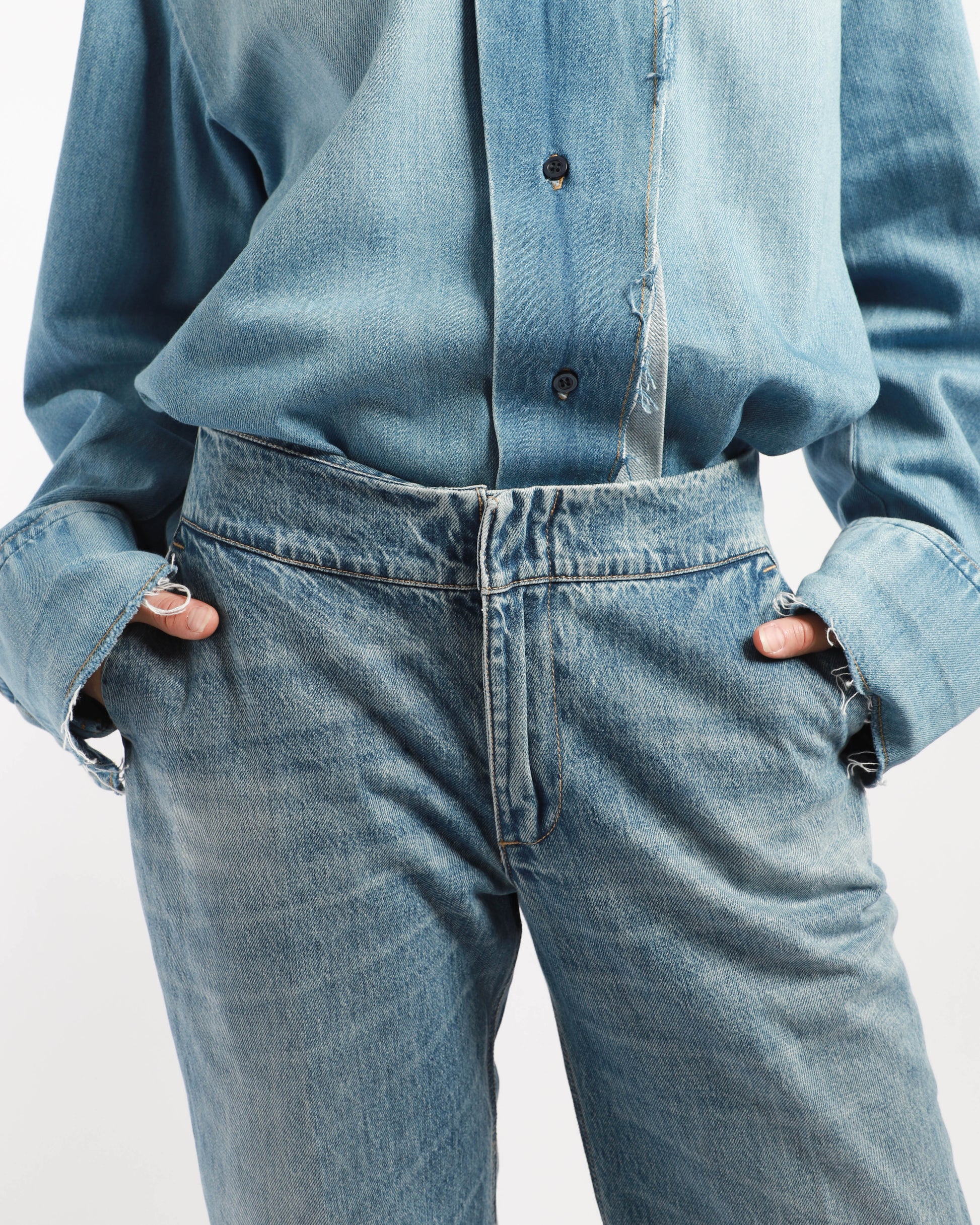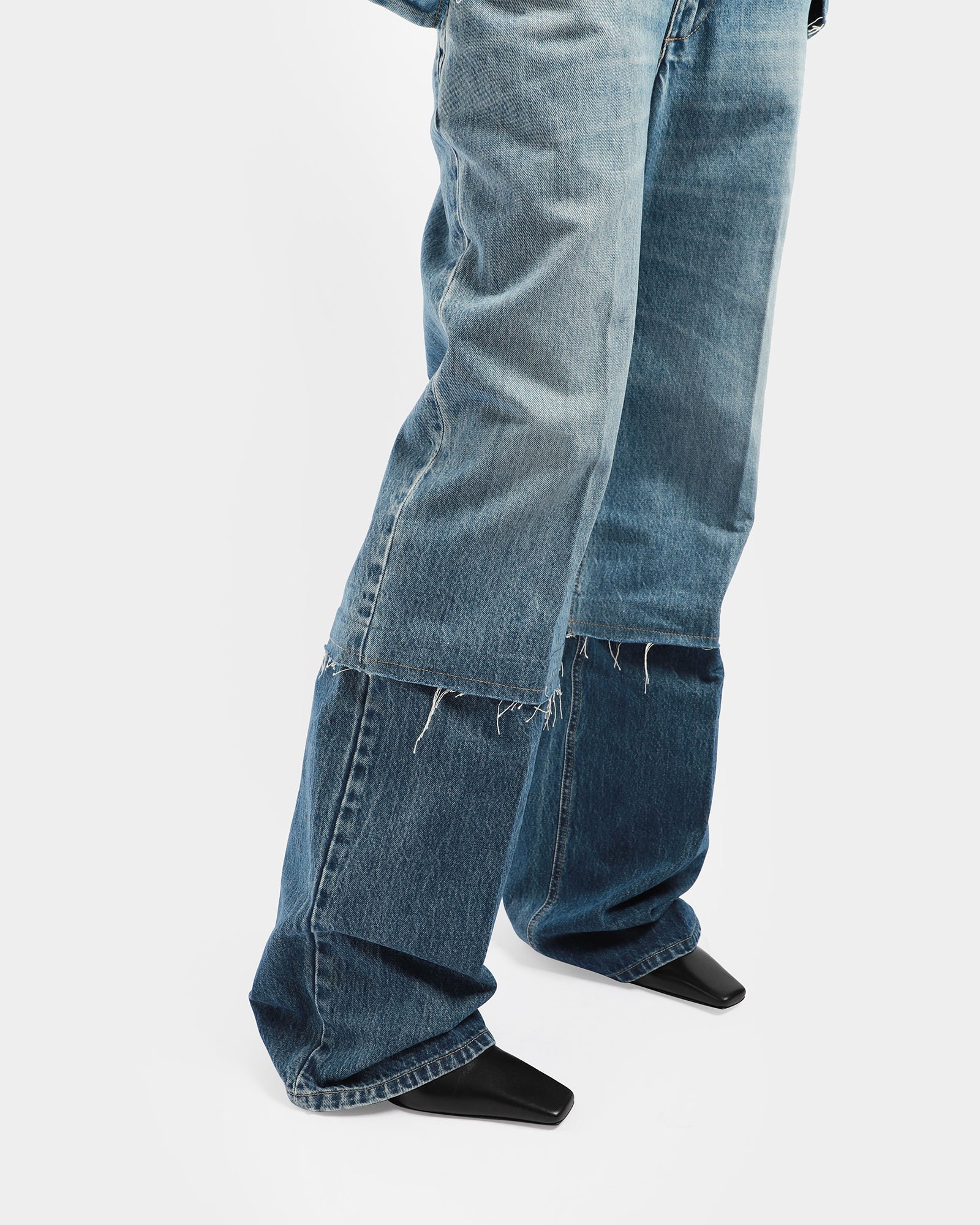 The Pass Pants are Italian denim with a trompe-l’œil effect at the hem and raw edges. They feature a mid-rise waist and a relaxed fit.