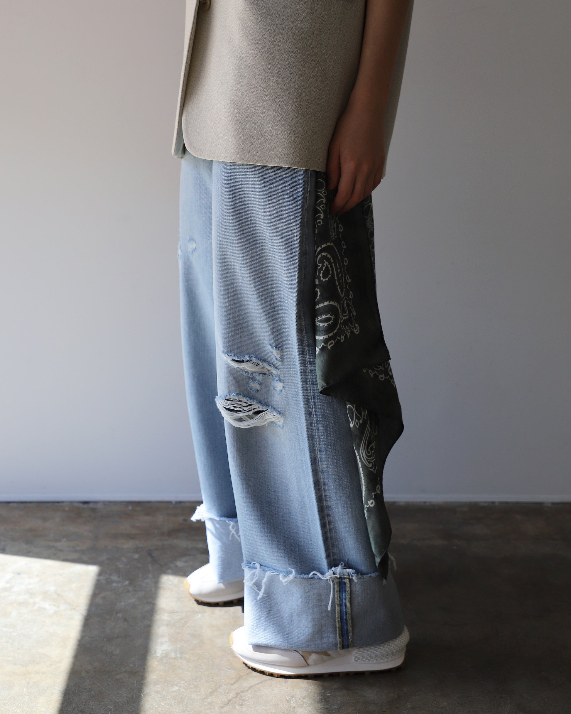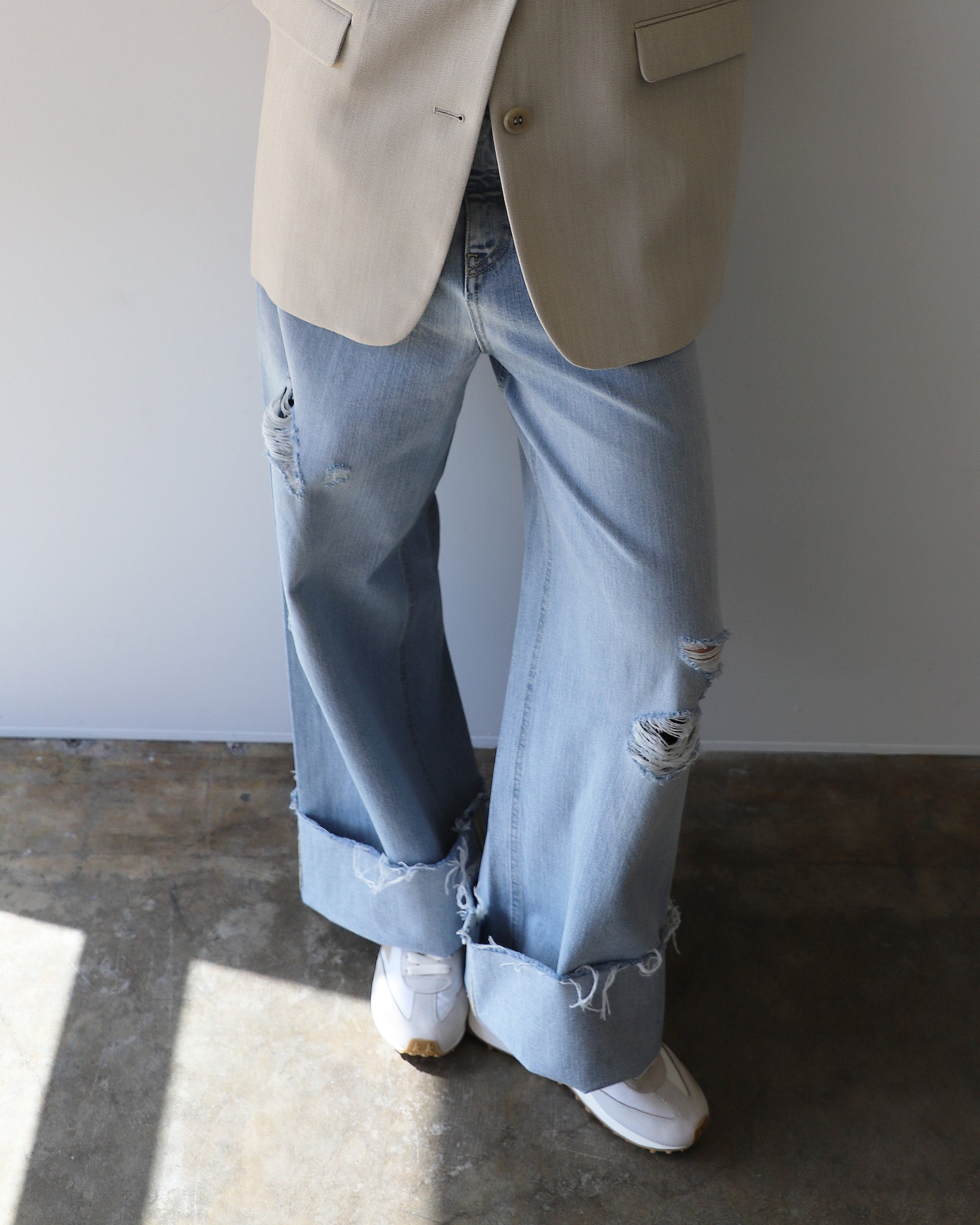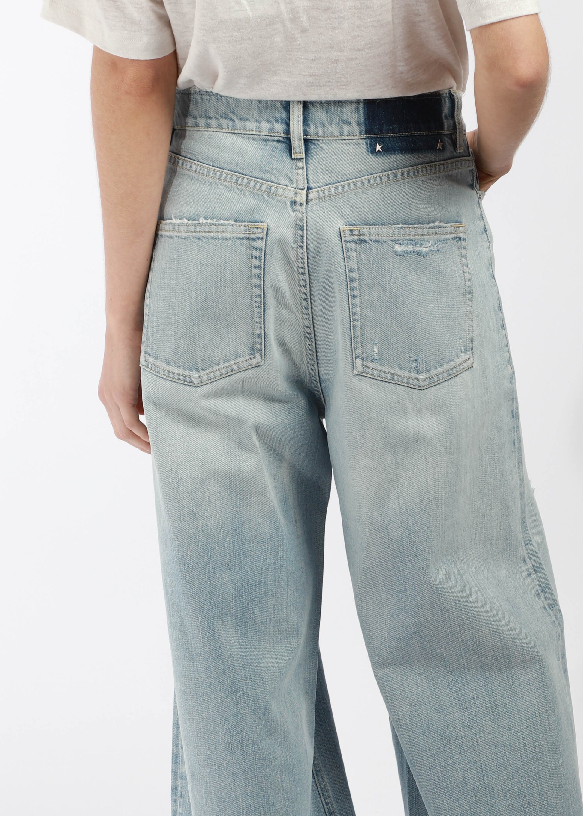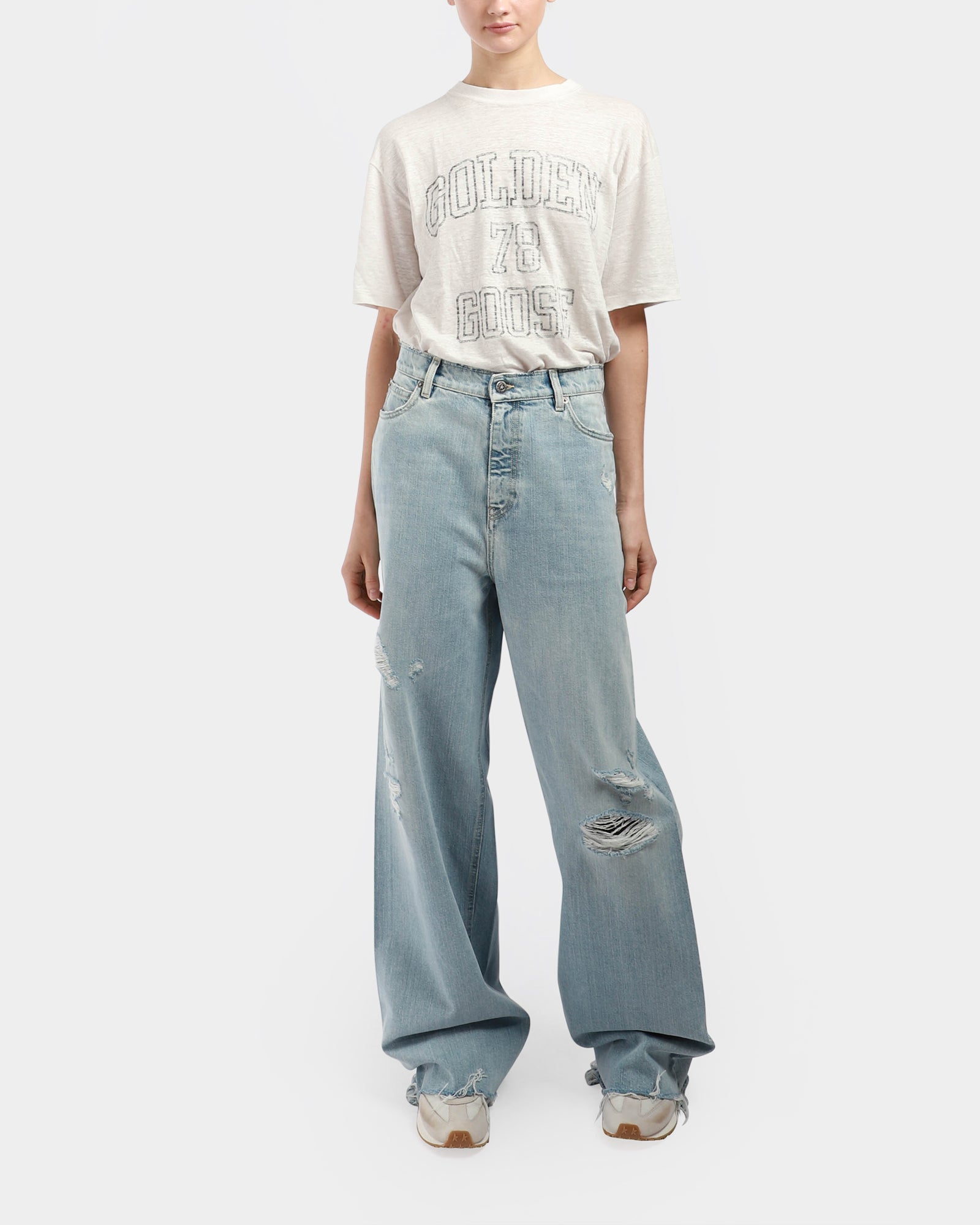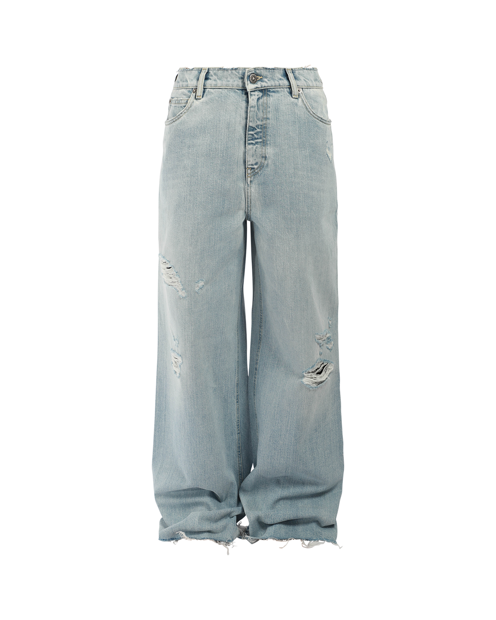 Inspired by the energy of the '90s, these bleached, oversized denim pants with rips and five pockets celebrate unity, music, and shared dreams. Made in Italy.