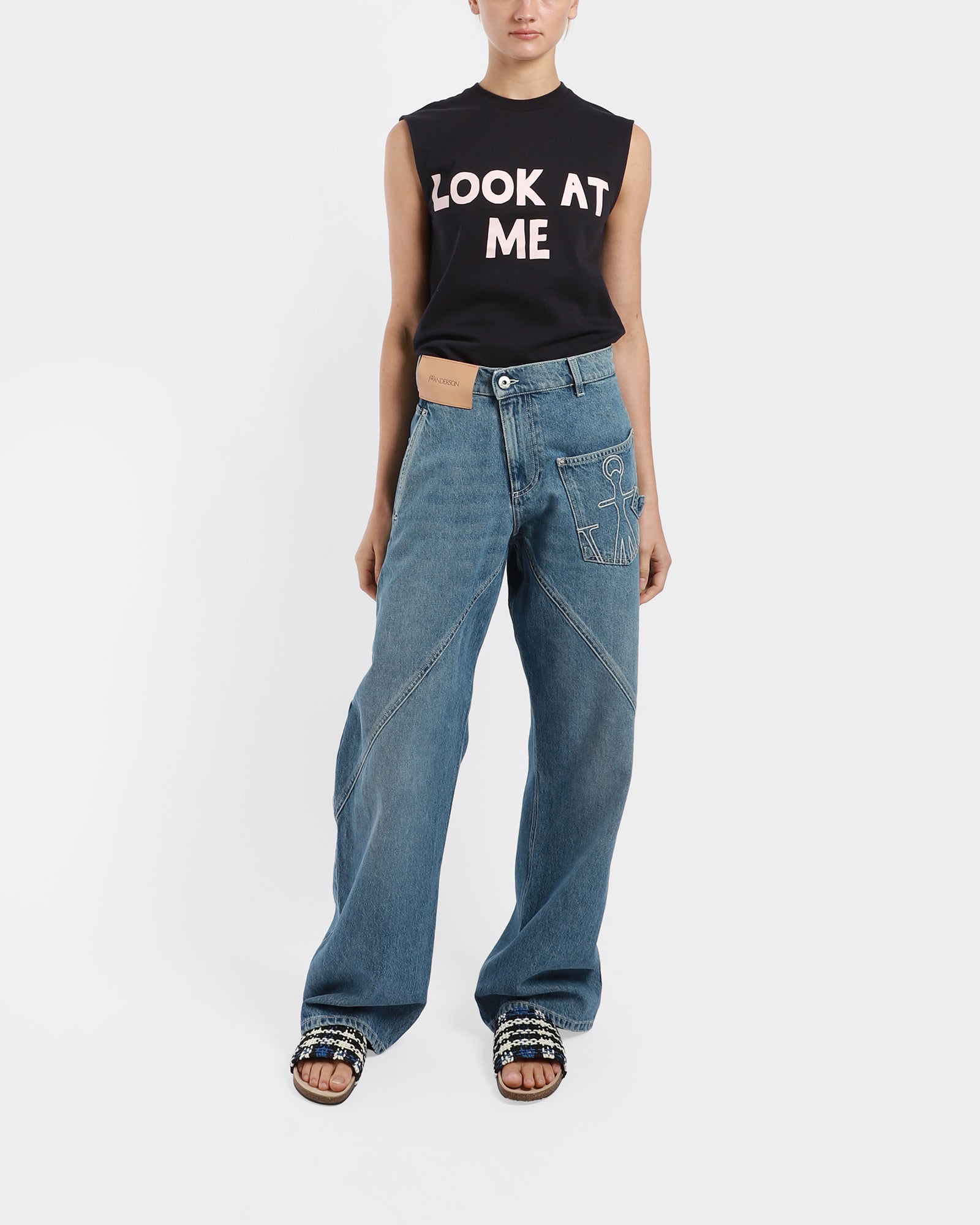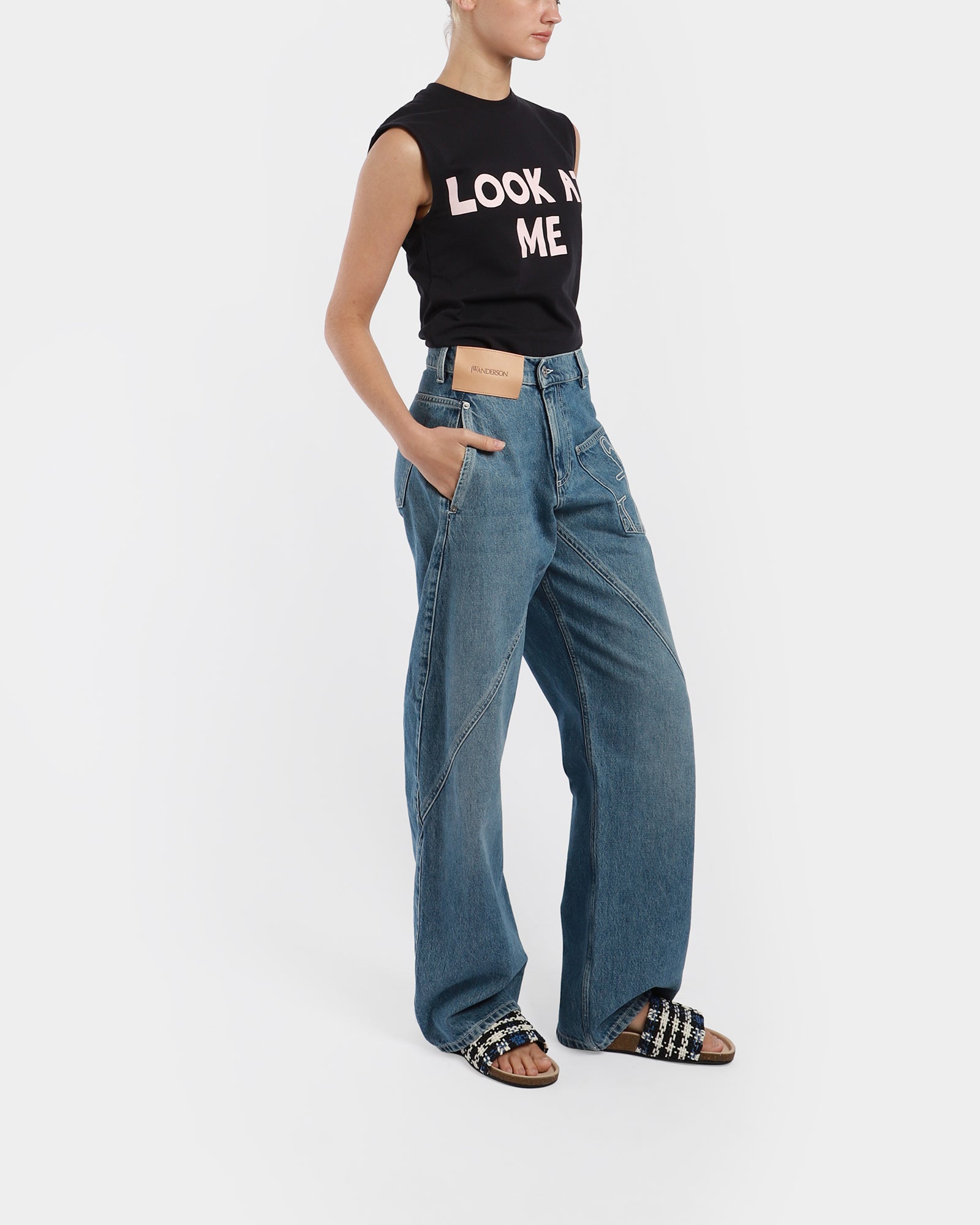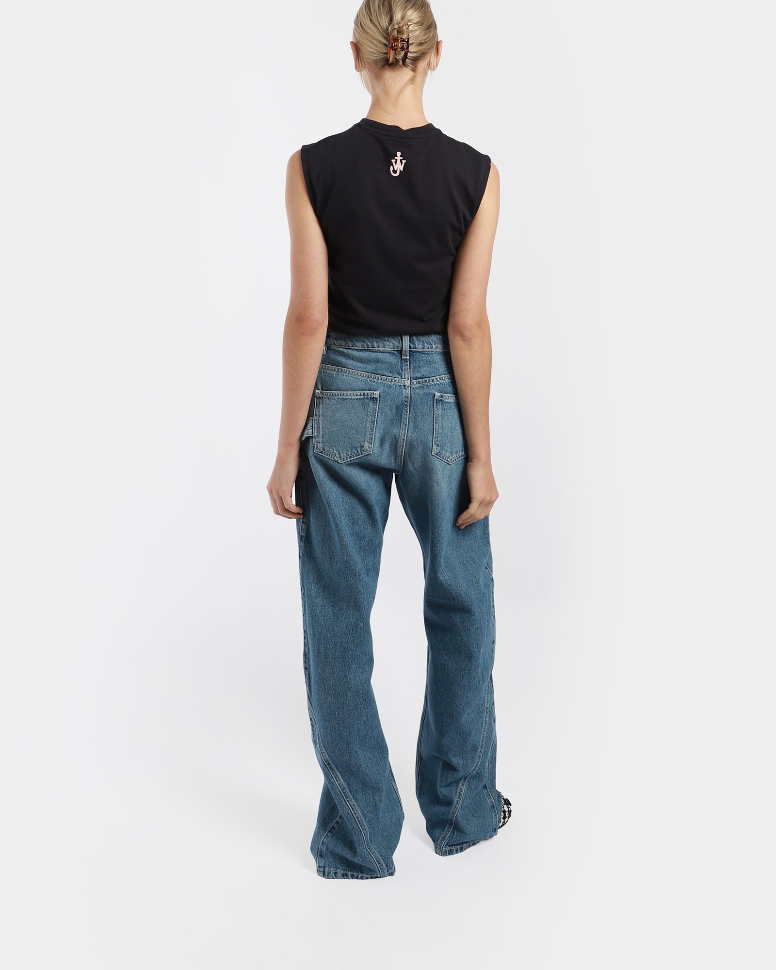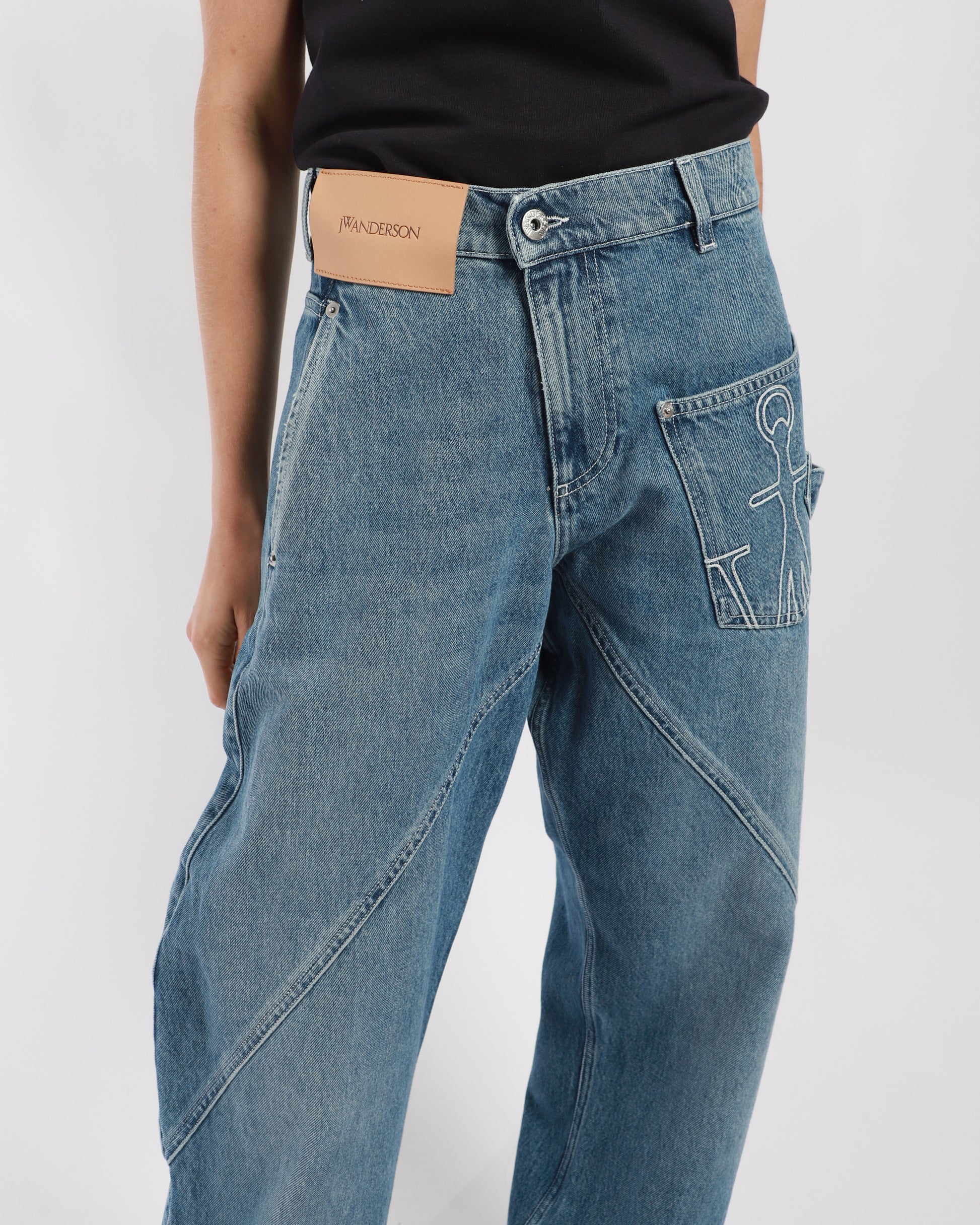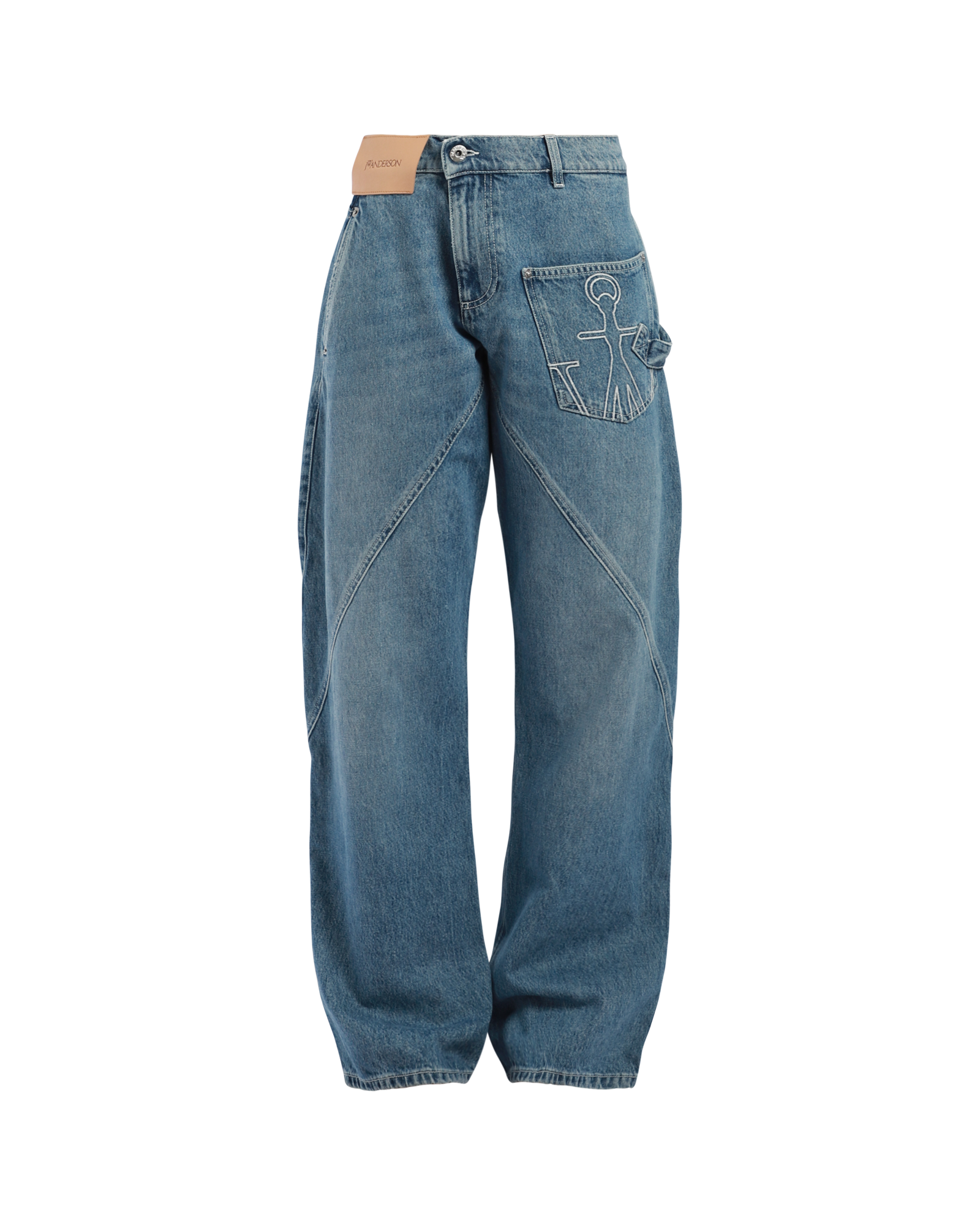 The Twisted Workwear Jeans by JW Anderson are lightweight and tailored for a relaxed fit. They have a twisted silhouette with curved seams and are designed to sit low on the waist. The jeans feature a front patch pocket, a single side-seam pocket, and a back patch pocket.