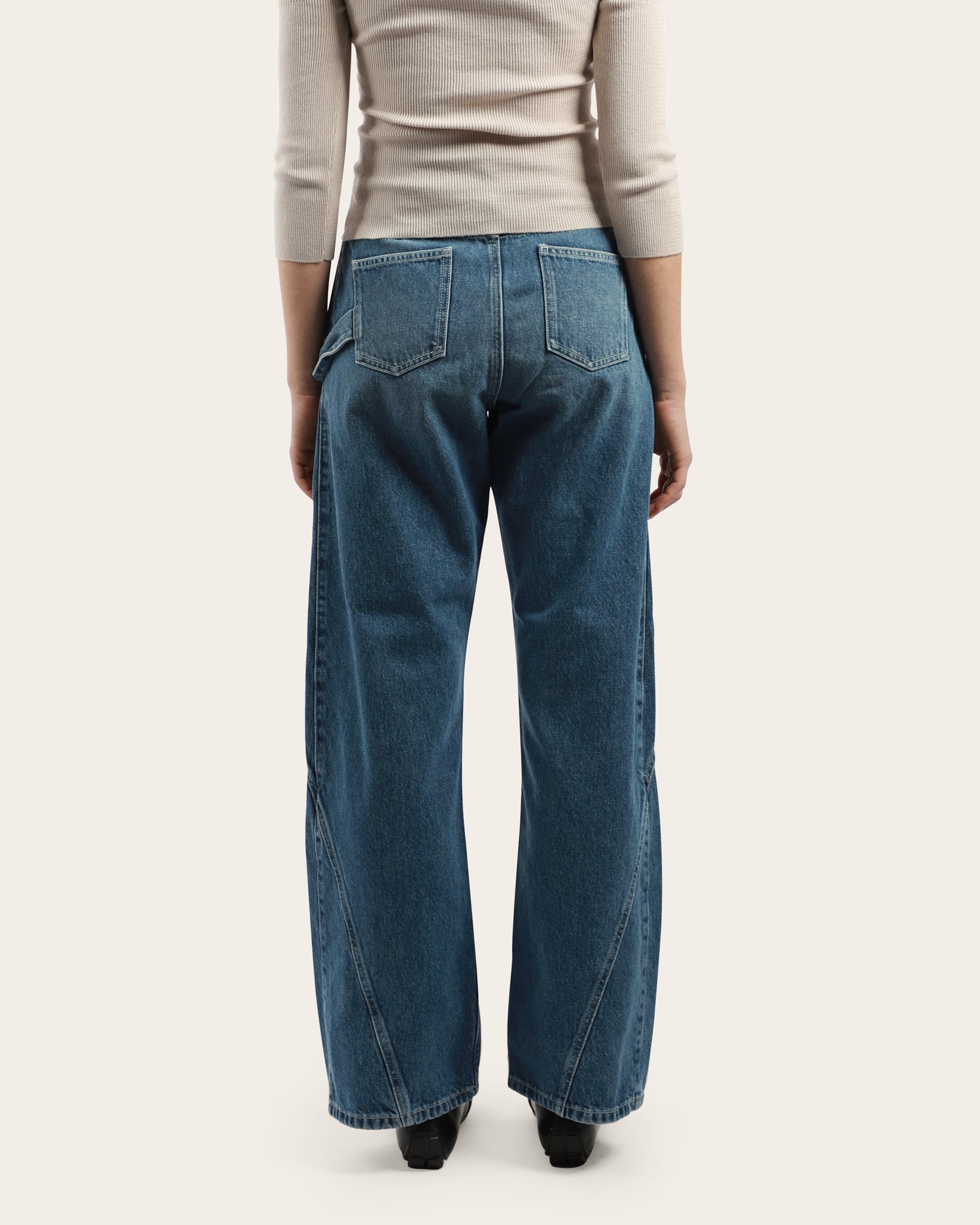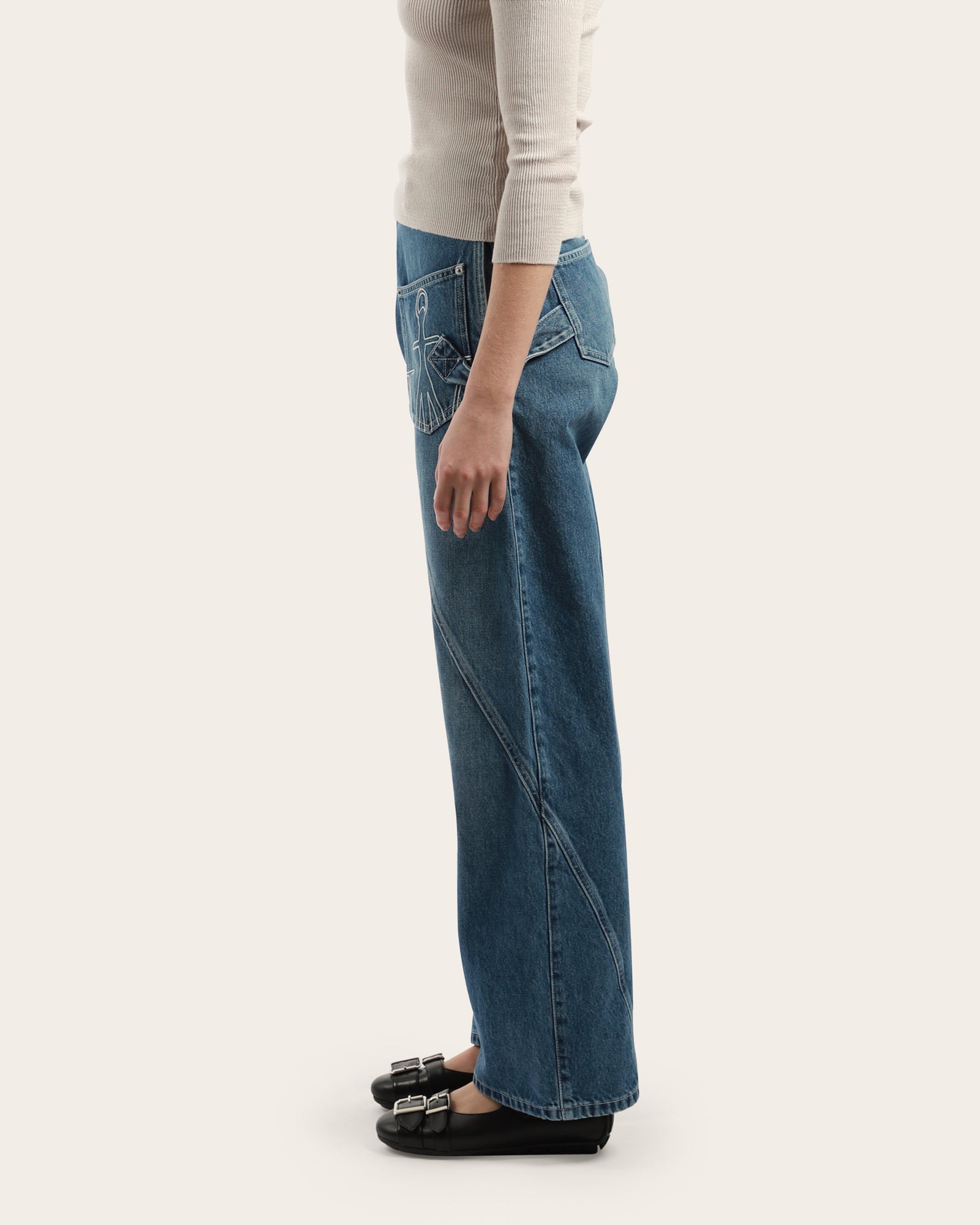 Relaxed fit jeans with a twisted silhouette and curved seams, sitting low on the waist. Features a carpenter loop, front patch pocket with anchor profile stitching, and a logo-embossed pecan leather patch. Finished with contrast tobacco topstitching and silver-tone hardware. Made in Italy.