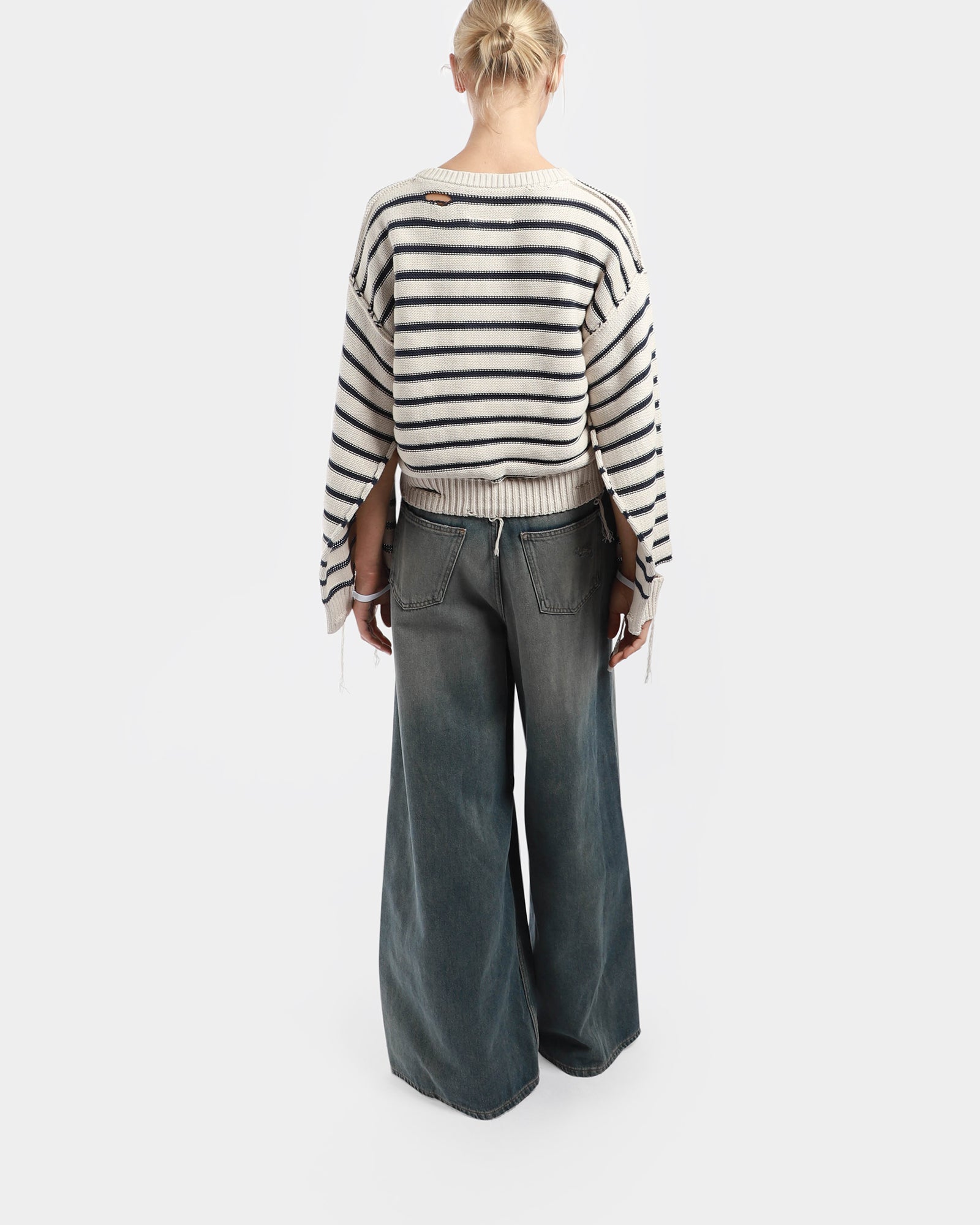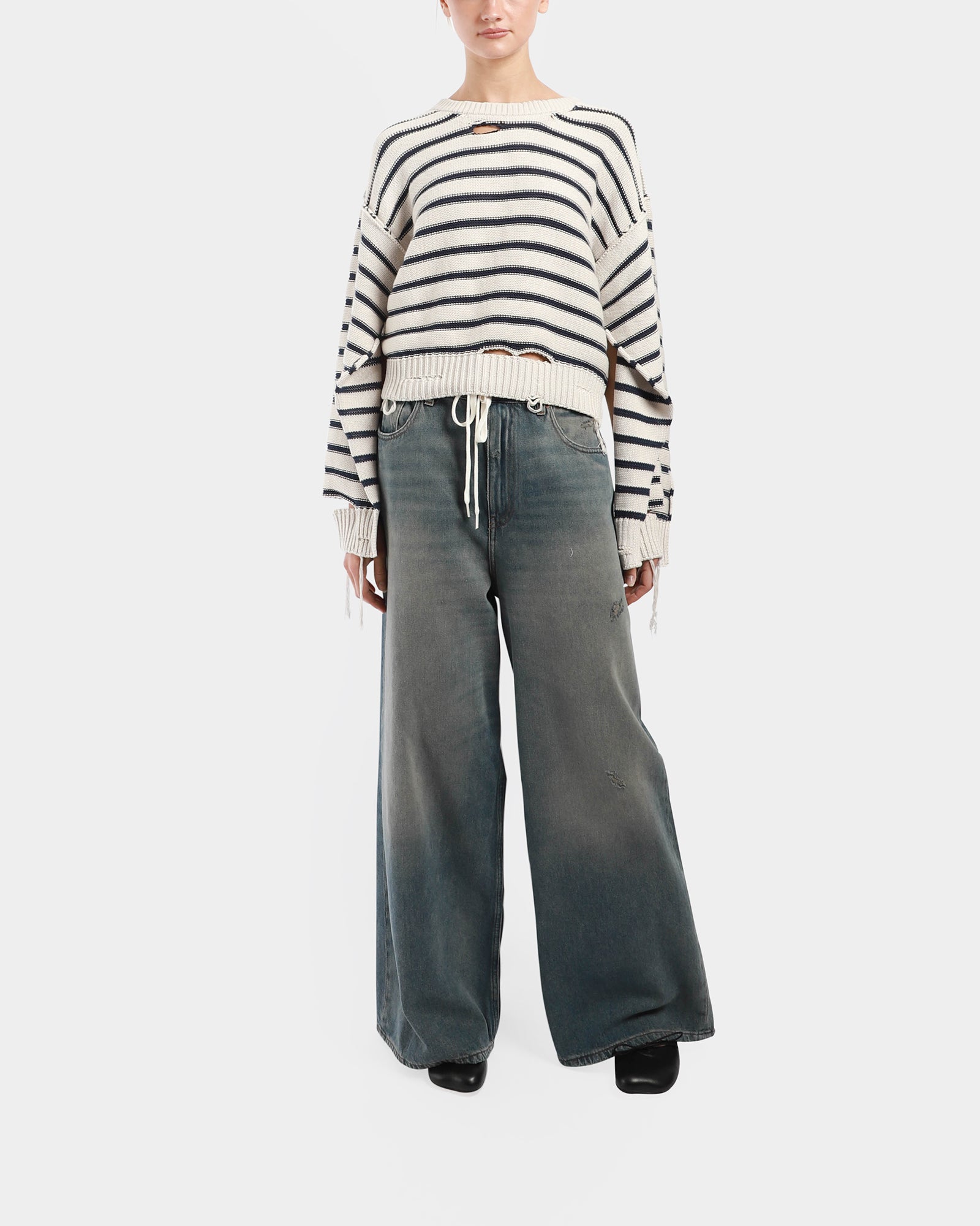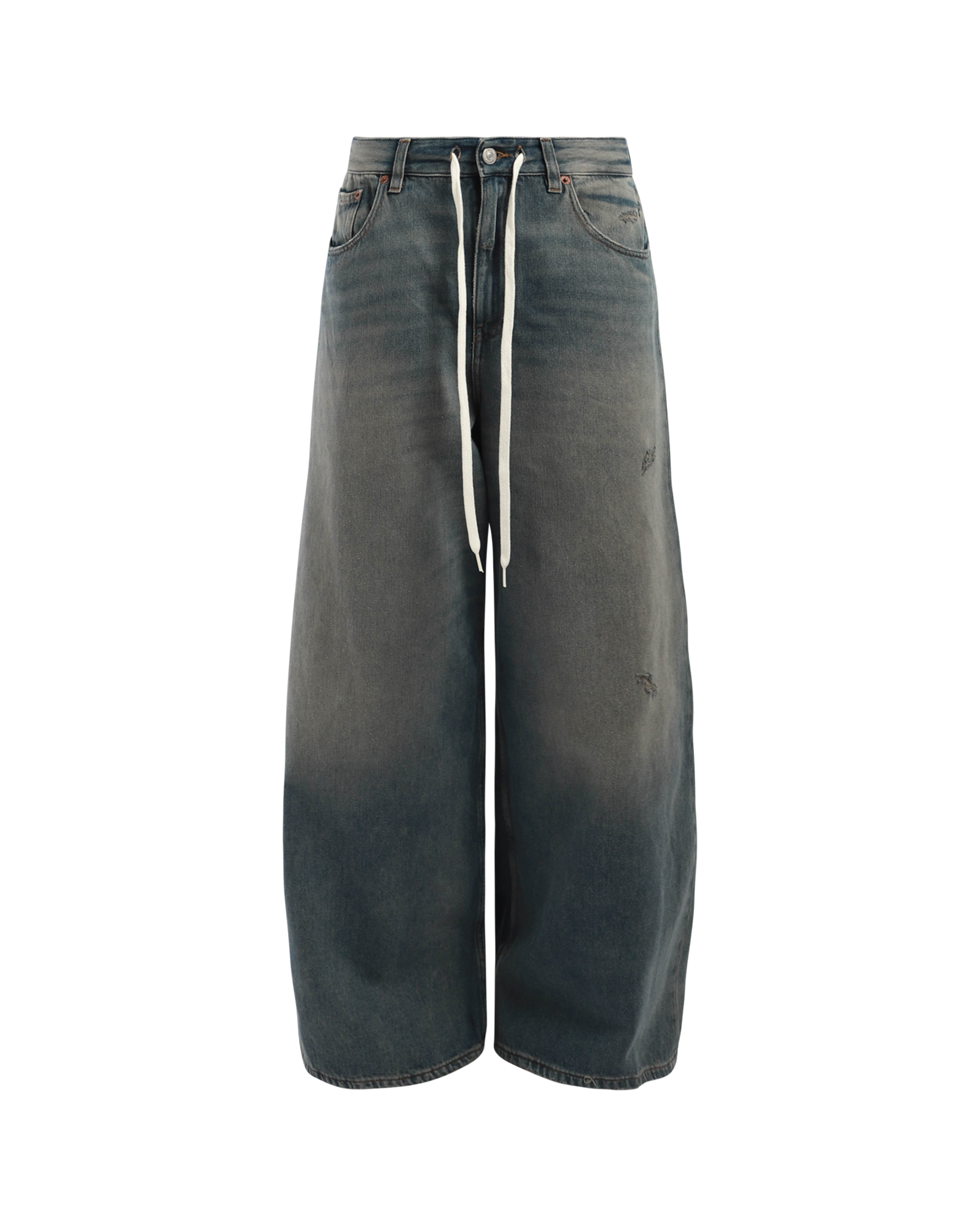 These wide leg jeans, non-stretch fabric, have a fading and distressing look. There are belt loops and a drawstring at waistband to adjust.