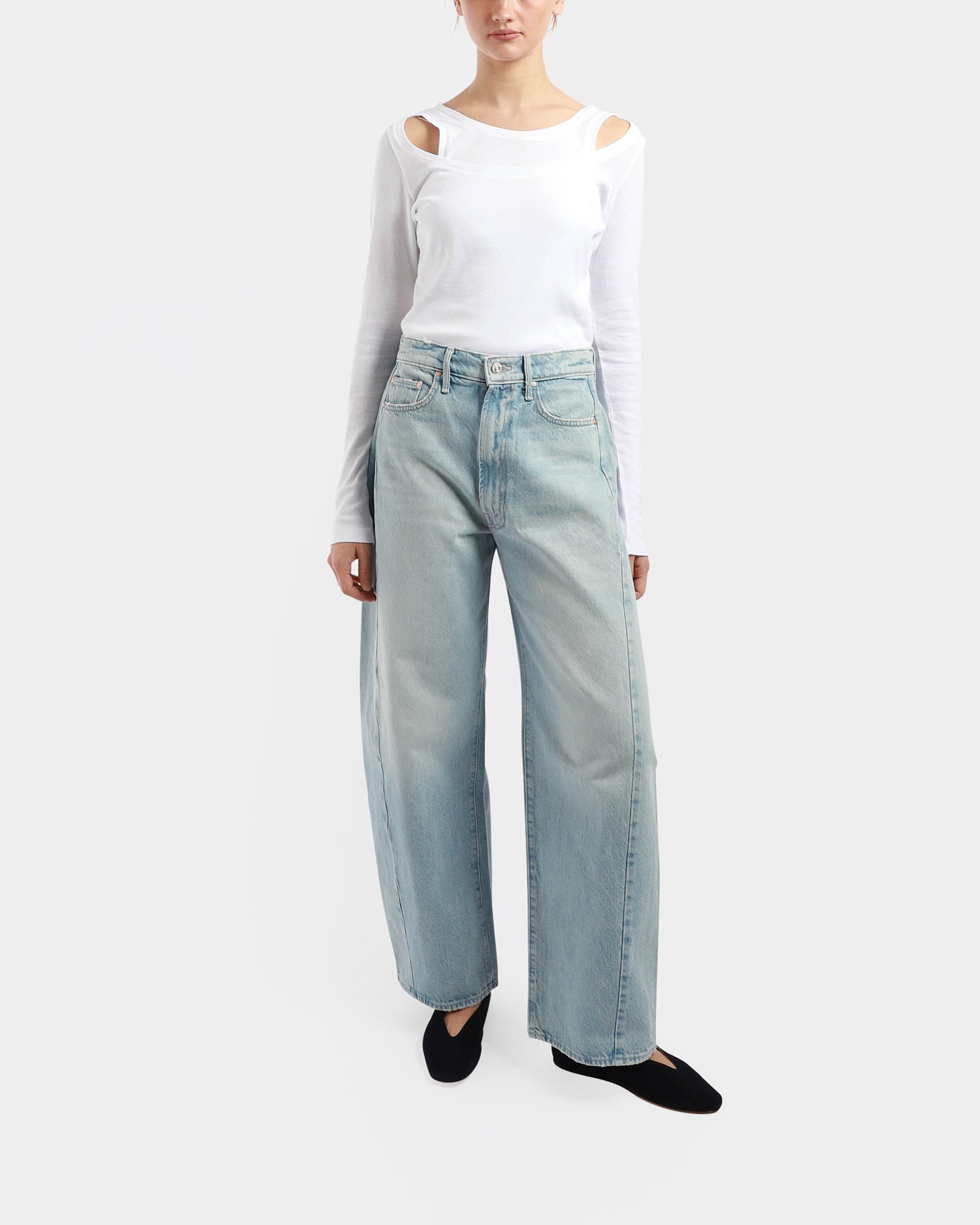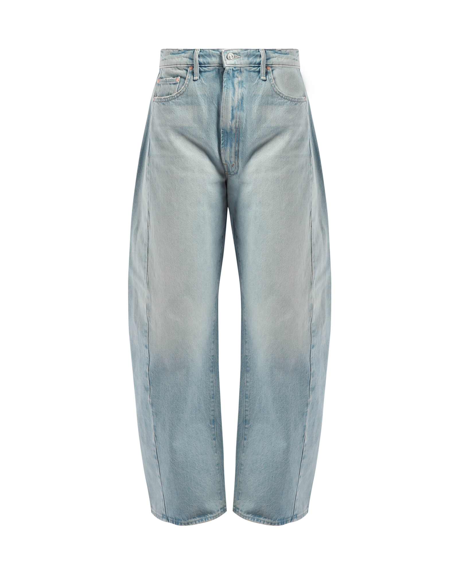 Super high-waisted barrel-leg jeans in rigid light blue denim with a 28.25 inch inseam, clean hem, and distressed details. Made in Los Angeles.