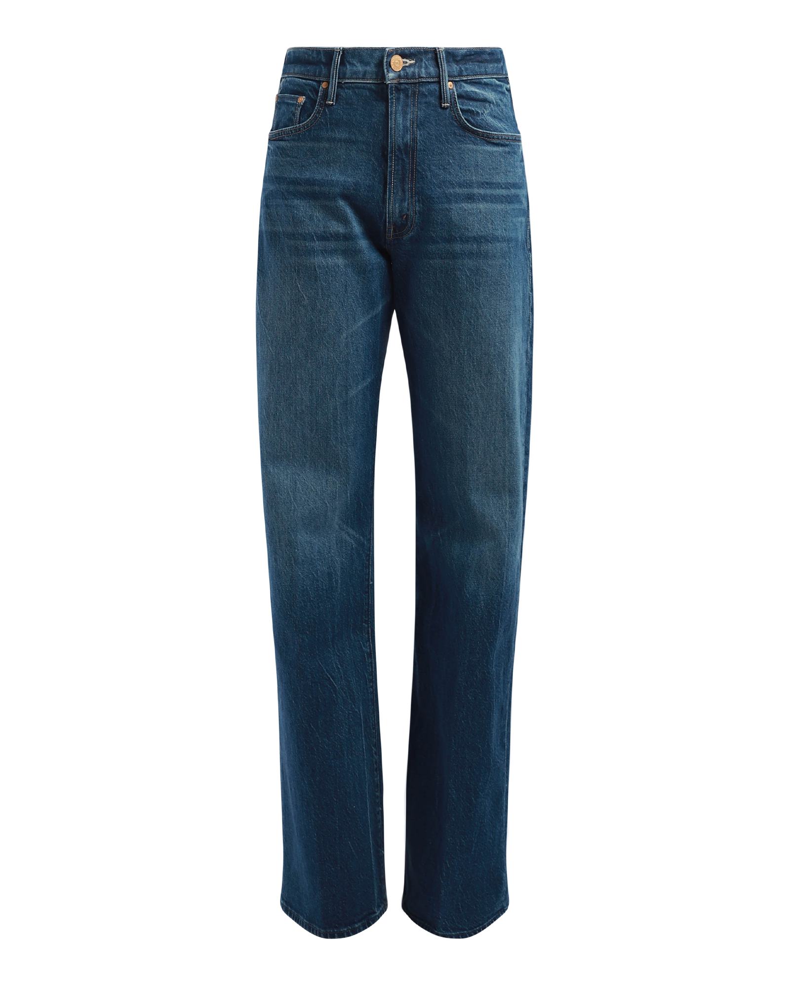 Super high-rise wide-leg jeans in stretchy mid-blue denim with a 32inch inseam, whiskering, and faded knees.