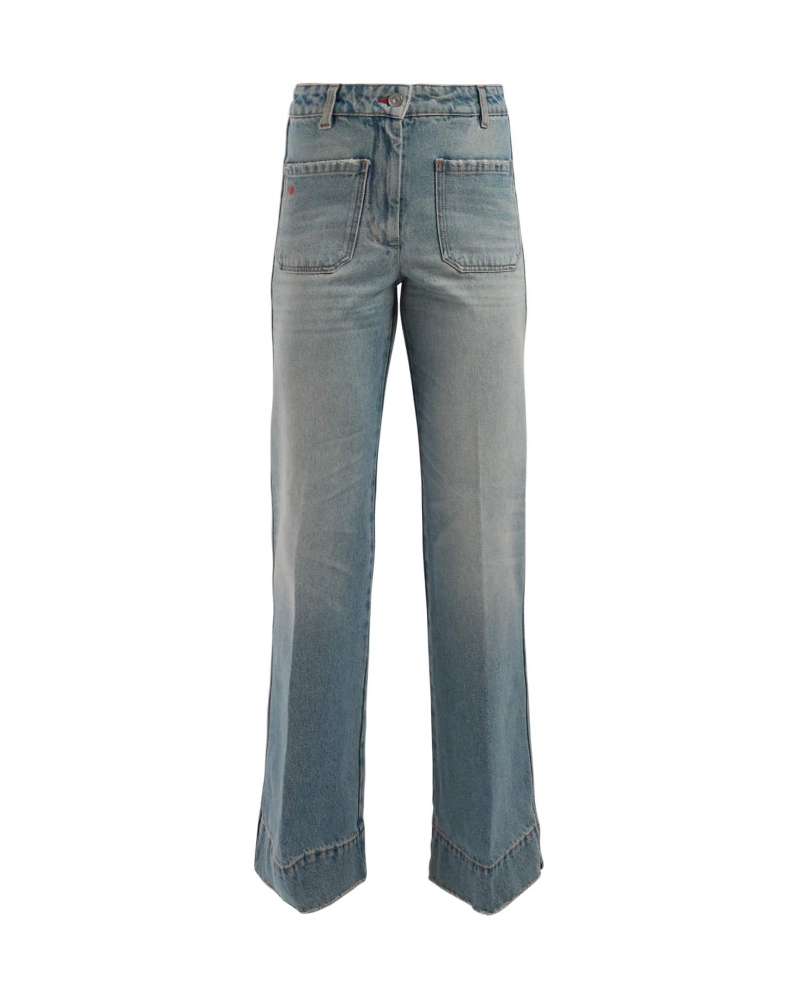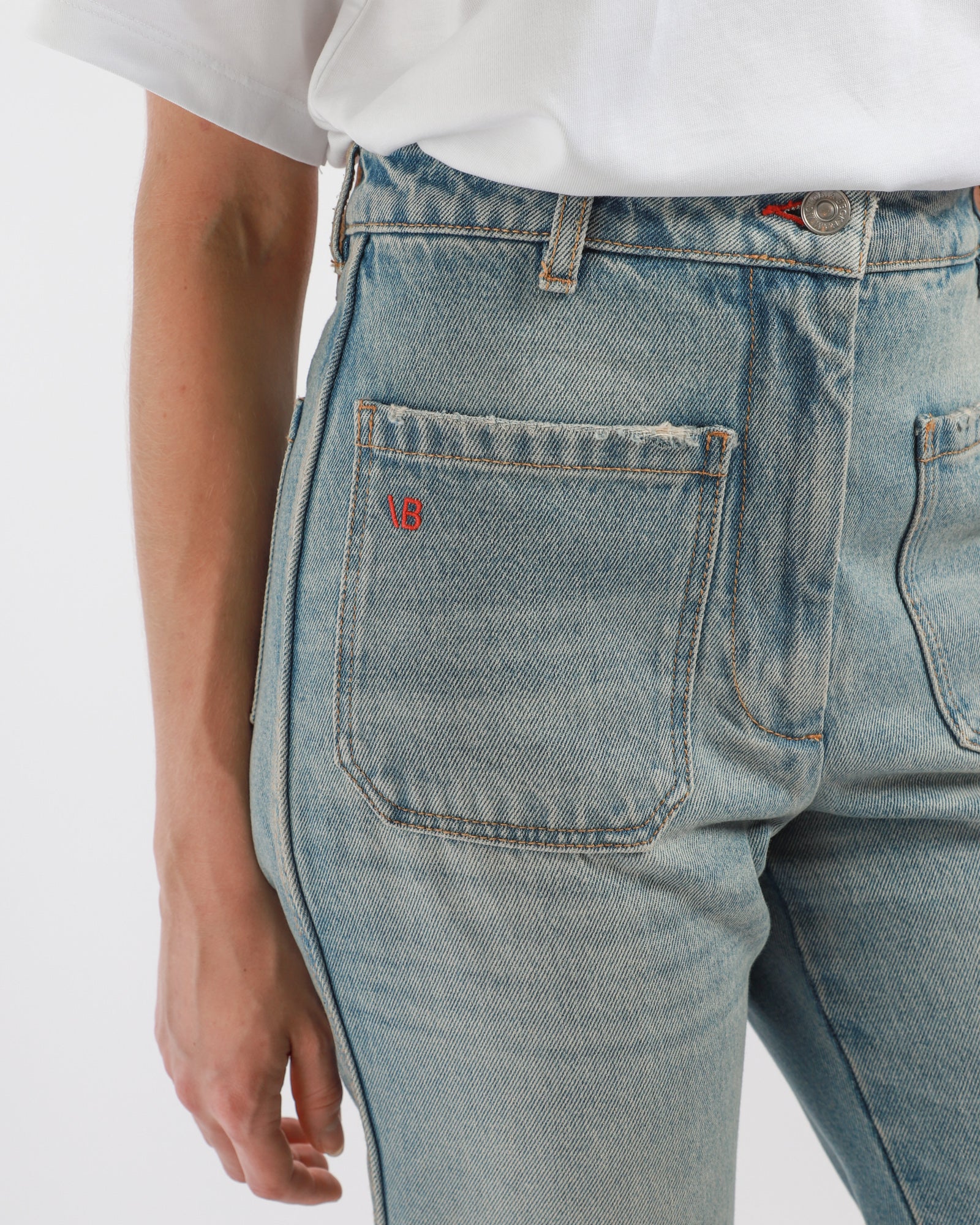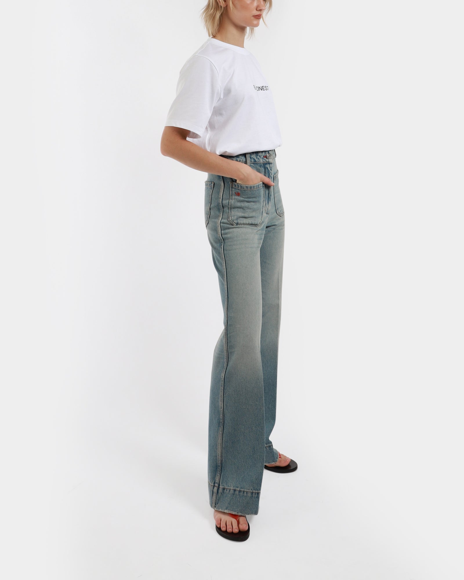 The Alina Jean captures a classic ’70s-inspired style with its relaxed wide-leg silhouette, front and back patch pockets, and distinctive contrast branded stitching. Made in Italy.