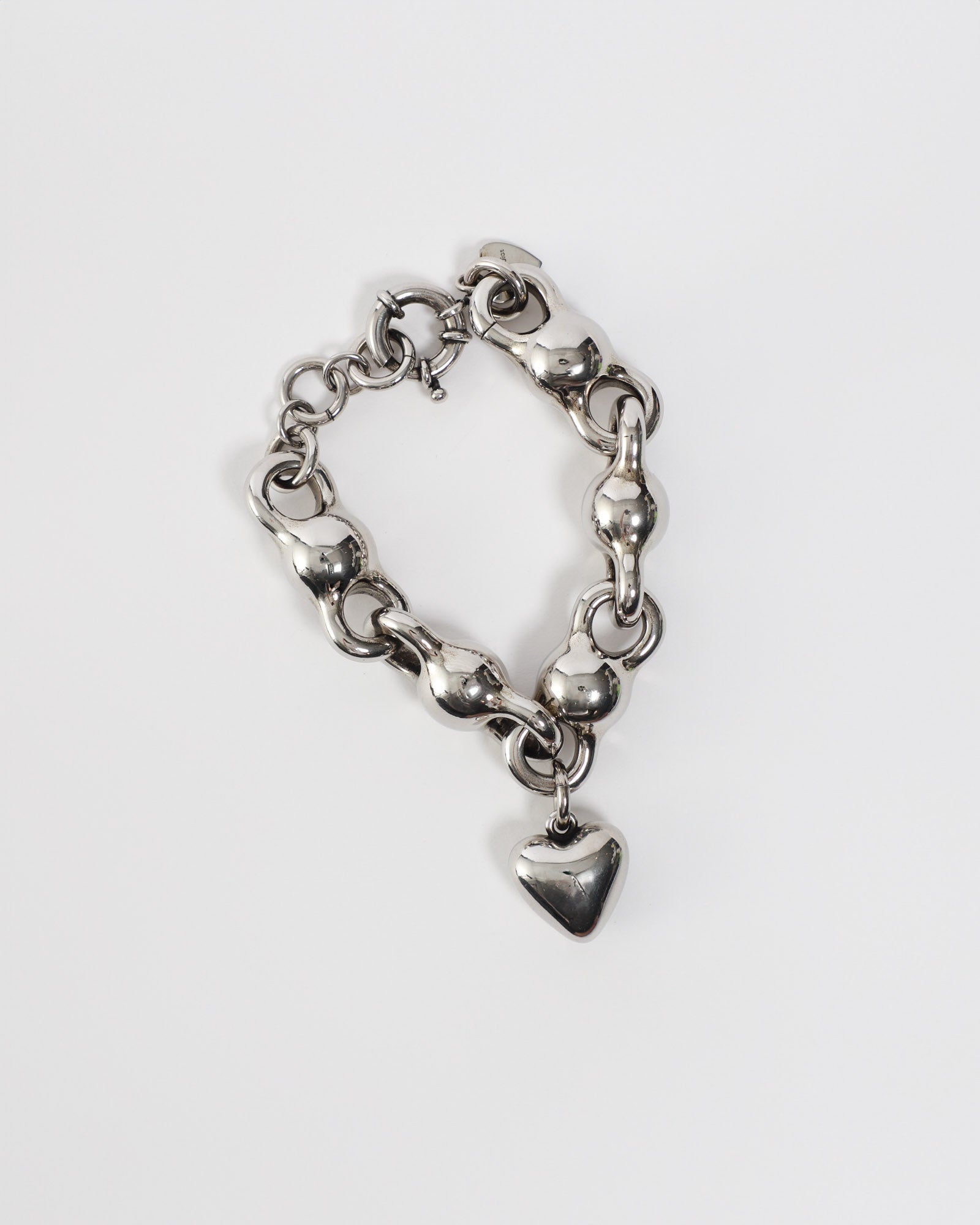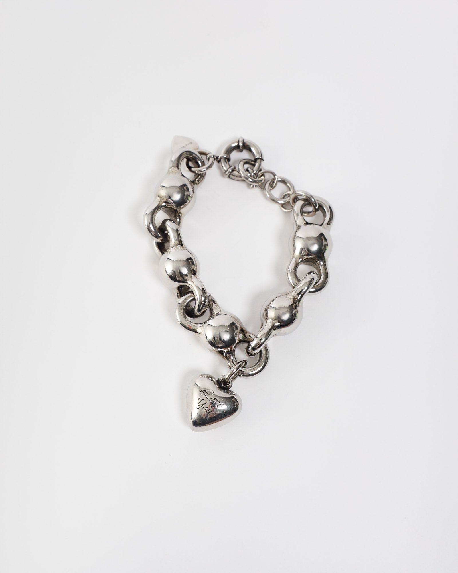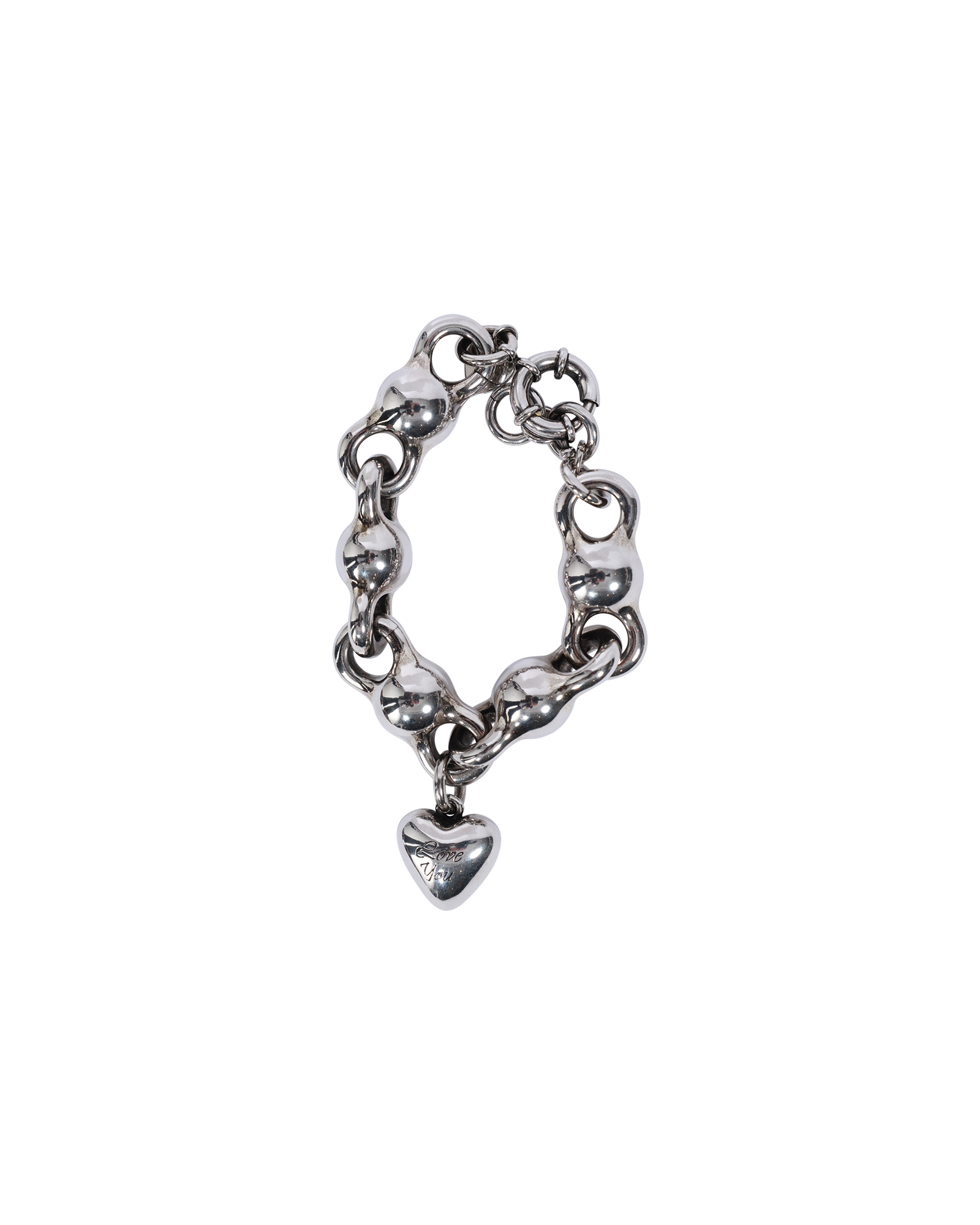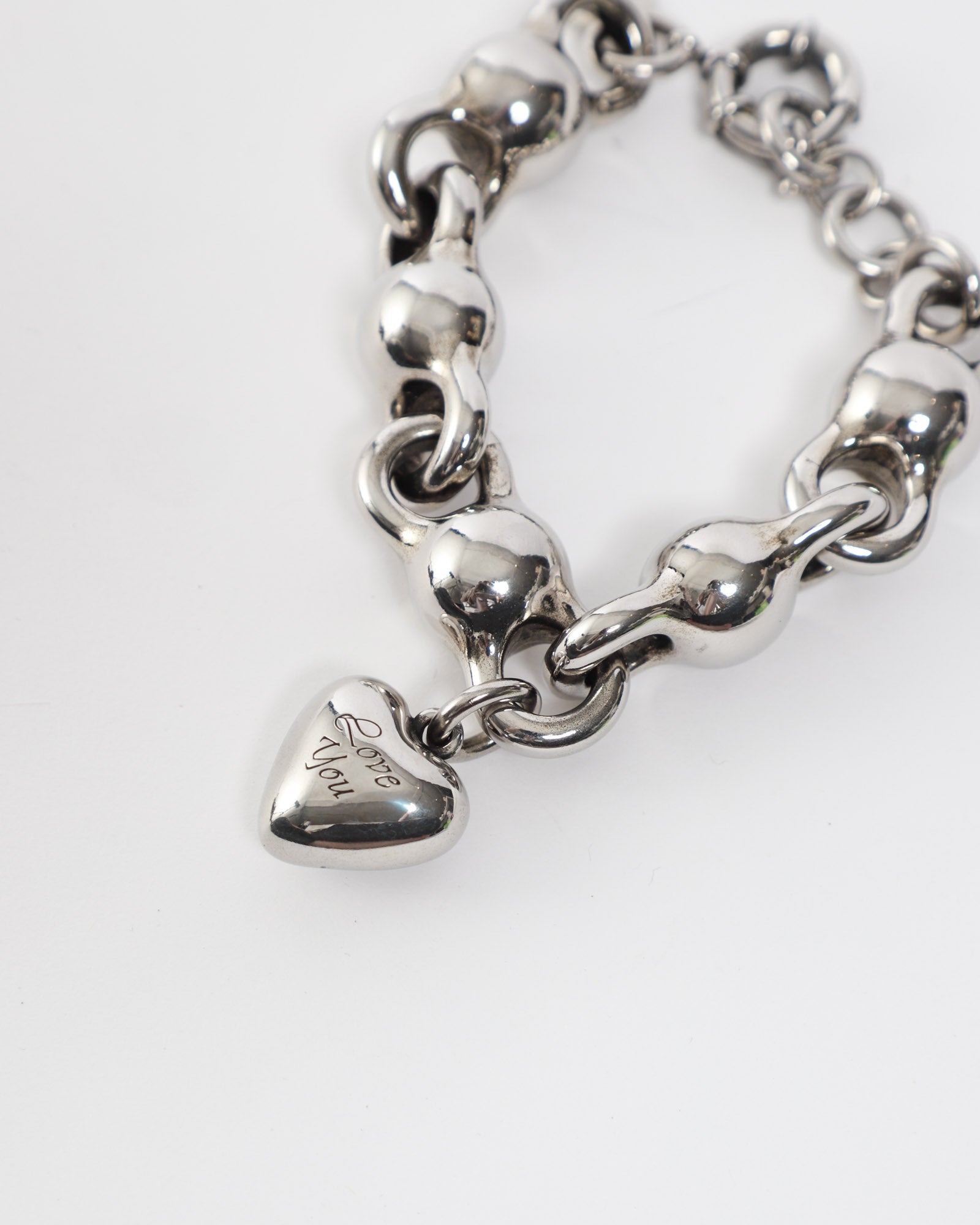 This Acne Studios bracelet showcases a sculptural chain construction with a heart-shaped charm engraved with the words 'Love you'. It is complemented by a smaller heart-shaped branding at the closure and is crafted from brass with an antique finish.