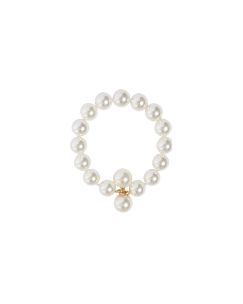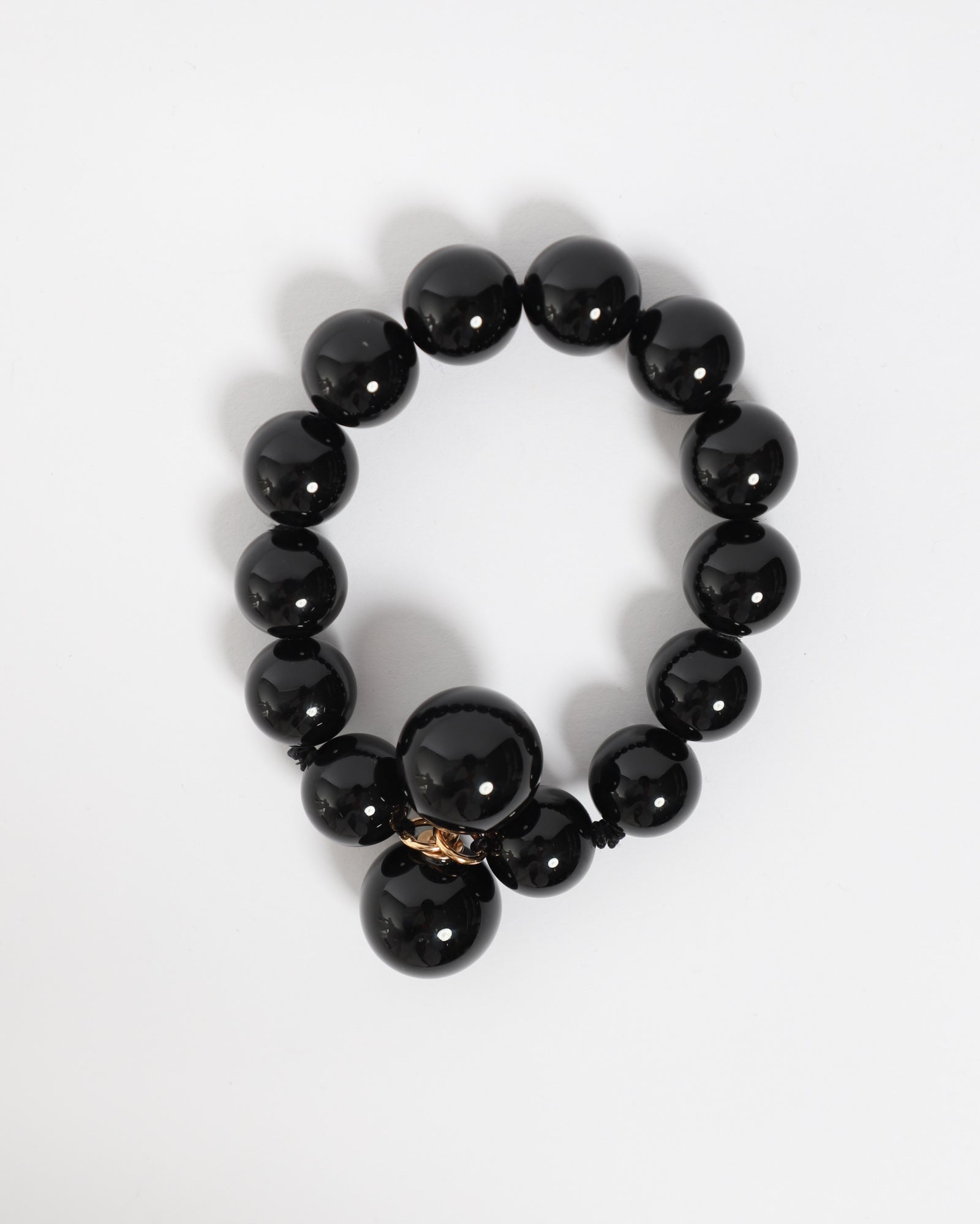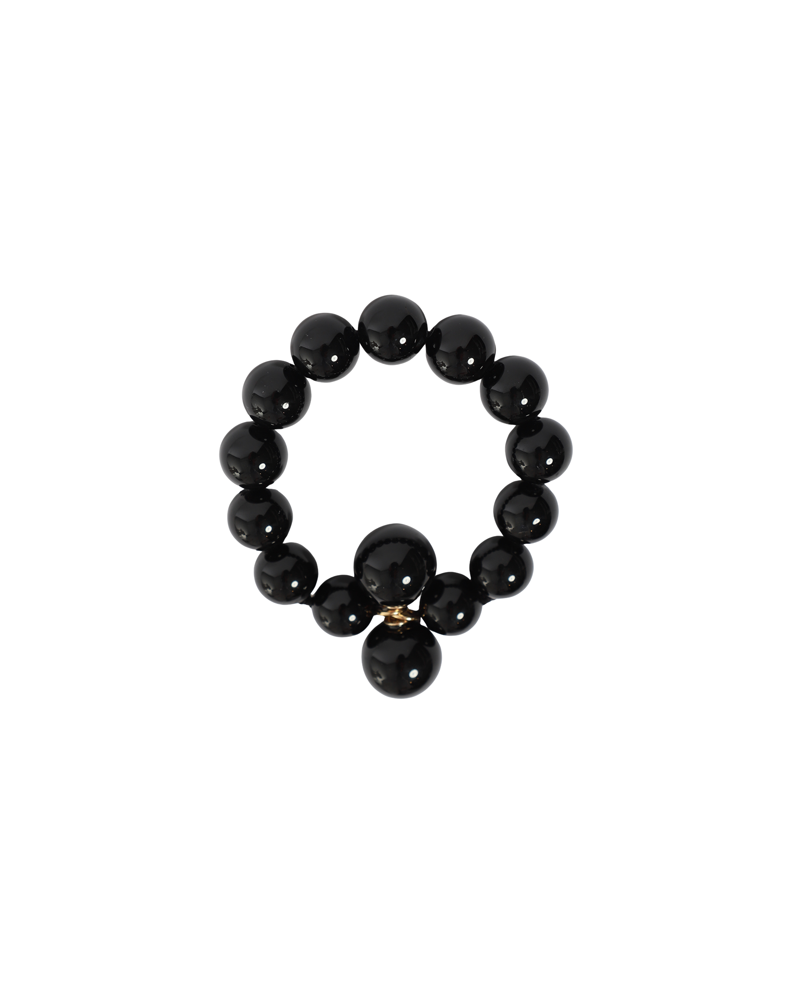 The Black Bandage Bracelet by Beatriz Palacios is a gold-plated sterling silver piece featuring 14mm onyx beads, with a 16mm onyx earring piece. The earring doubles as the chain’s clasp, offering versatile styling options. Handmade in Spain.