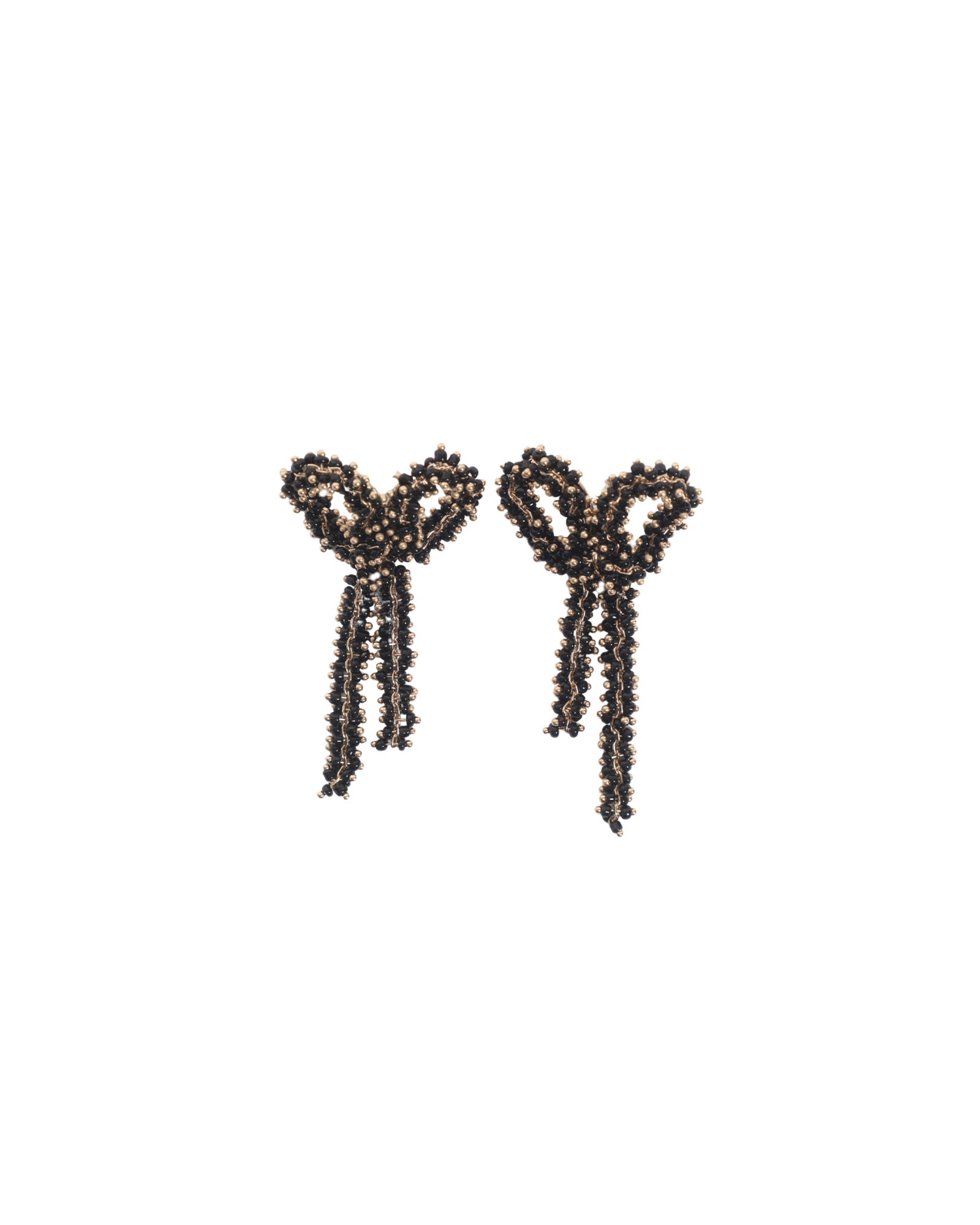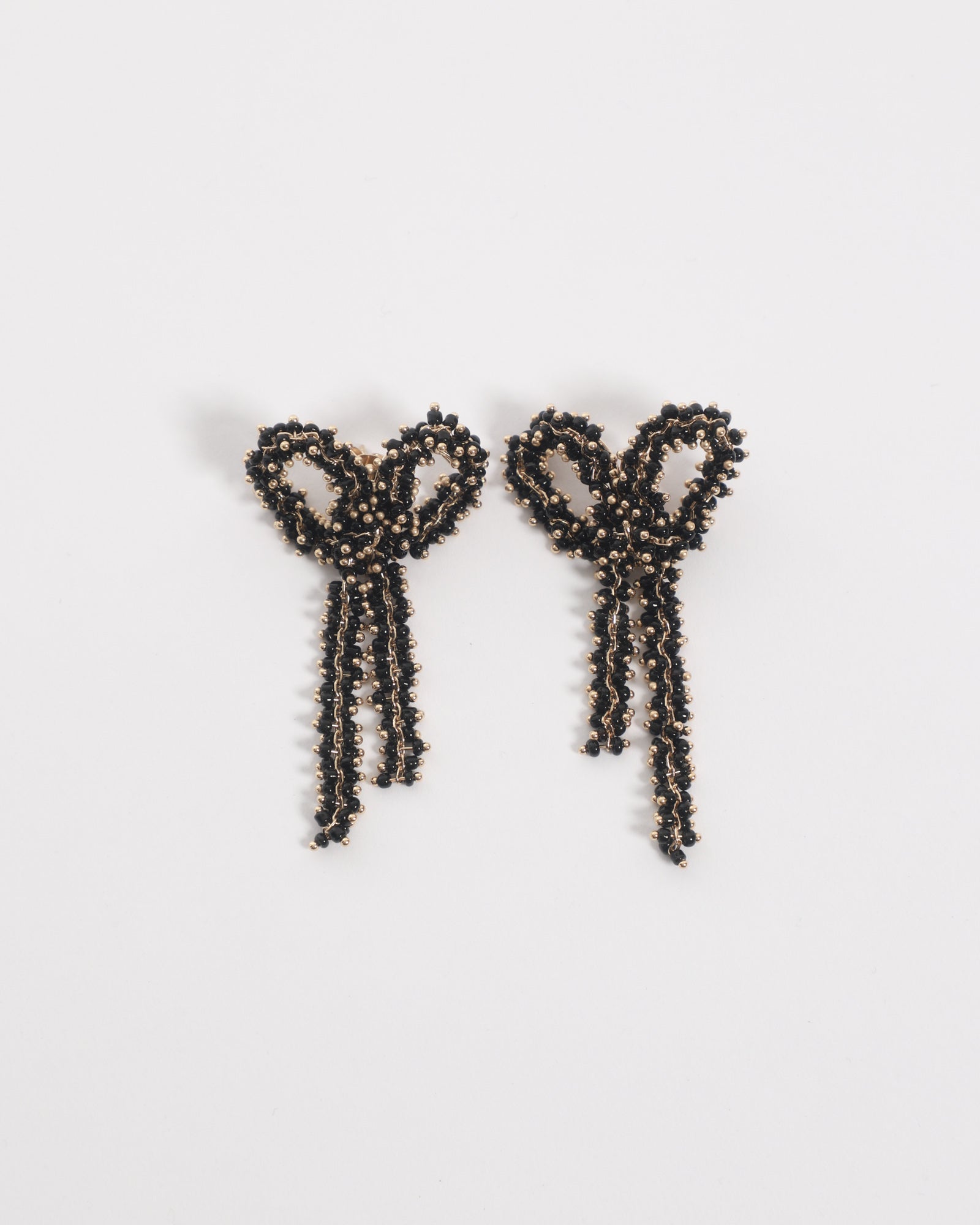 The Black Bow Earrings are handmade in Spain, and feature a gold-plated sterling silver base adorned with glimmering black glass beads. They fasten securely with a post-back closure, and are sold as a pair.