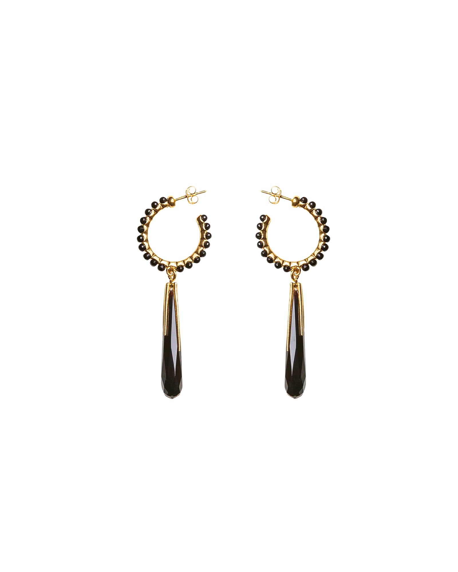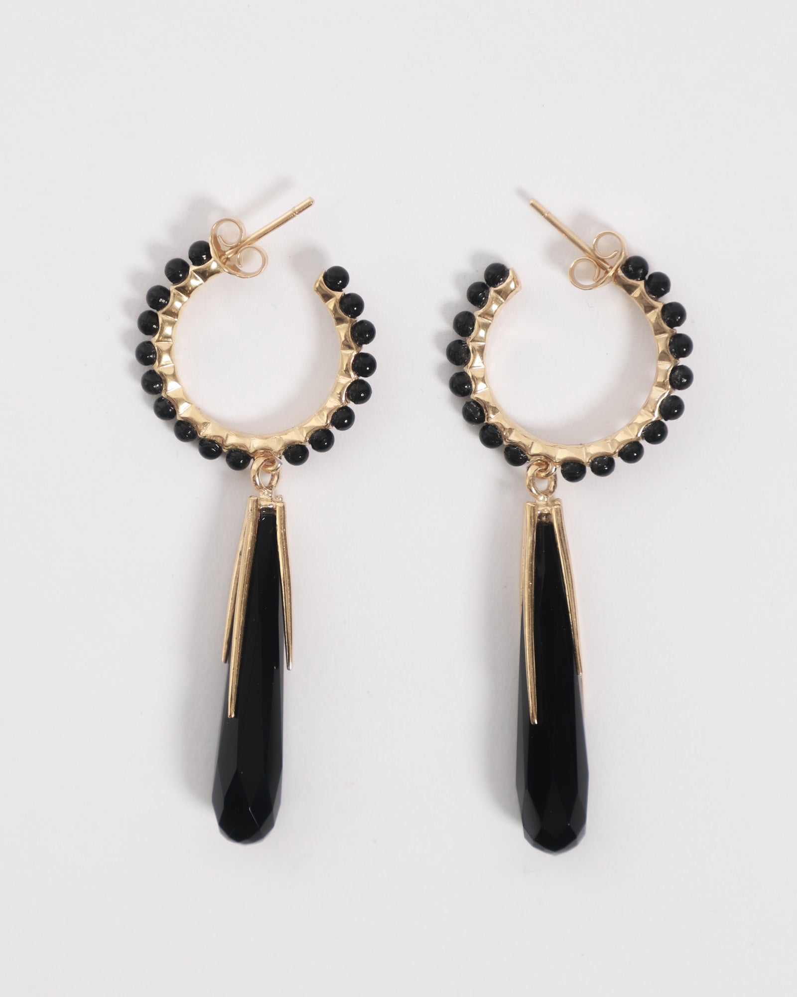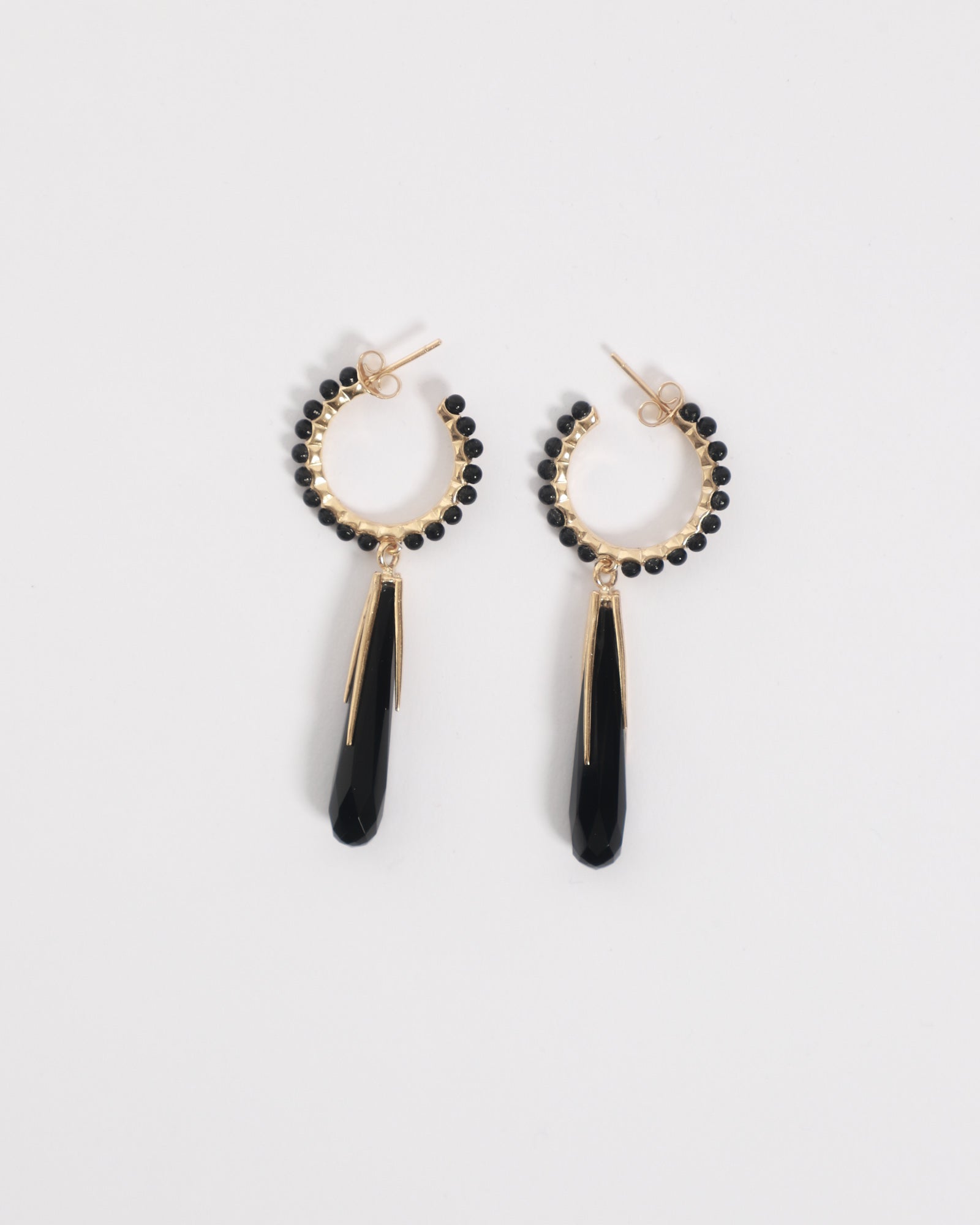 The Mourning Earrings are handmade in Spain, and feature a gold-plated sterling silver base adorned with glimmering black glass beads, and a hand carved onyx pendant. They fasten securely with a post-back closure, and are sold as a pair.