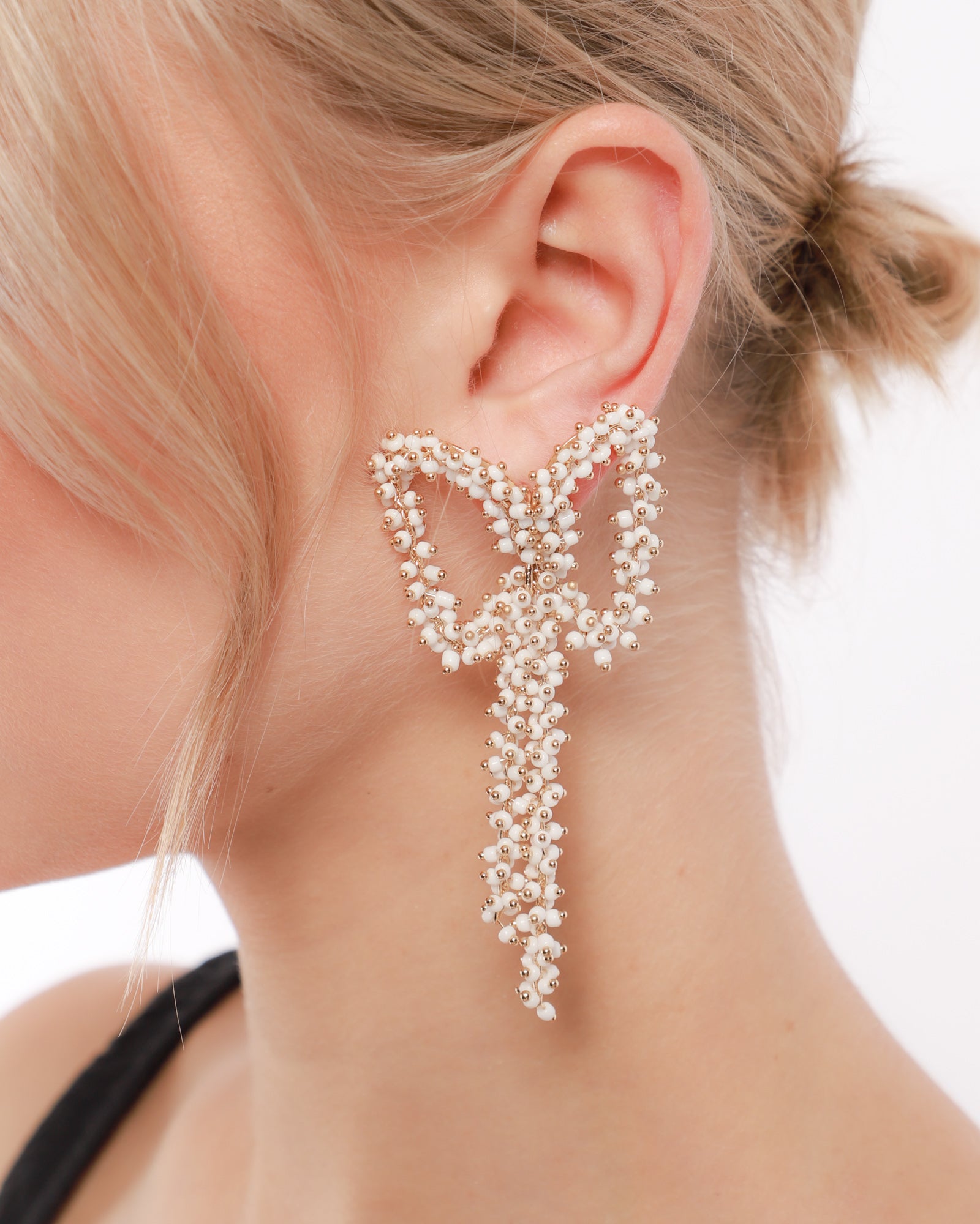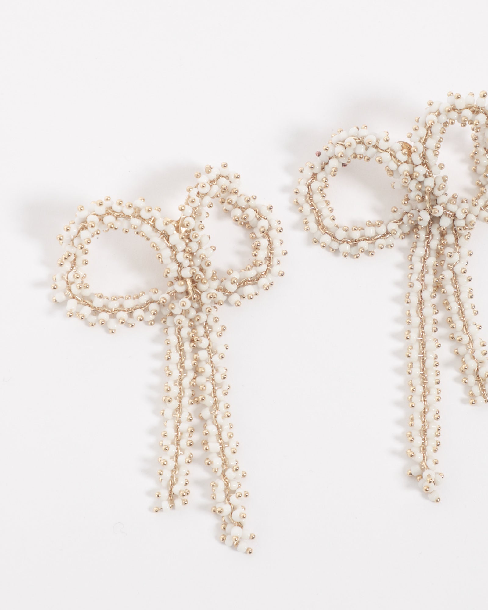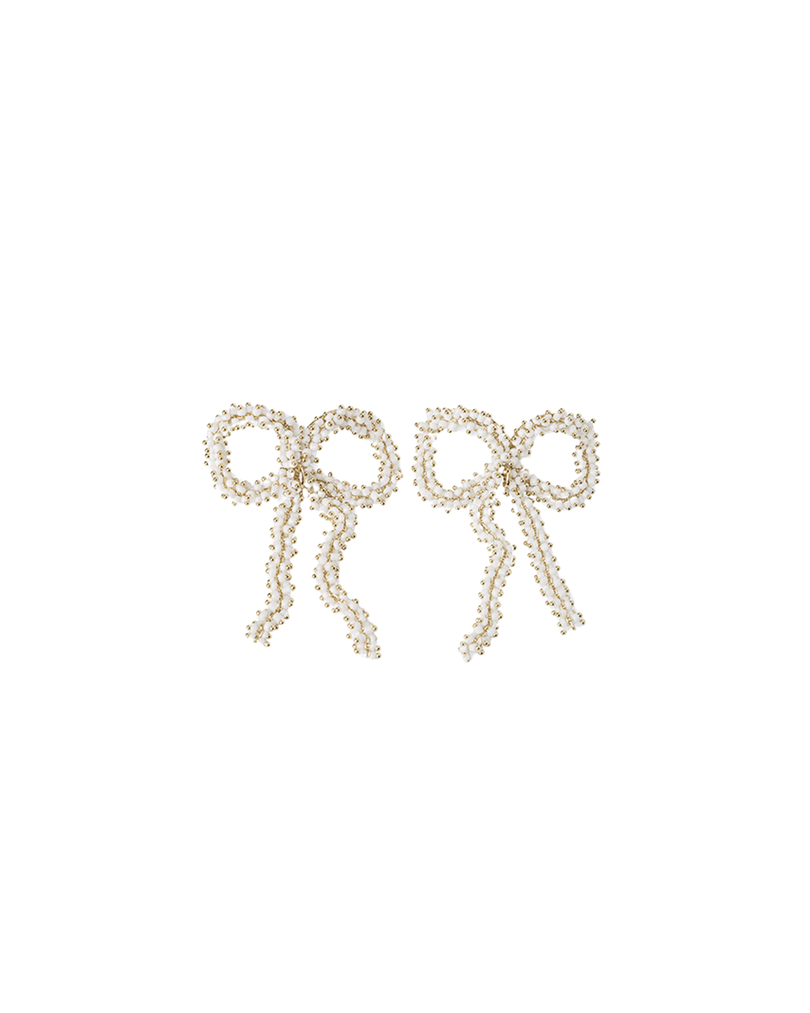 The White Bow Earrings are handmade in Spain, and feature a gold-plated sterling silver base adorned with glimmering white glass beads. They fasten securely with a post-back closure, and are sold as a pair.