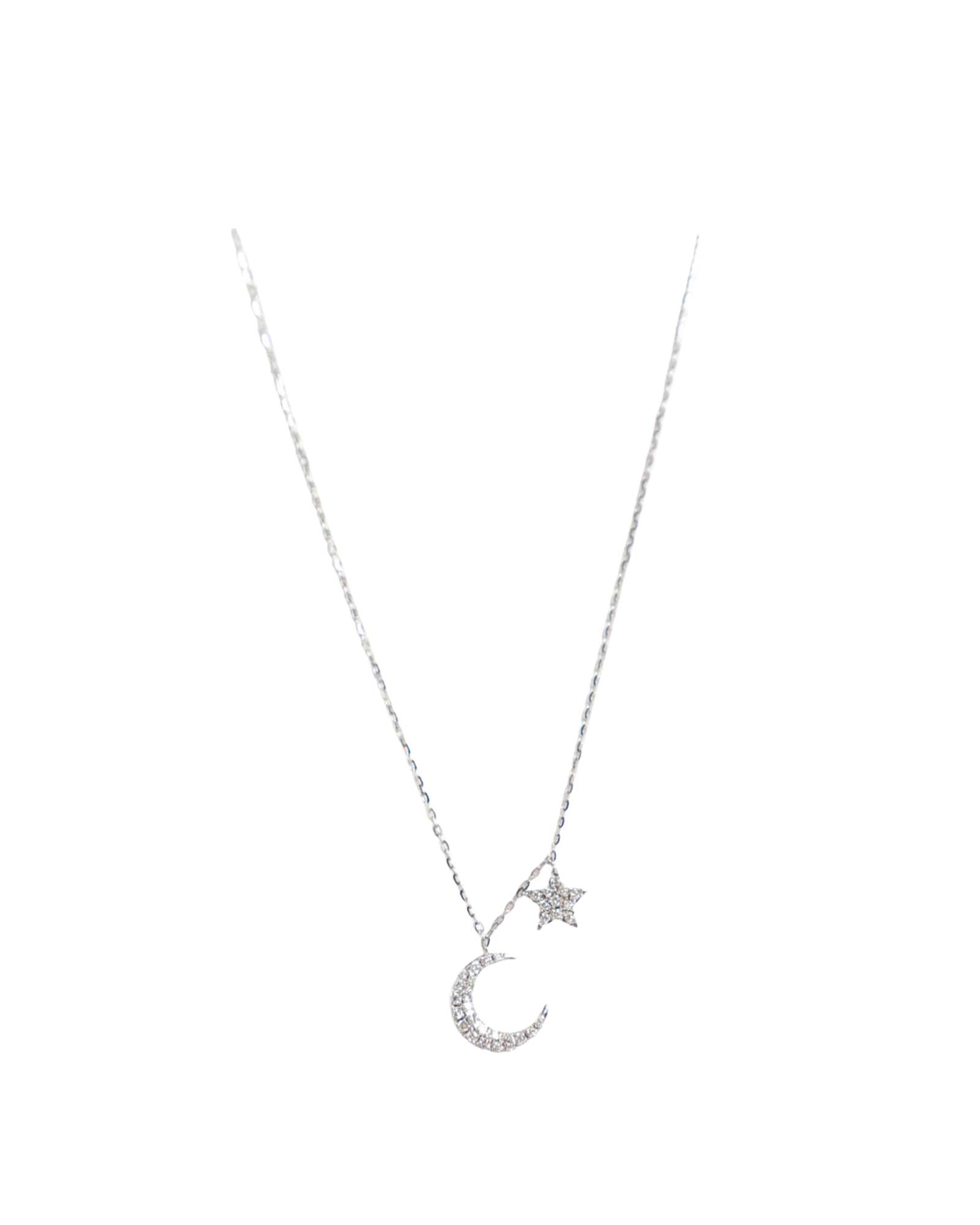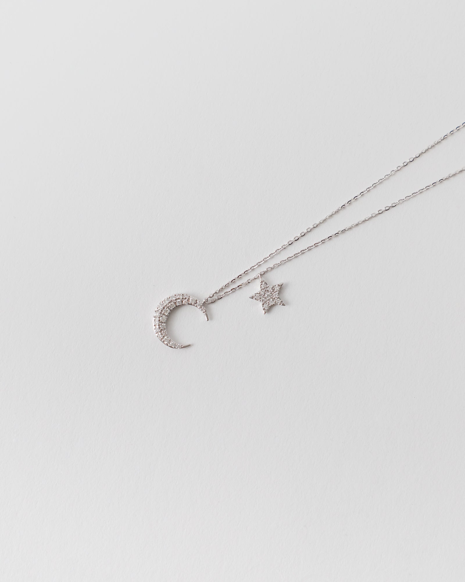 The Asteria Necklace by Constellate features a star and crescent moon on a delicate chain, adorned with diamonds and crafted from 18ct white gold. Lovingly made in Australia.