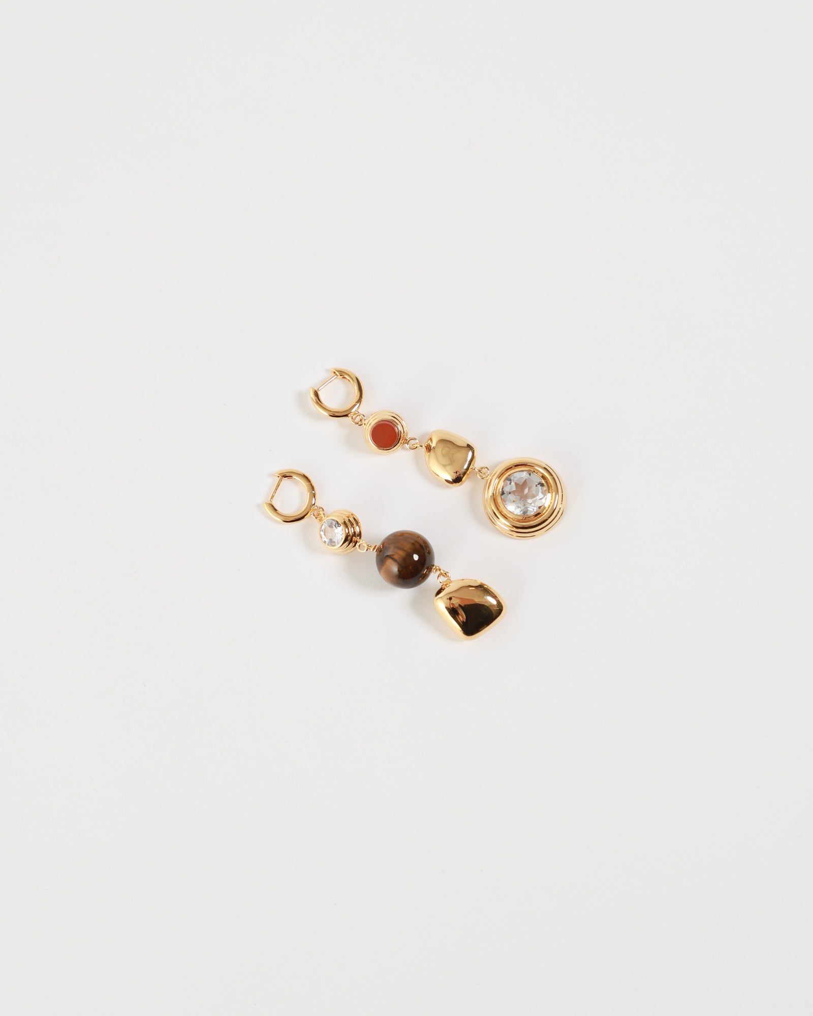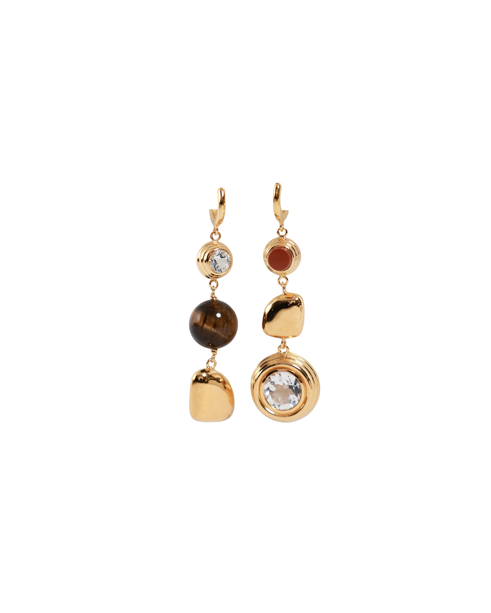 The Le Cabanon Earrings are made from 18k gold vermeil, they have an asymmetric design and feature pebbles and mismatched gemstones with a detachable 9mm hoop.