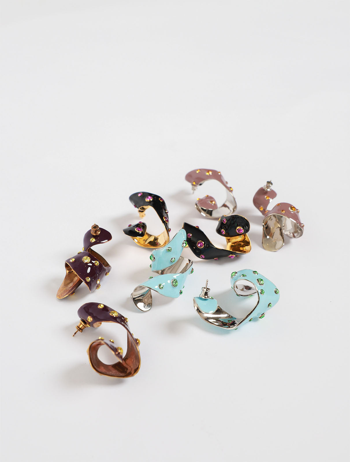 Dries Van Noten Enamel Crystal Twist Earrings, featuring Glass embellishment all over, secure lock back.