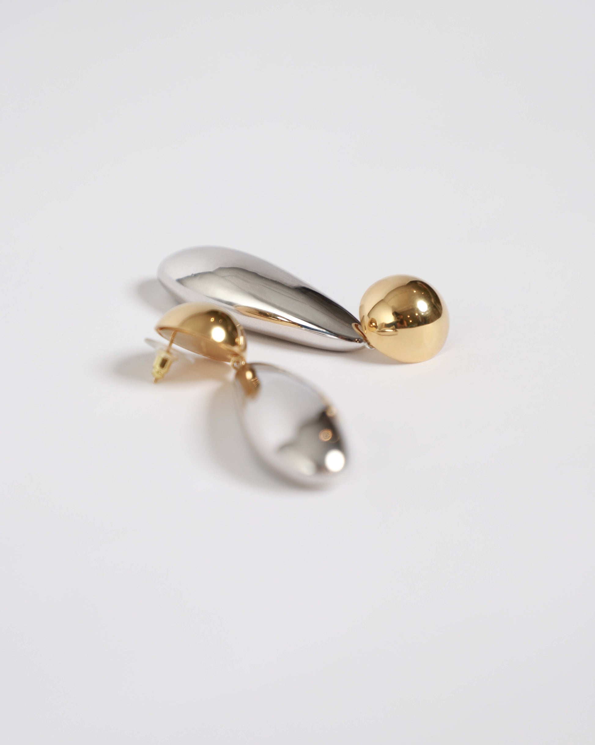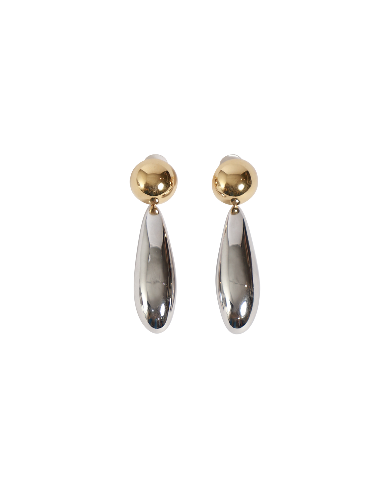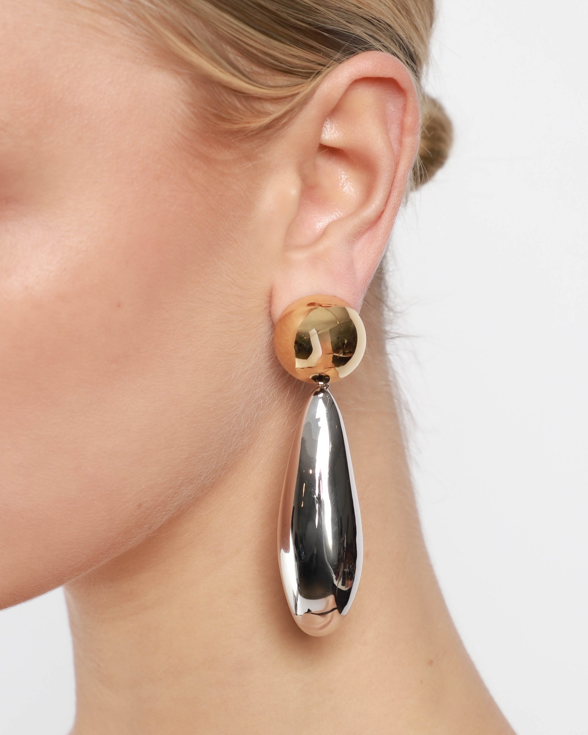 This mixed-metal earring pairs a gold domed circle with a silver, textured cylinder, creating an elongating effect on the décolletage and making a bold statement on its own.