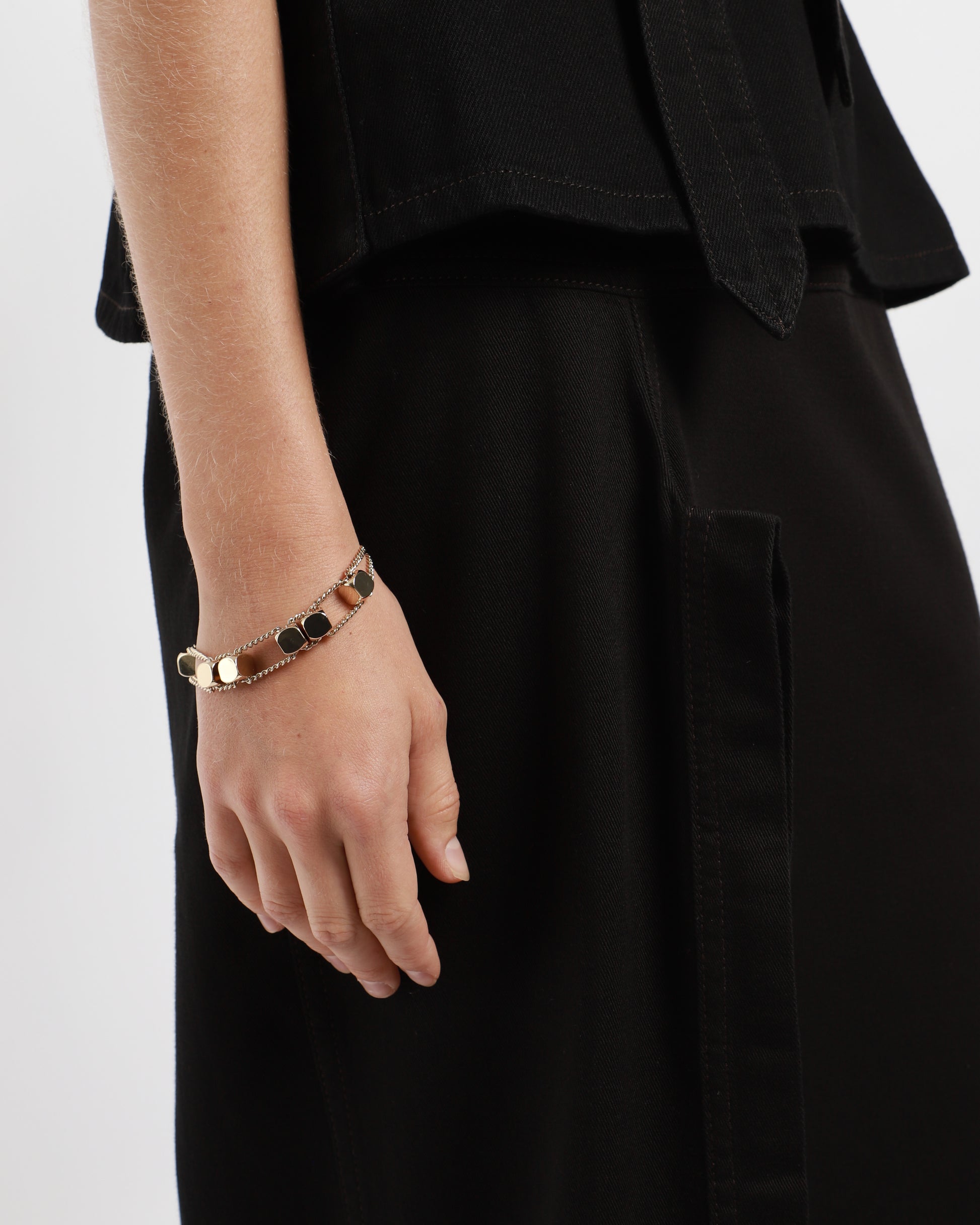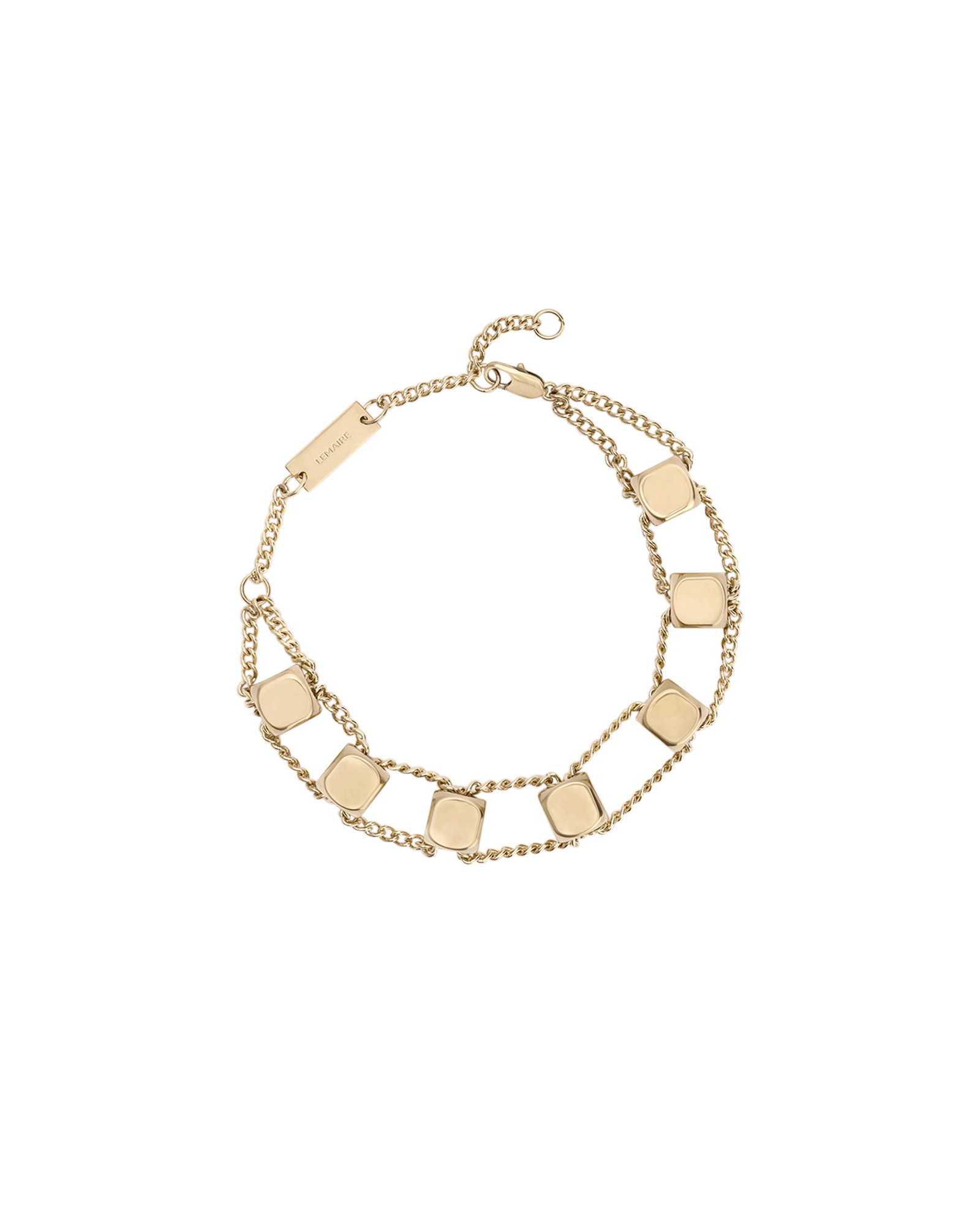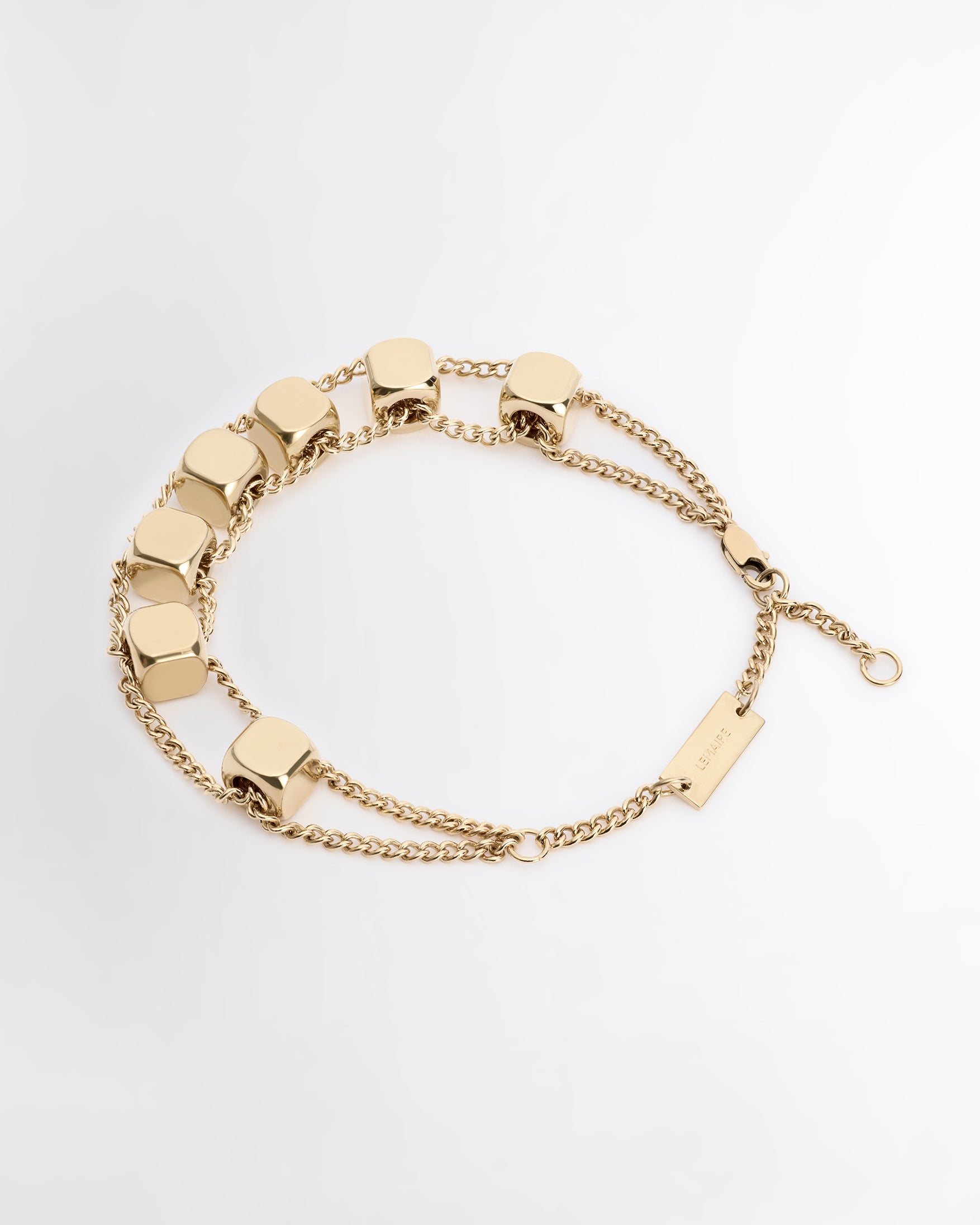 This Abacus Bracelet is crafted in brass with a shiny gold finish. It is constructed with a single rank of cubic golden beads, reflecting the light while adding shine to the every day vestiaire.