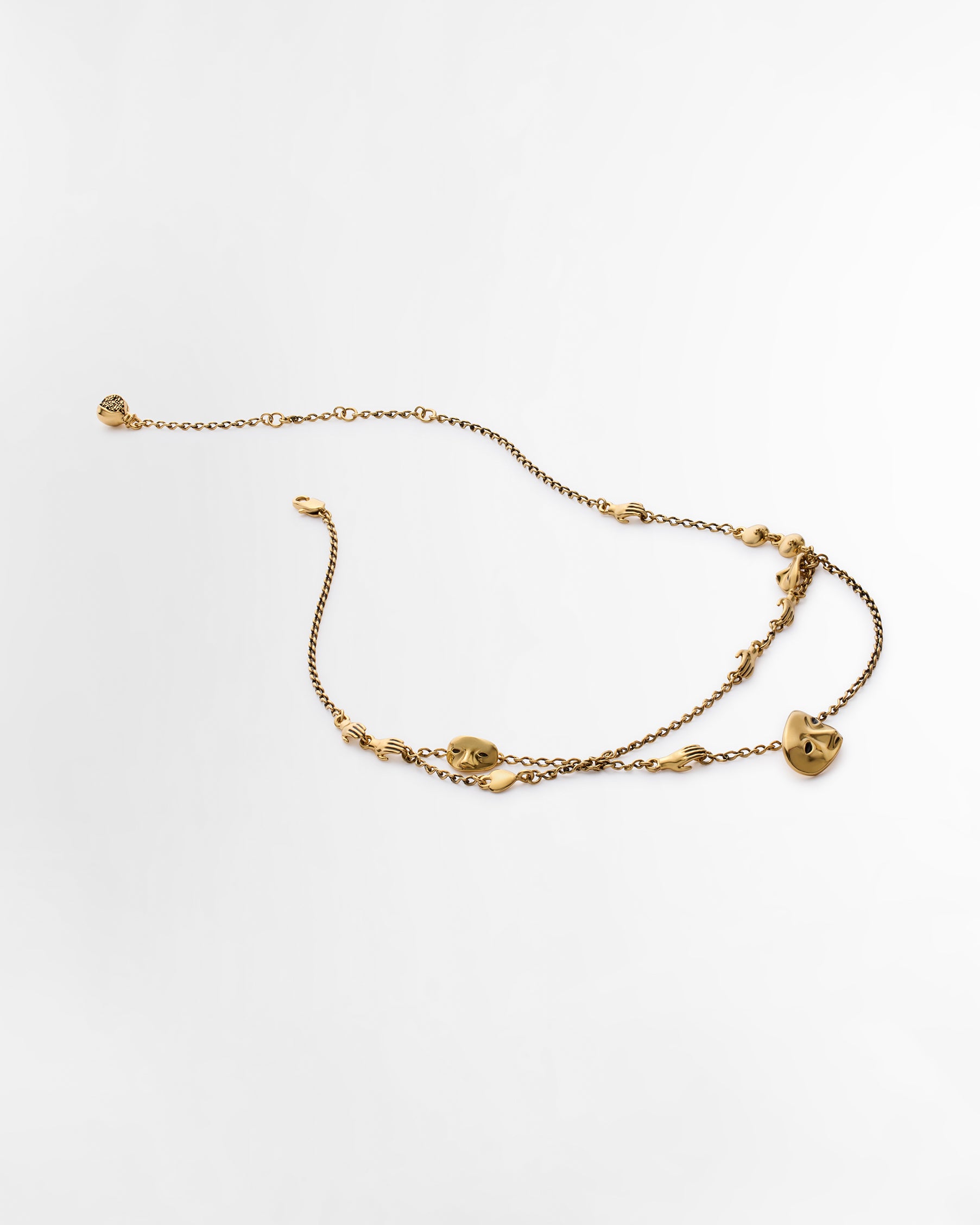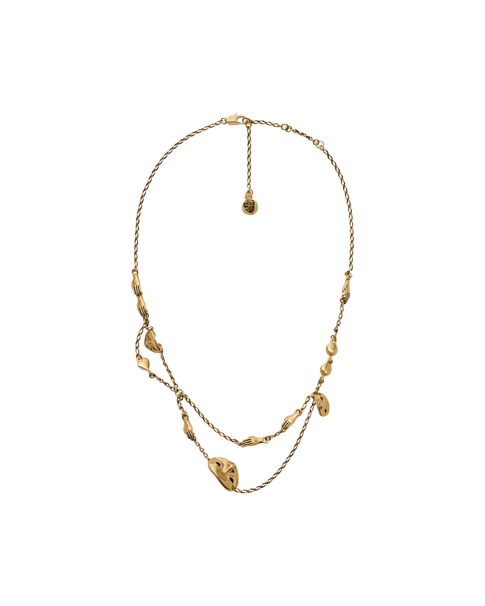 The Estampe necklace is made of brass with an antique gold finish. Delicate figurative charms representing a mask, hands, a grenada and a heart are articulated on fine, open-plaited chains that fall in rows around the neckline. Made in Portugal.