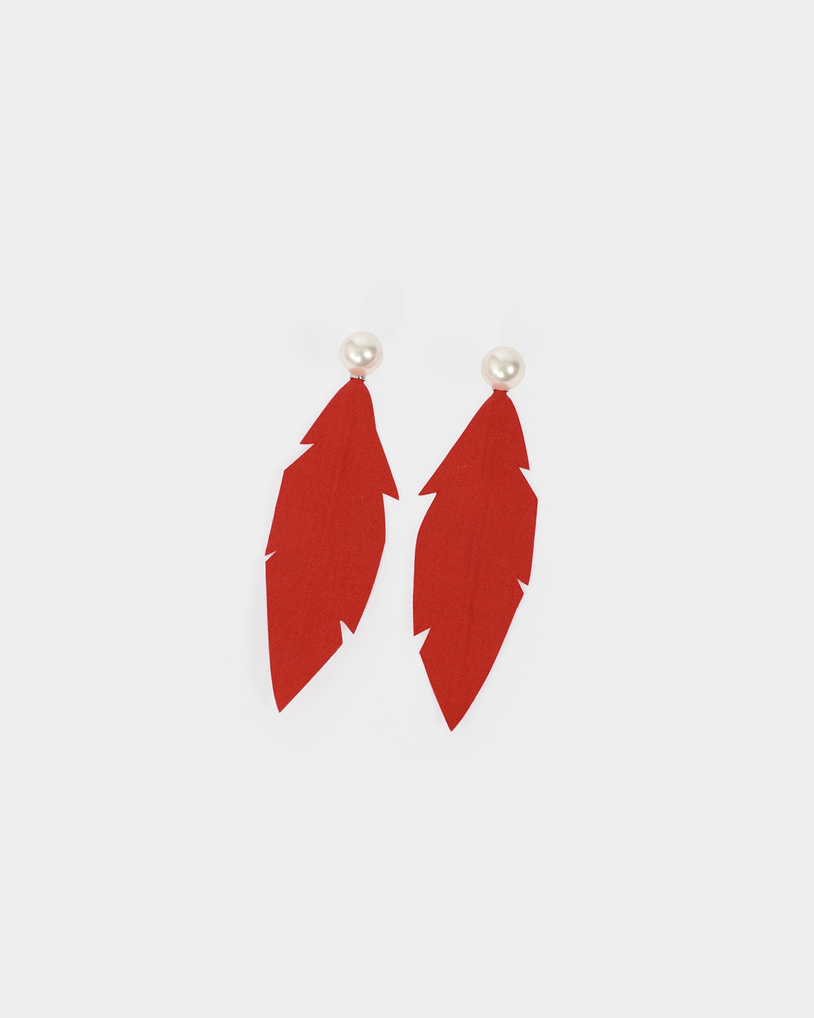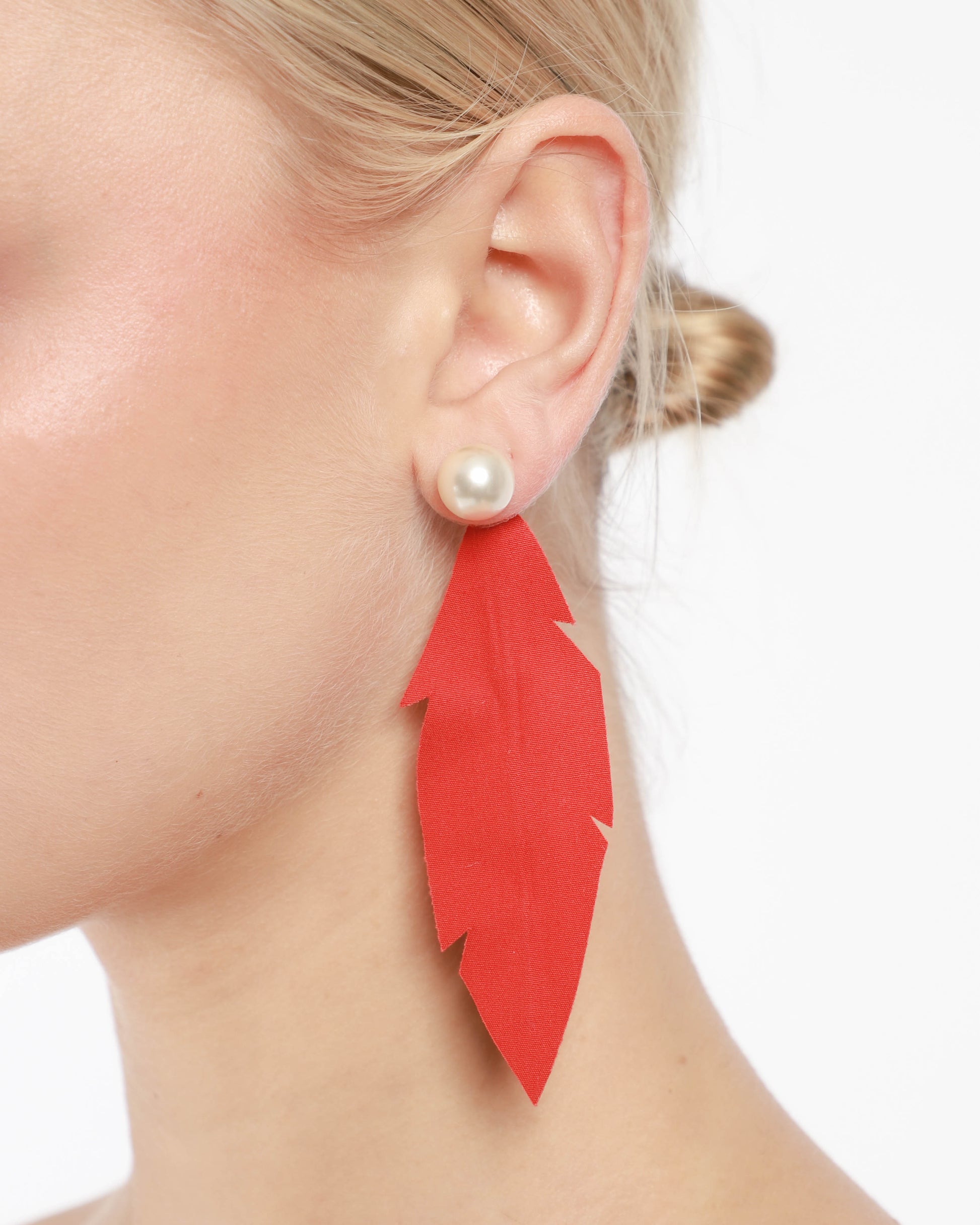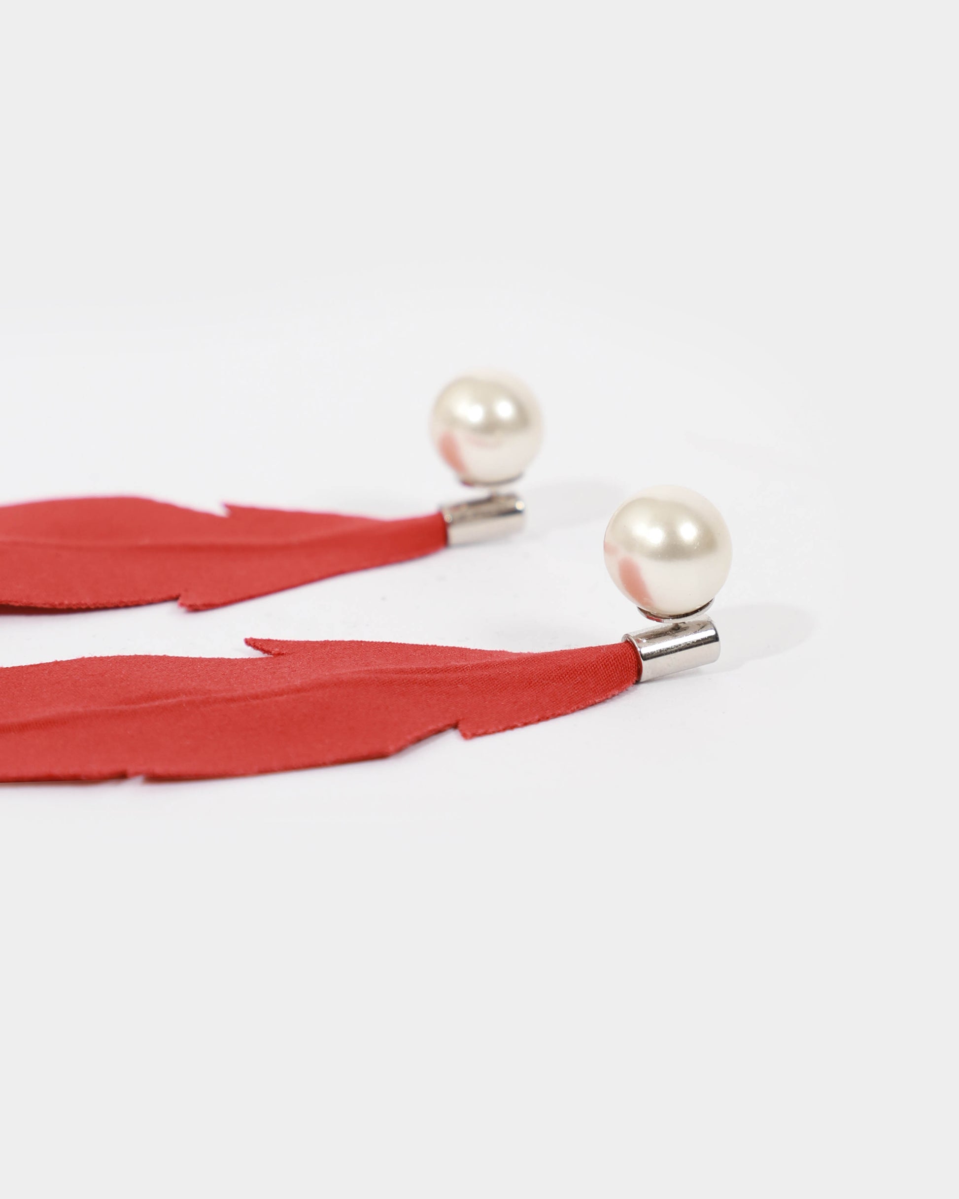 These earrings feature a fabric feather shaped, attached with a front pearl detail and stud closure. It has a rigid curved silhouette. Made in Italy.