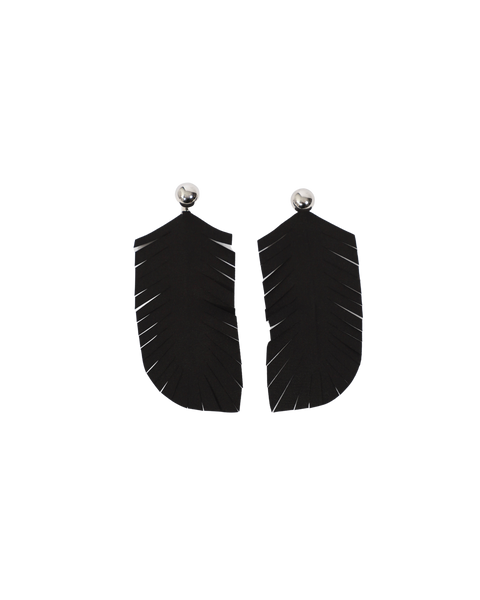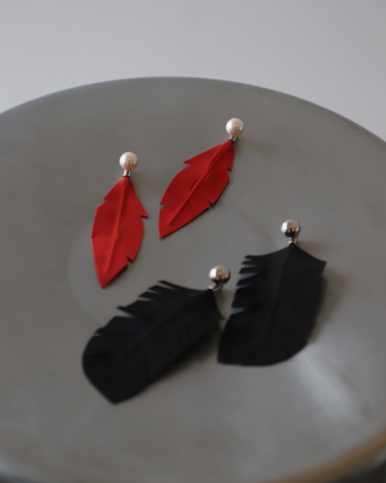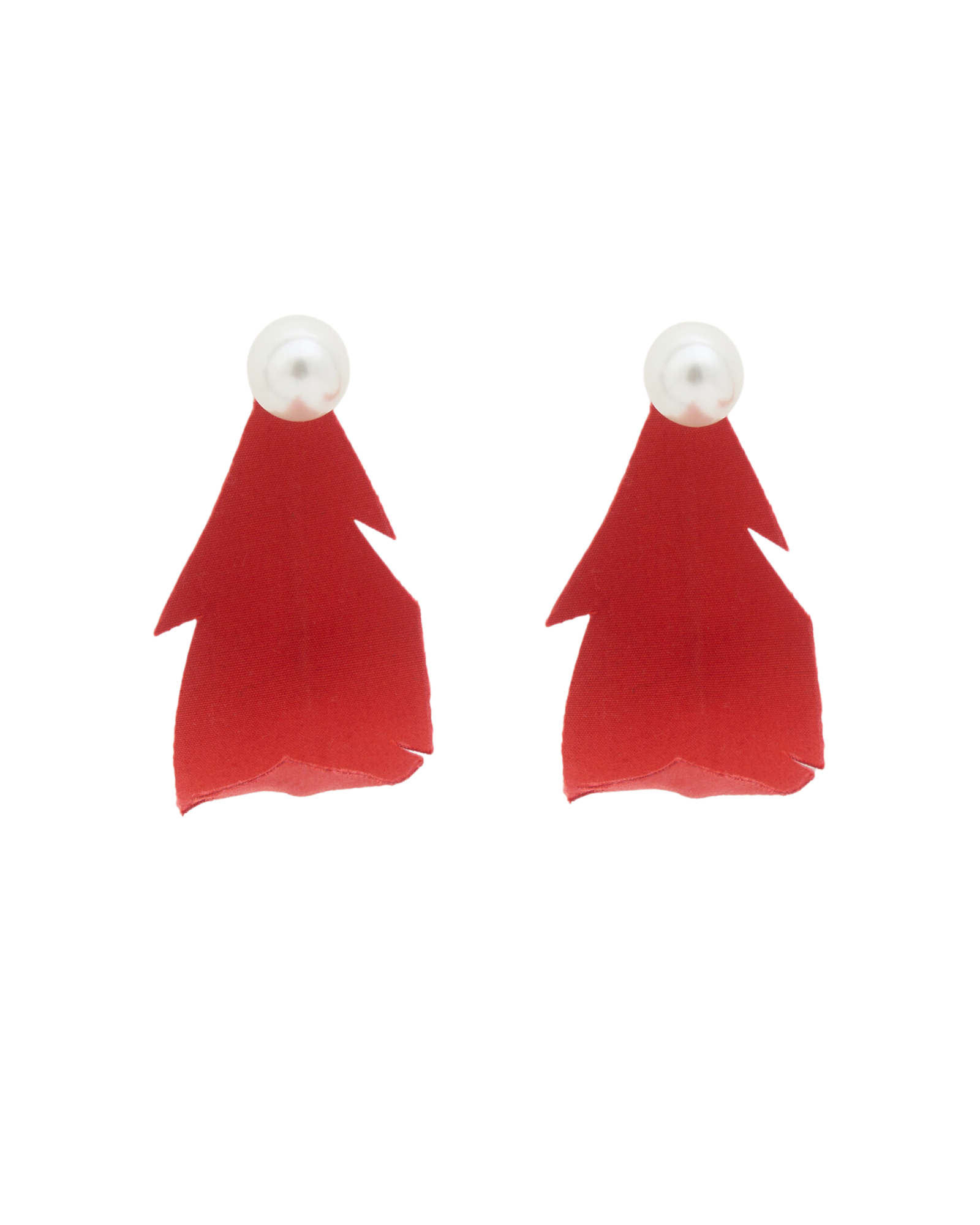 These earrings feature a fabric feather shaped, attached with a front pearl detail and stud closure. It has a rigid curved silhouette. Made in Italy.