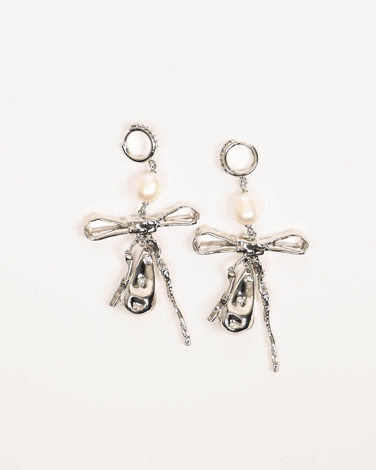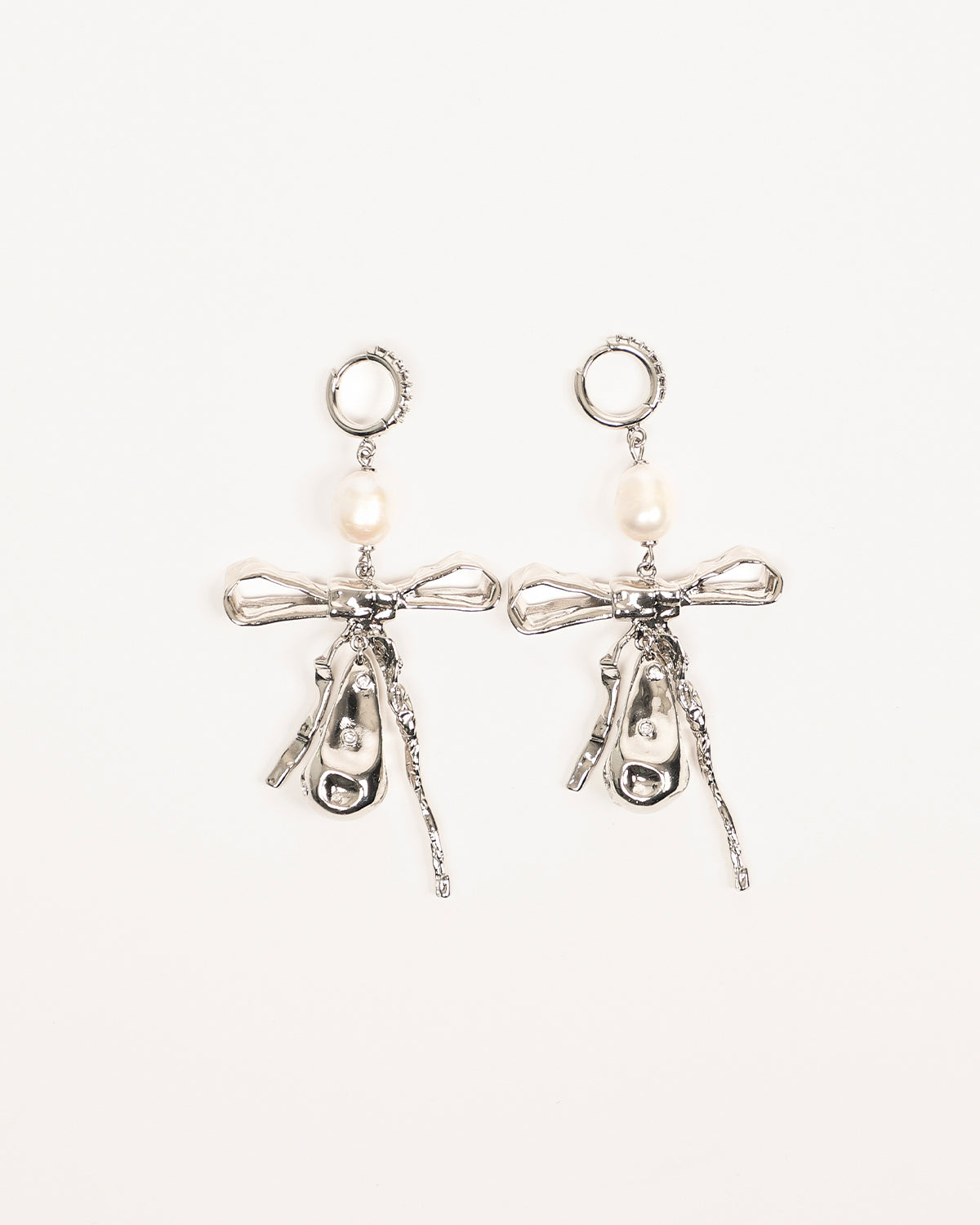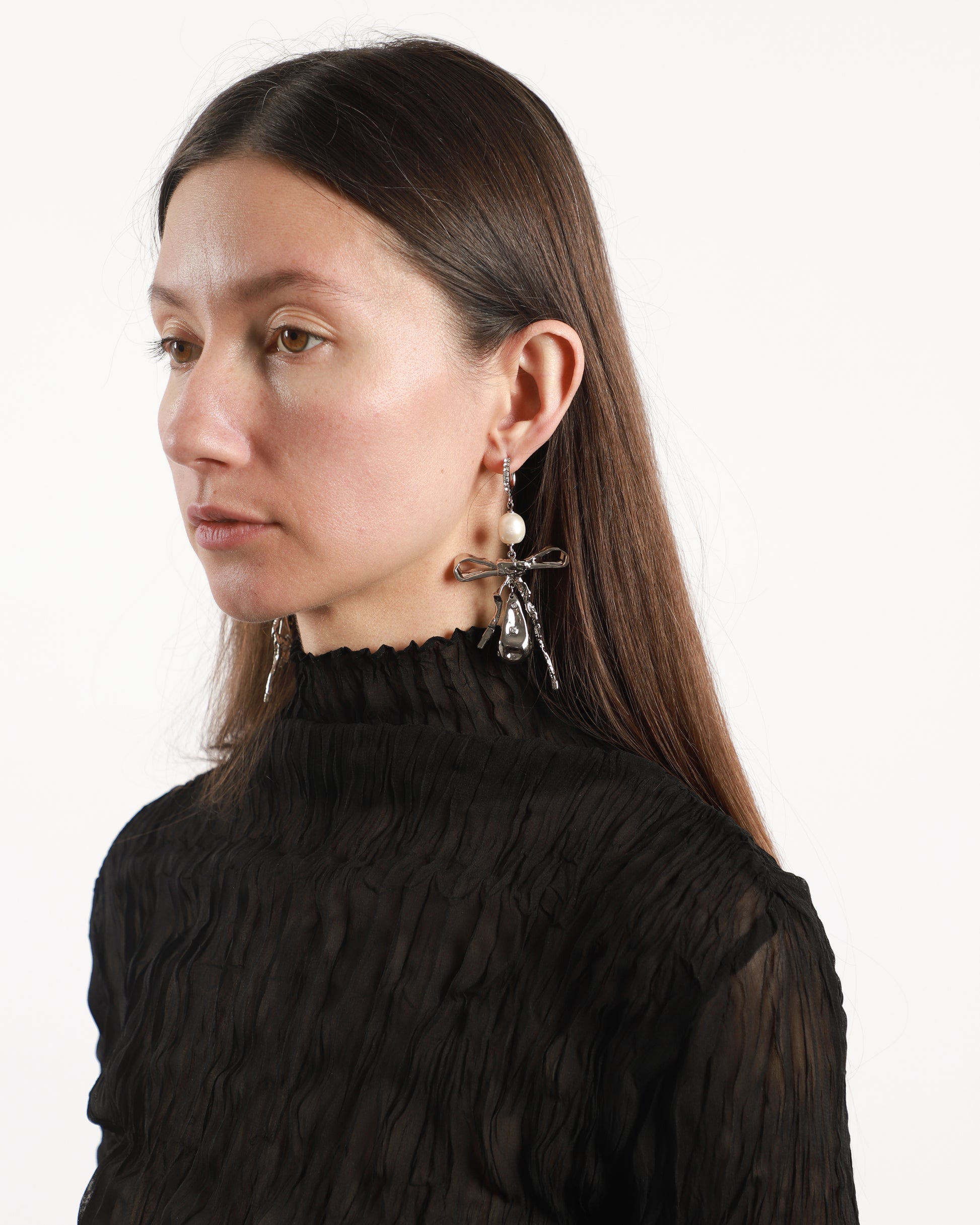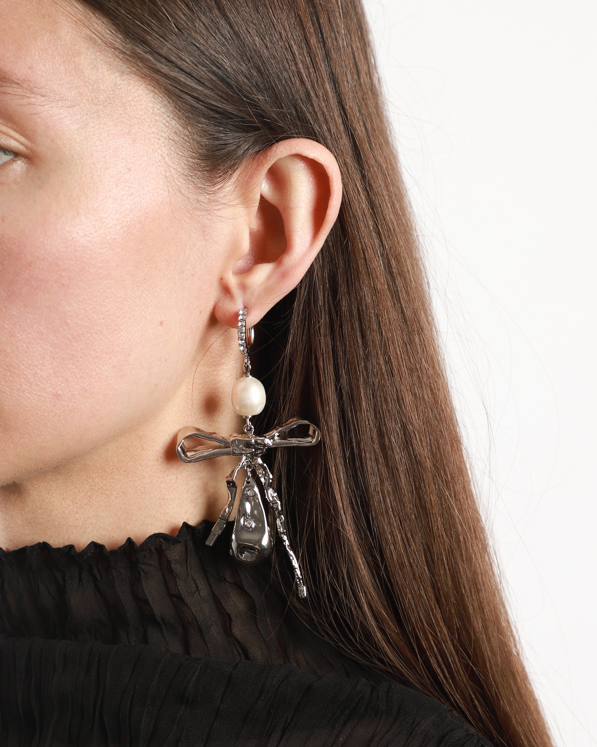 A signature blend of romance and edge, Marni's Pearl Bow Earrings offer sculptural elegance with a modern twist. Cast in palladium-finished brass, the delicate bow silhouette is embellished with luminous faux pearls and finished with a sparkling rhinestone-closure detail, adding subtle shine and texture.