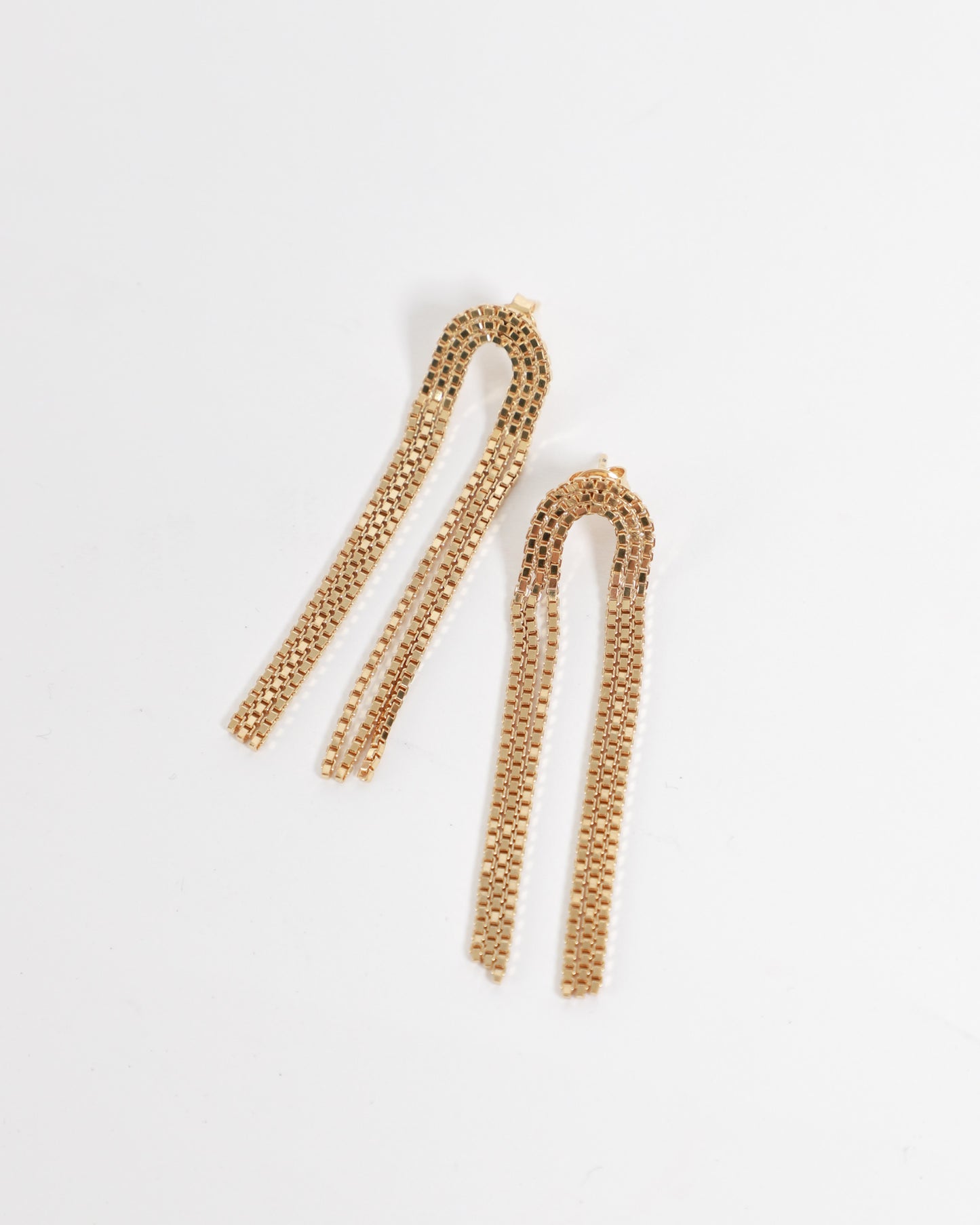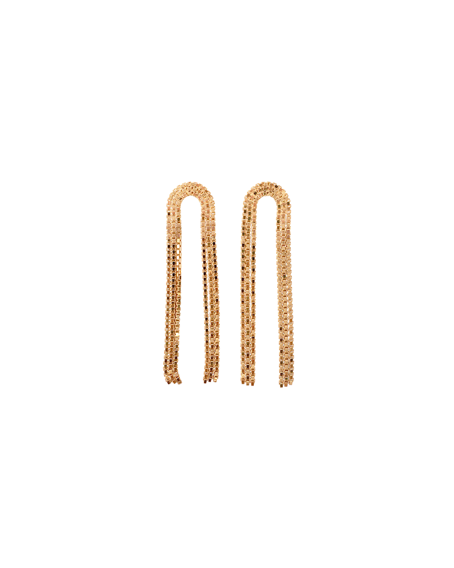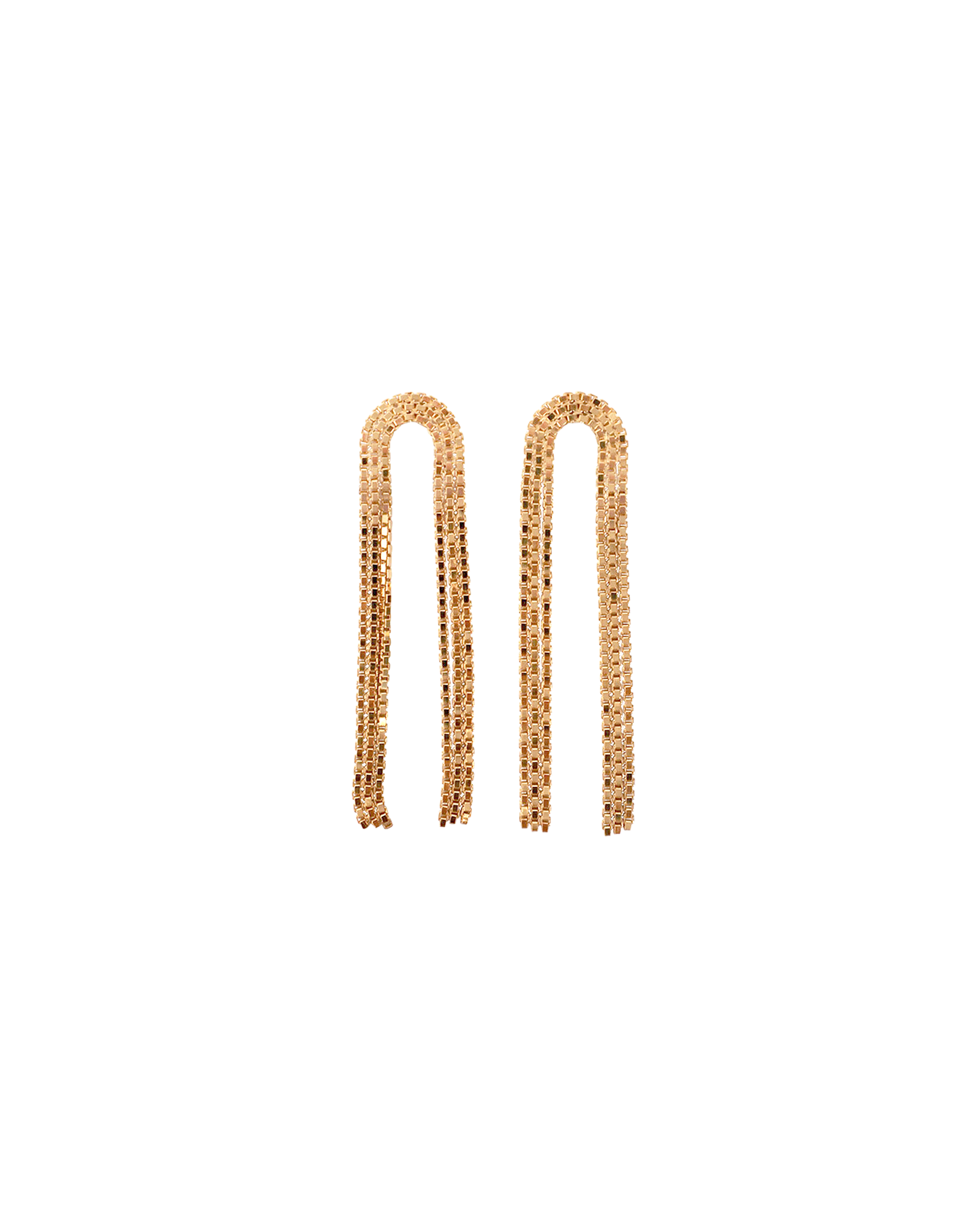 The Arcade Short Earrings by Martine Viergever are handcrafted in the Netherlands from 925 sterling silver, finished with a brass plating. Featuring an elegant cascade of box chains, they fasten securely with a post-back closure and are sold as a pair.