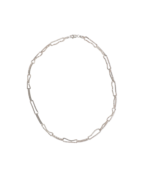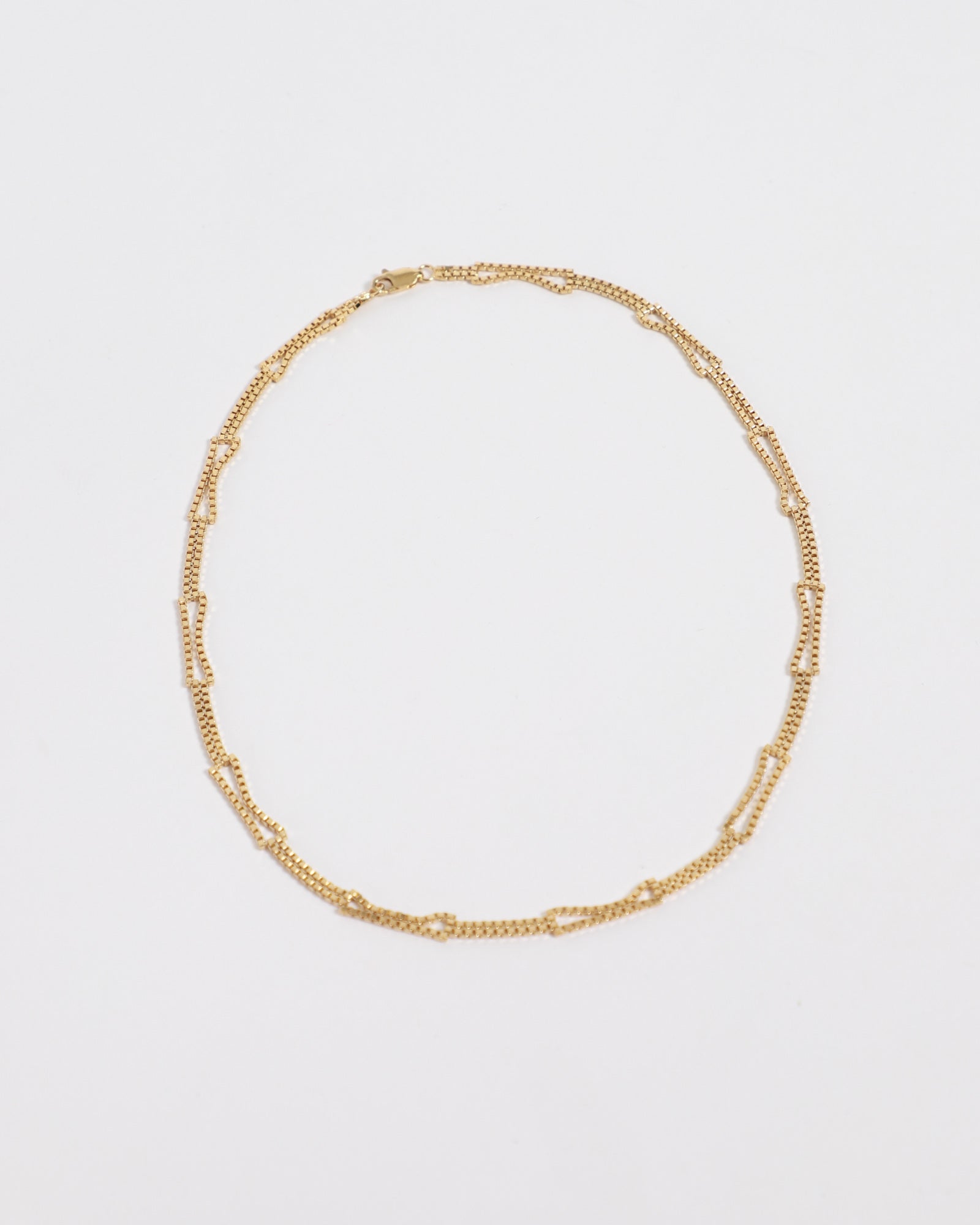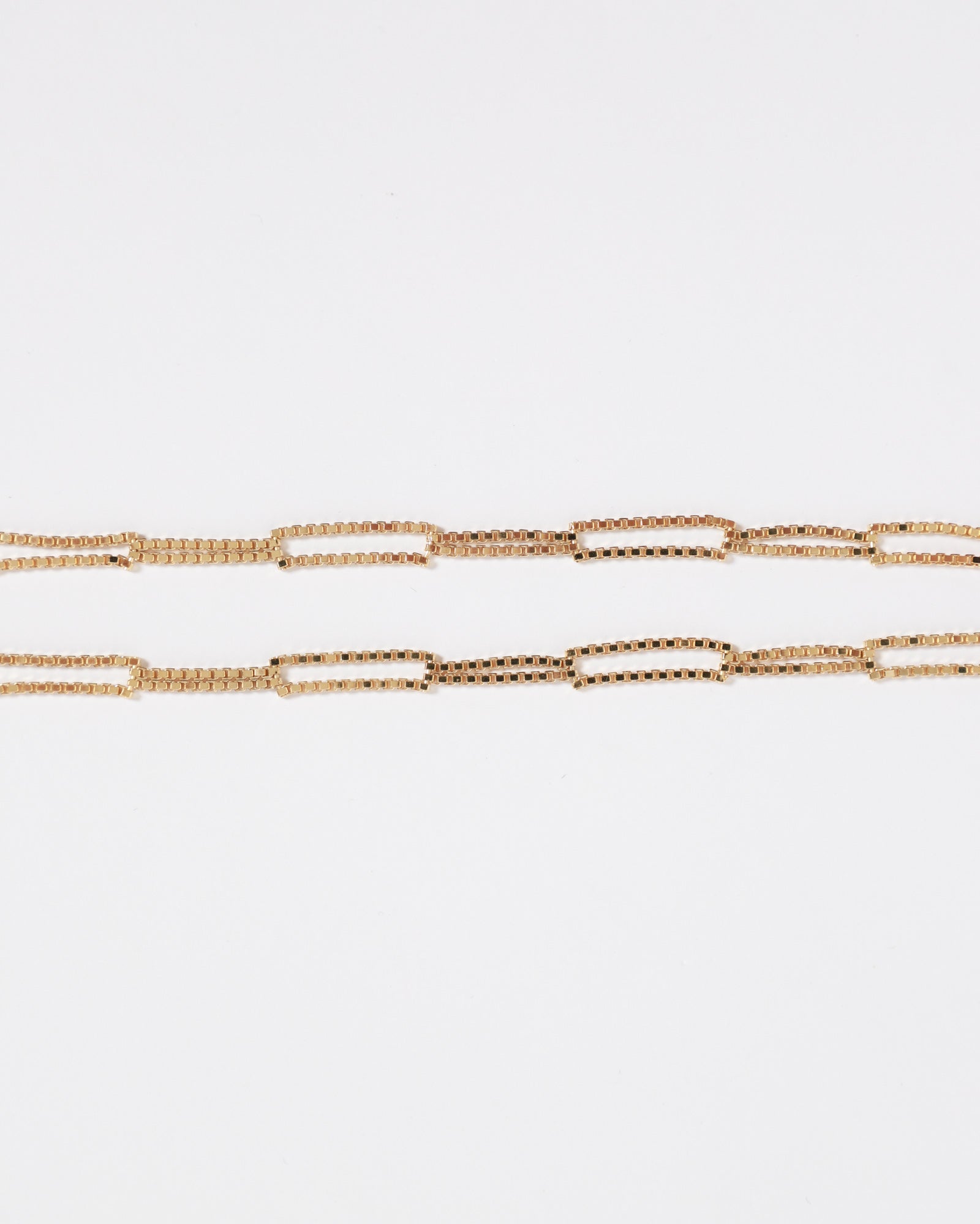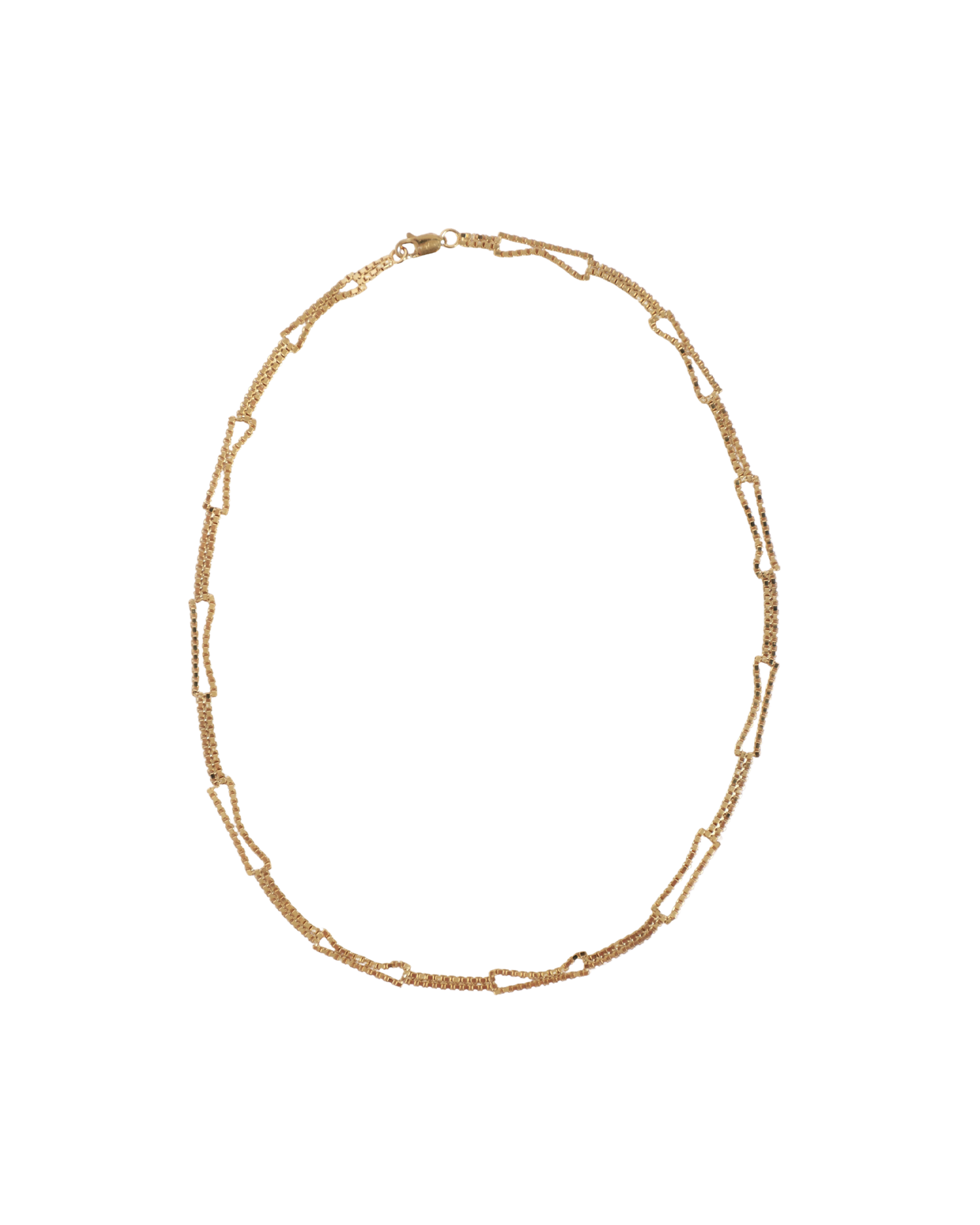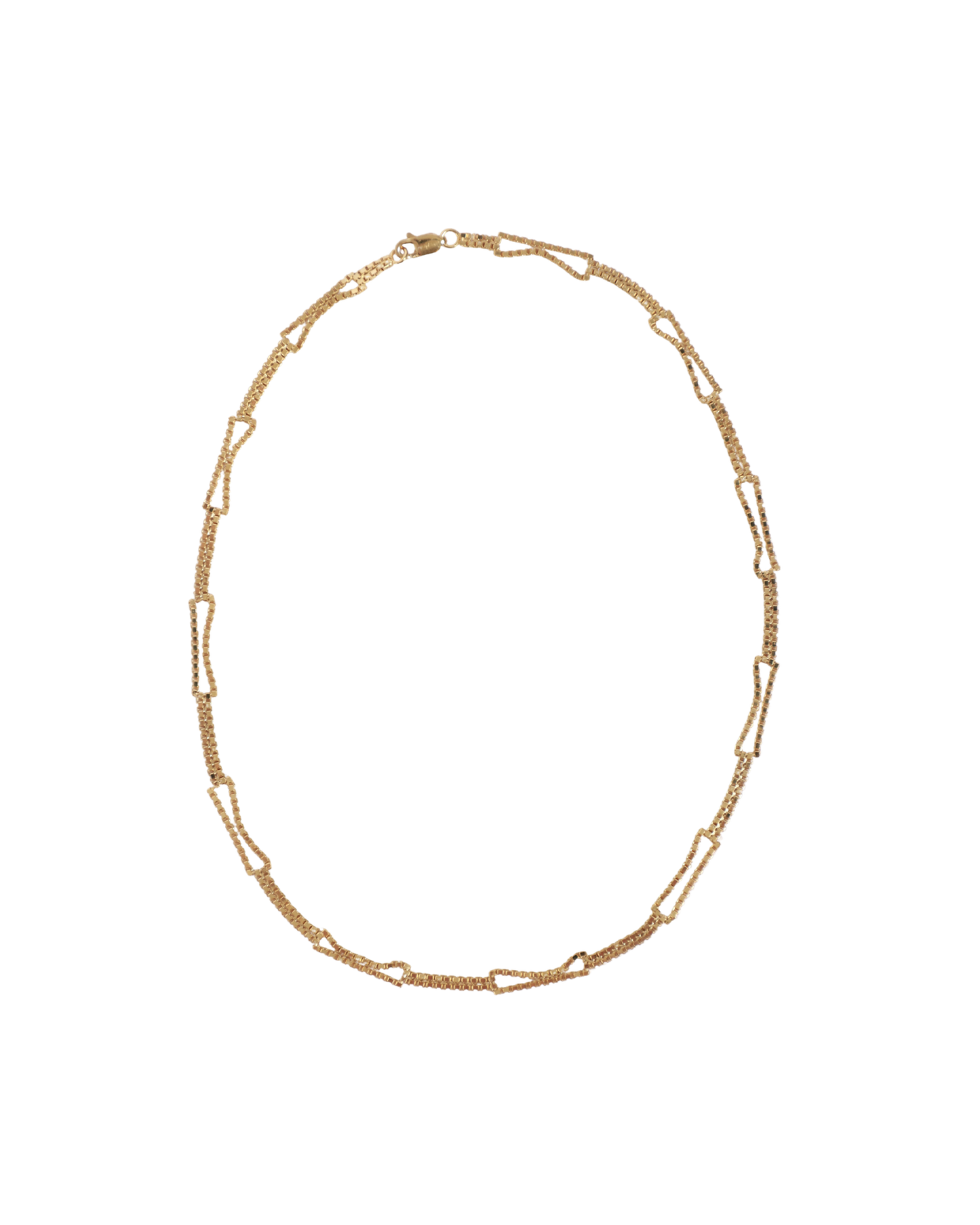 The Be Square Necklace by Martine Viergever is handcrafted in the Netherlands from 925 sterling silver, finished with a brass plating. It features an elegant cascade of box chains, it fastens securely at the back with a sleek lobster clasp closure.