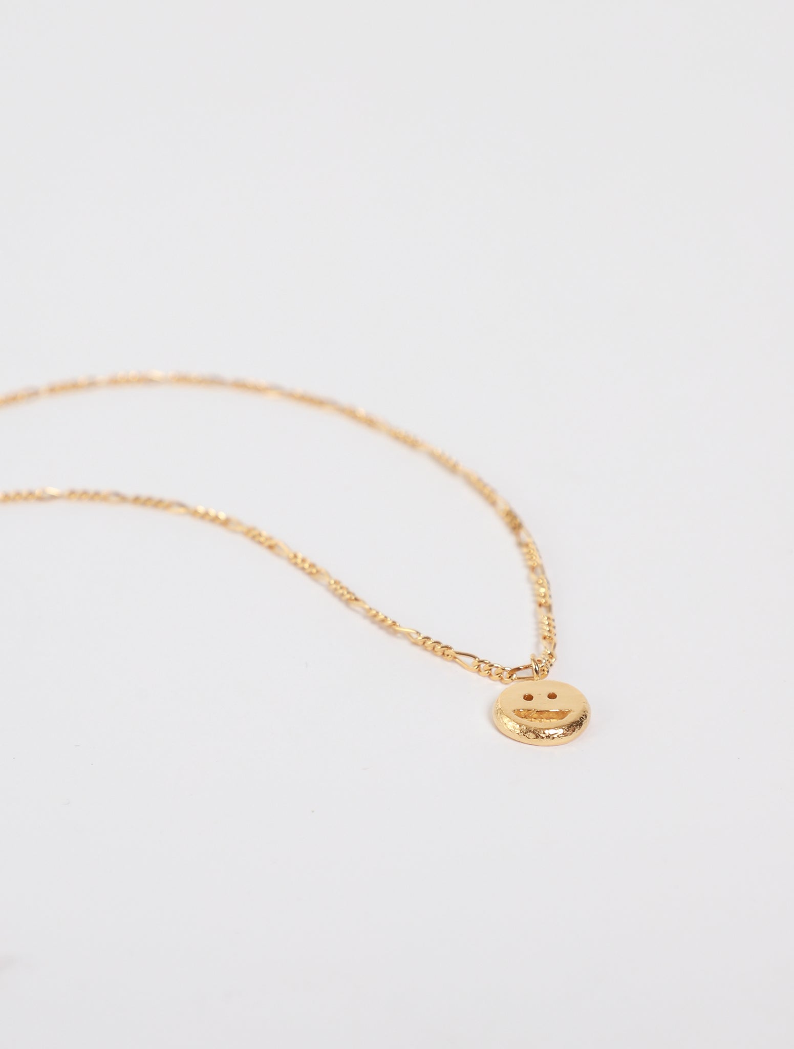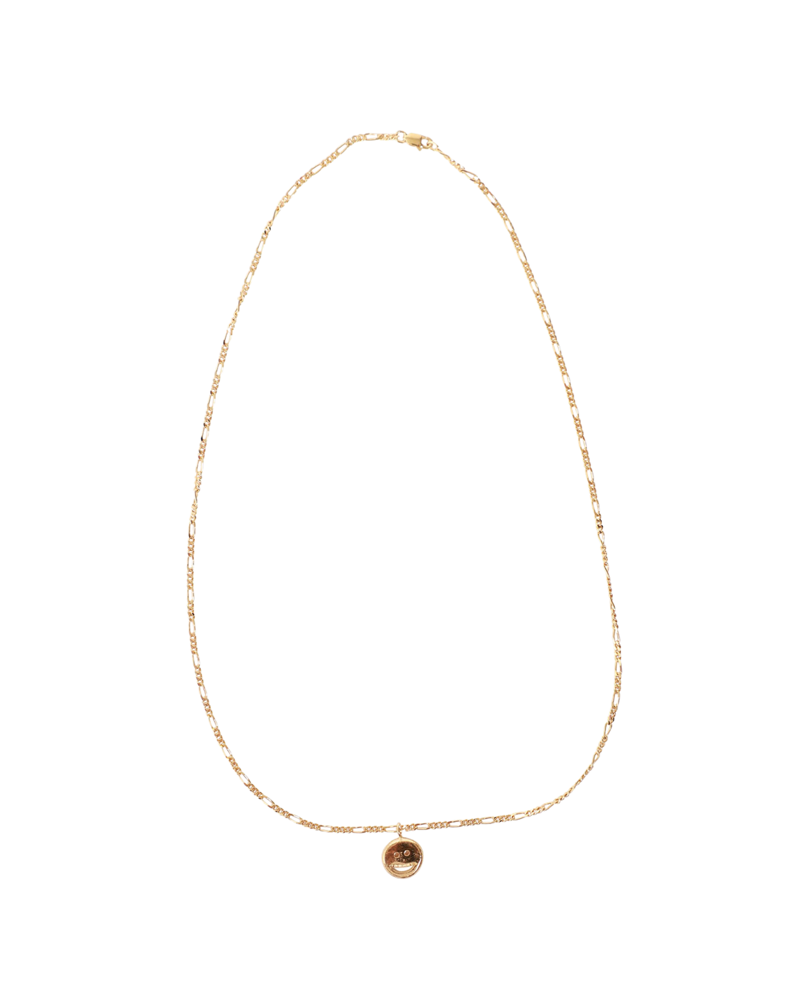 The Grin Necklace by Martine Viergever is handcrafted in the Netherlands from 925 sterling silver with a polished brass plating. It features a playful appliqué suspended on a classic Figaro chain.