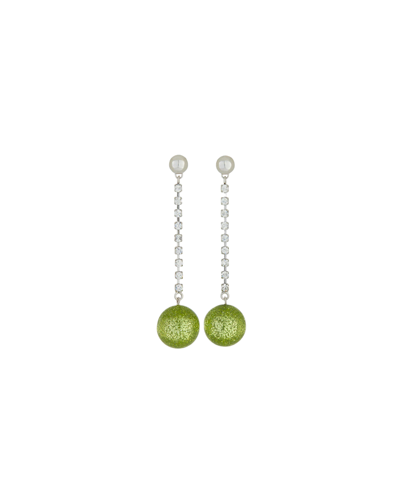 Lounge earring from Mondo Mondo featuring a dangling rhinestone chain affixed to a silver post and adorned with a glitter ball.