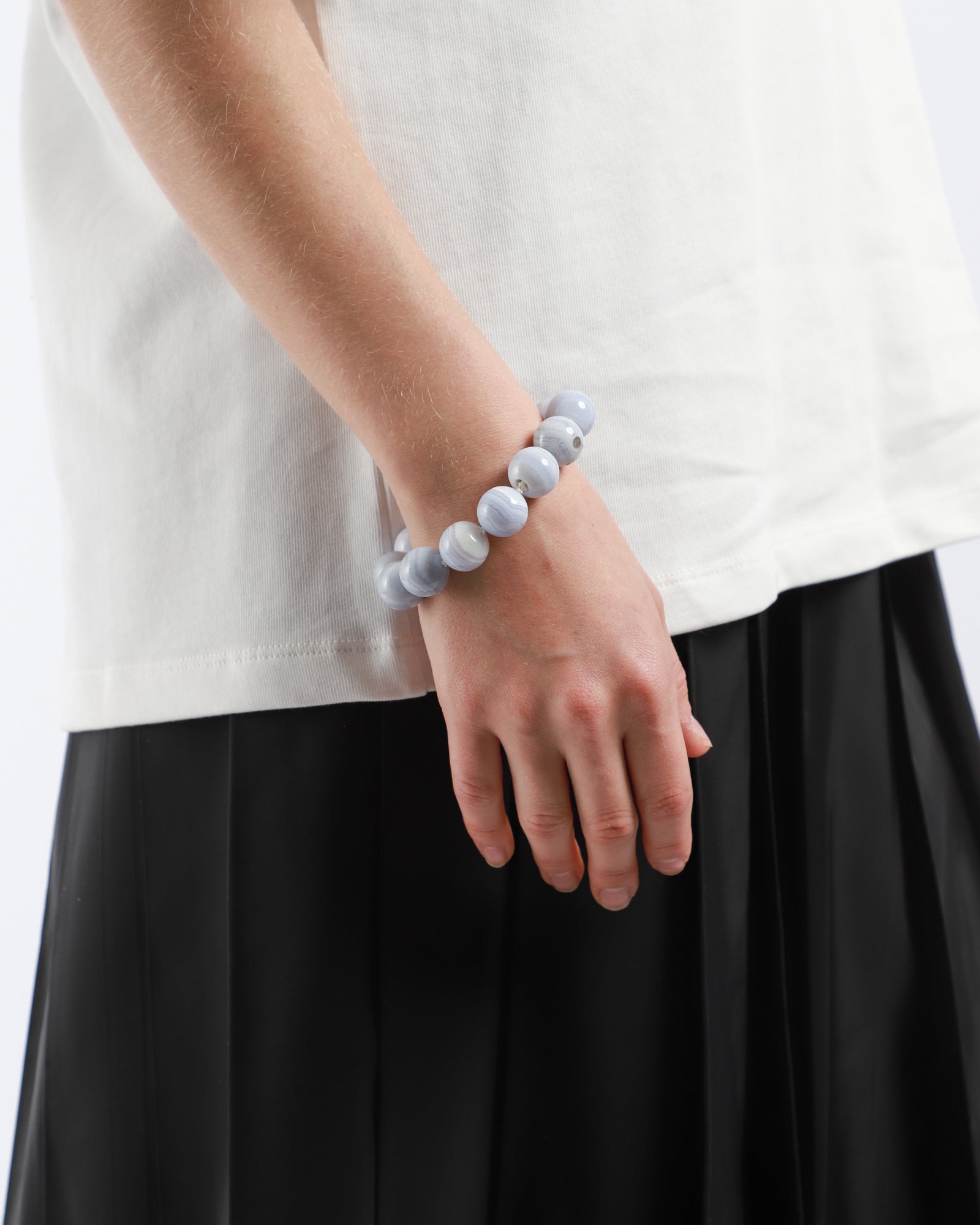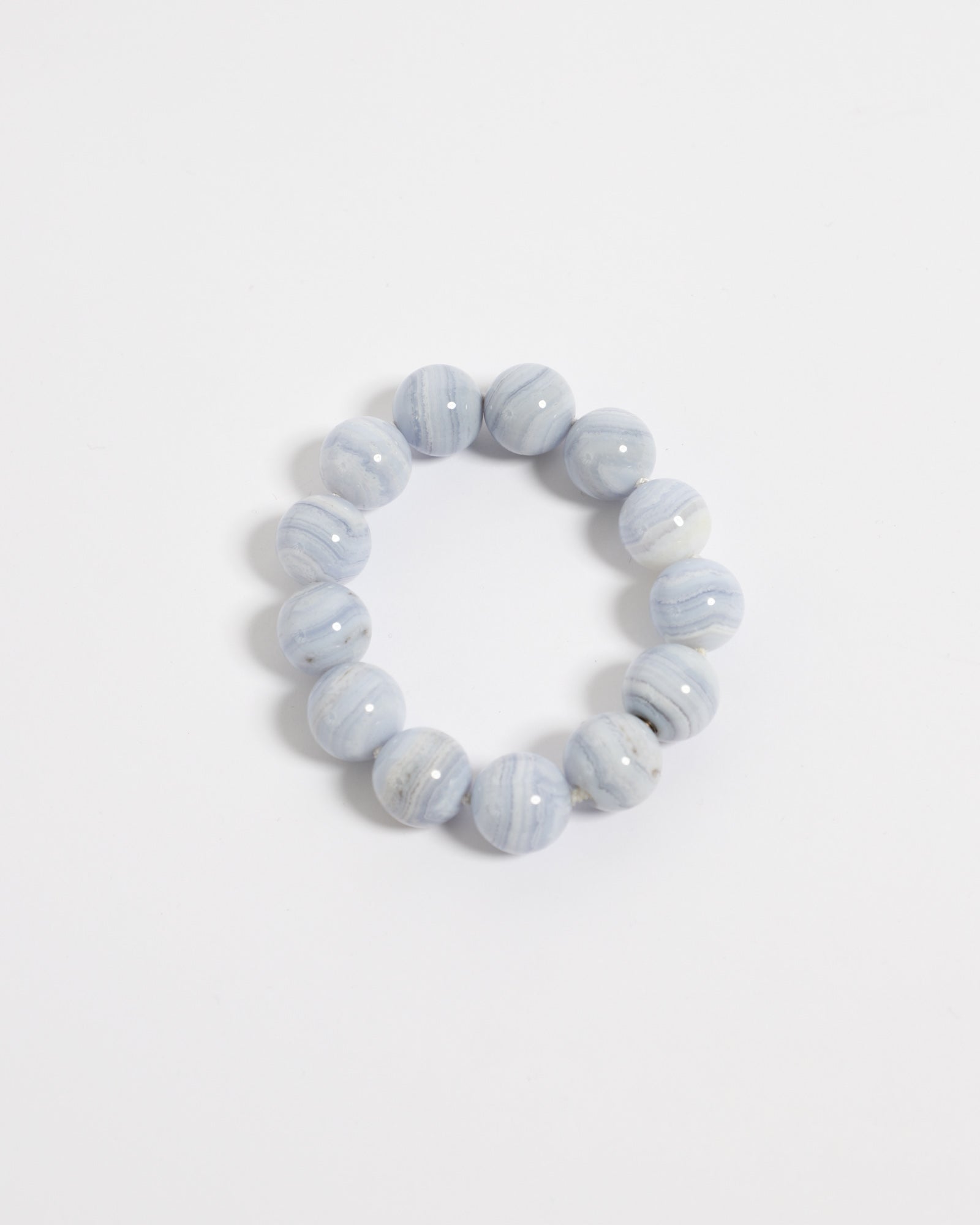 A beaded bangle with polished chalcedony spheres that are in various shades of blue. Please note crystals may vary slightly in colour and shape due to stones being natural.