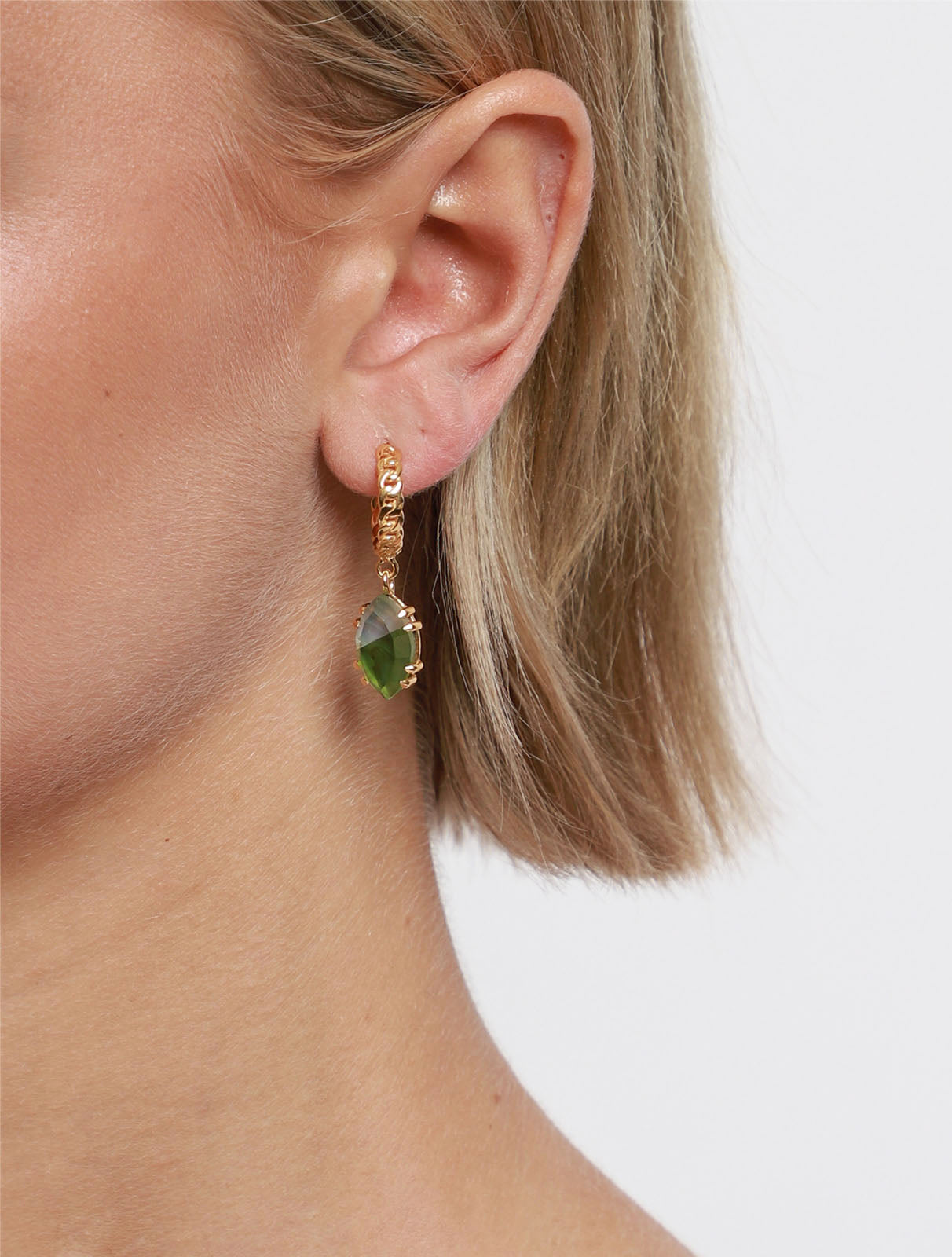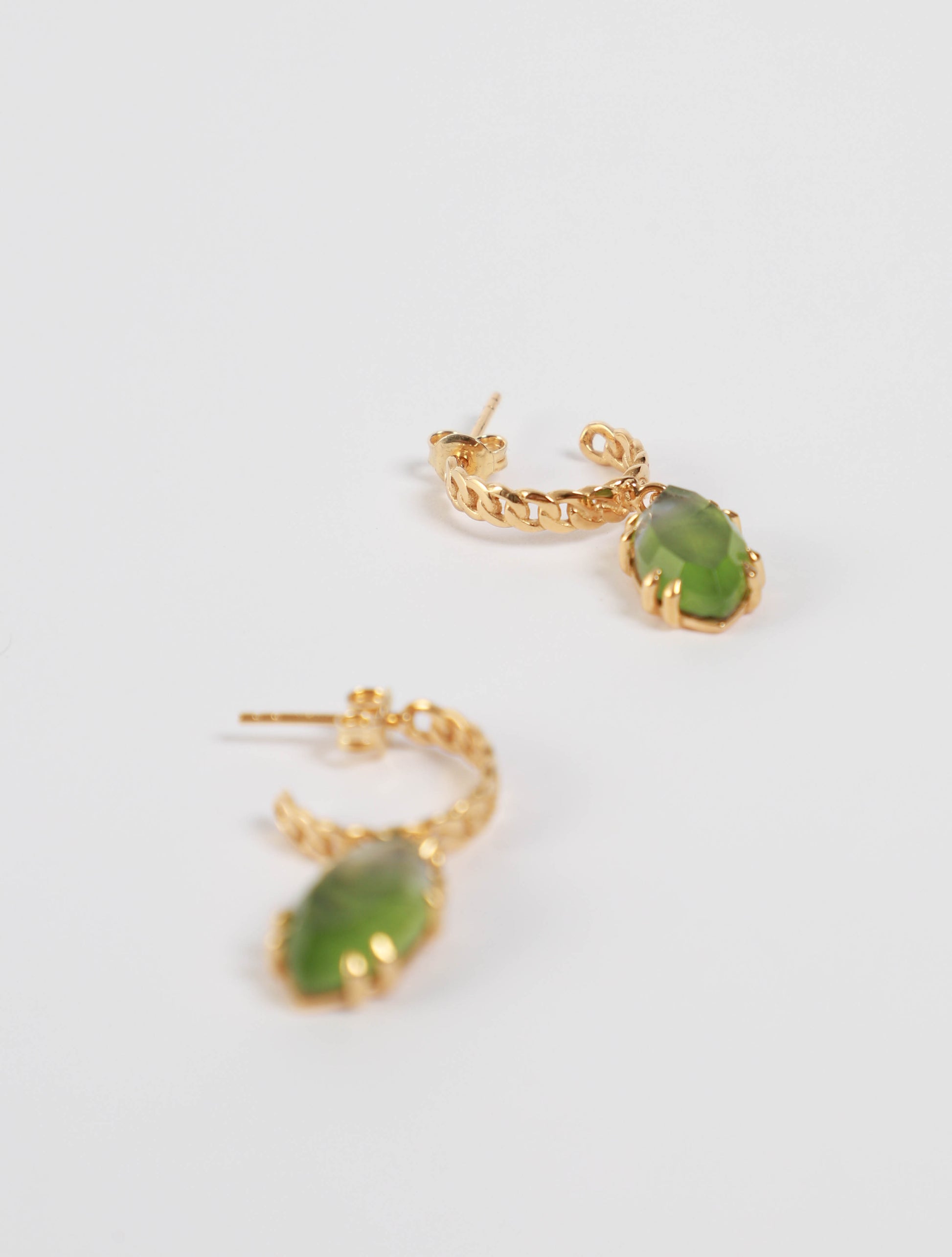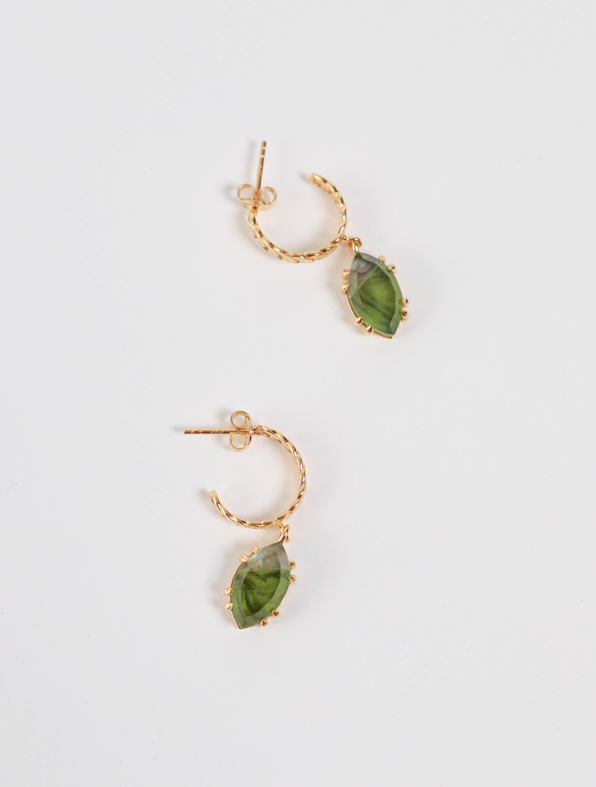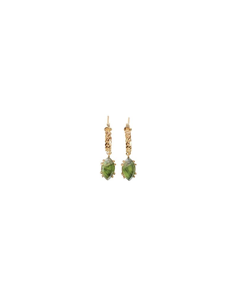 Panconesi Ascolto Hoops, featuring detail breaded style hoop, Mother of Pearl and glass Crystal attached in an oval shape, vintage look. Can be paired nicely with the matching Ascolto Famiglia necklace.