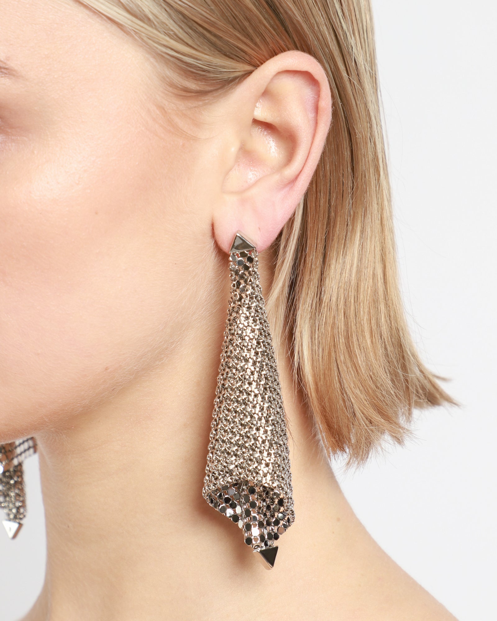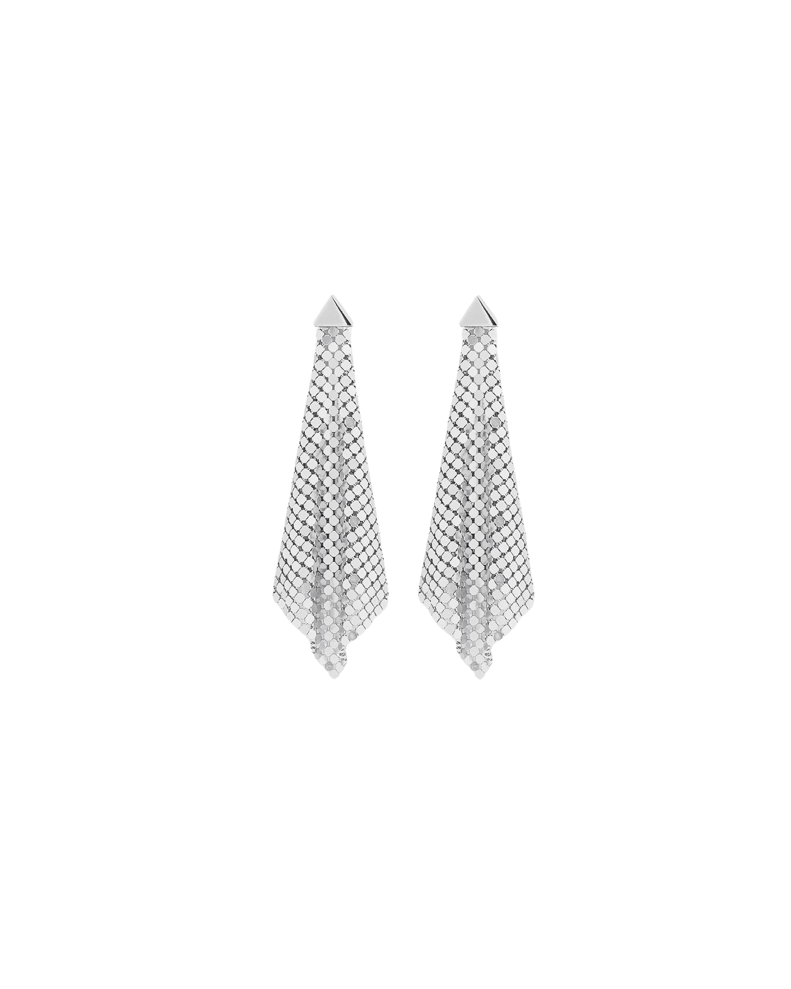 Rabanne's Pixel Flow Earrings are constructed from mesh forming a diamond shape that falls into an elegant drape. These drop earrings are soft, flexible and light.