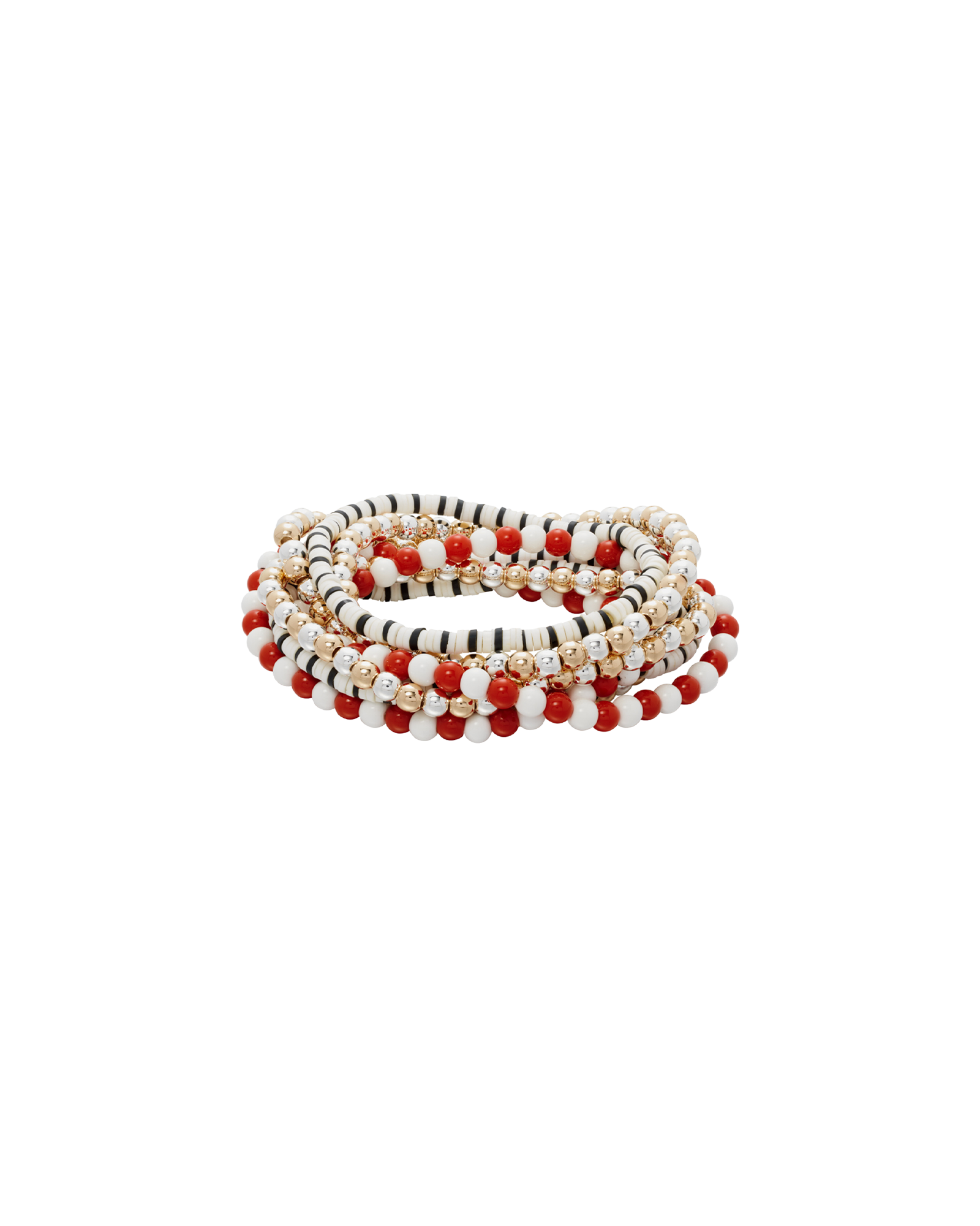 This set of nine bracelets is strung with an array of enamel, gold, and silver-tone beads. They have a flexible cord that makes them easy to slip on and off, and they offer the ability to mix and match