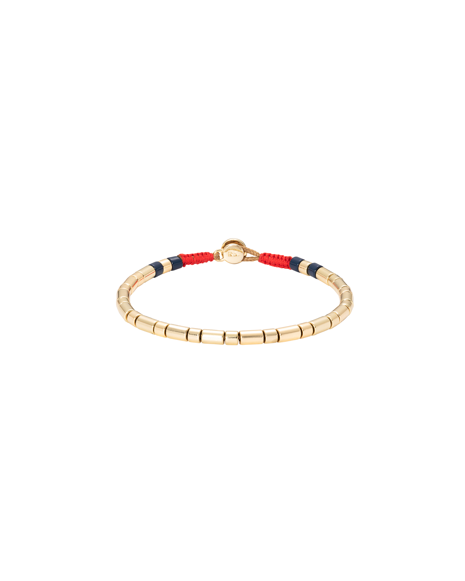 The Peacoat bracelet is strung with an array of gold-tone beads and is finished with a button fastening.